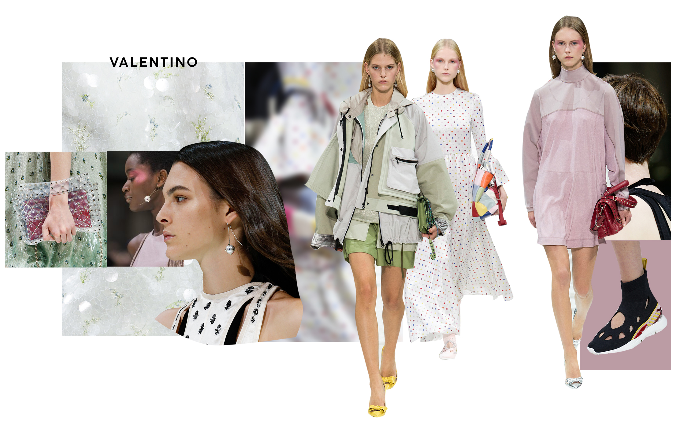 Пьерпаоло Пиччоли для Valentino украсил топы и платья крупными прозрачными блестками, словно рассыпал по ним осколки далеких звезд. Как он сам признается, источником вдохновения ему послужила история космического корабля «Аполлон».
