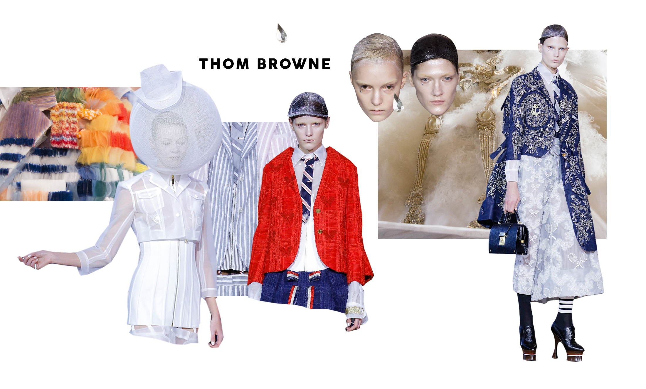Оторвавшись от реальности, на показе Thom Browne гости погрузились в мир причудливых грез дизайнера: похожие на хвосты русалок юбки, белые шары в сетку на головах моделей, вышитые якоря и ракушки на жакетах, кюлотах и пальто, фирменные полоски французского триколора и сумки-таксы. Показ завершился выходом сказочного единорога, который без особого труда покорил гостей, тут же оказавшись главным героем ленты Instagram.