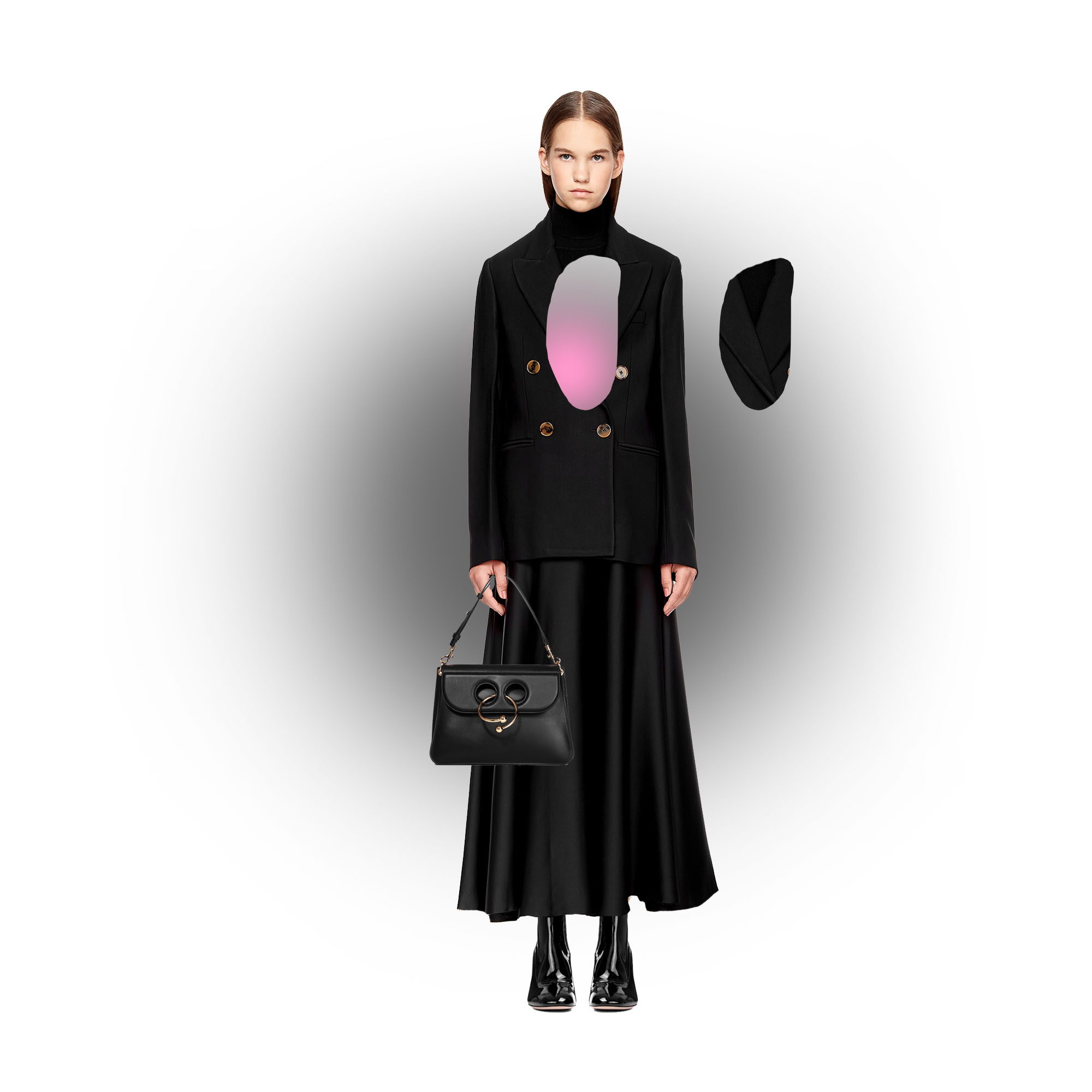 На модели: пиджак, шерстяное боди и юбка, все — KHAITE, лакированные сапожки Gucci, сумка J.W. Anderson