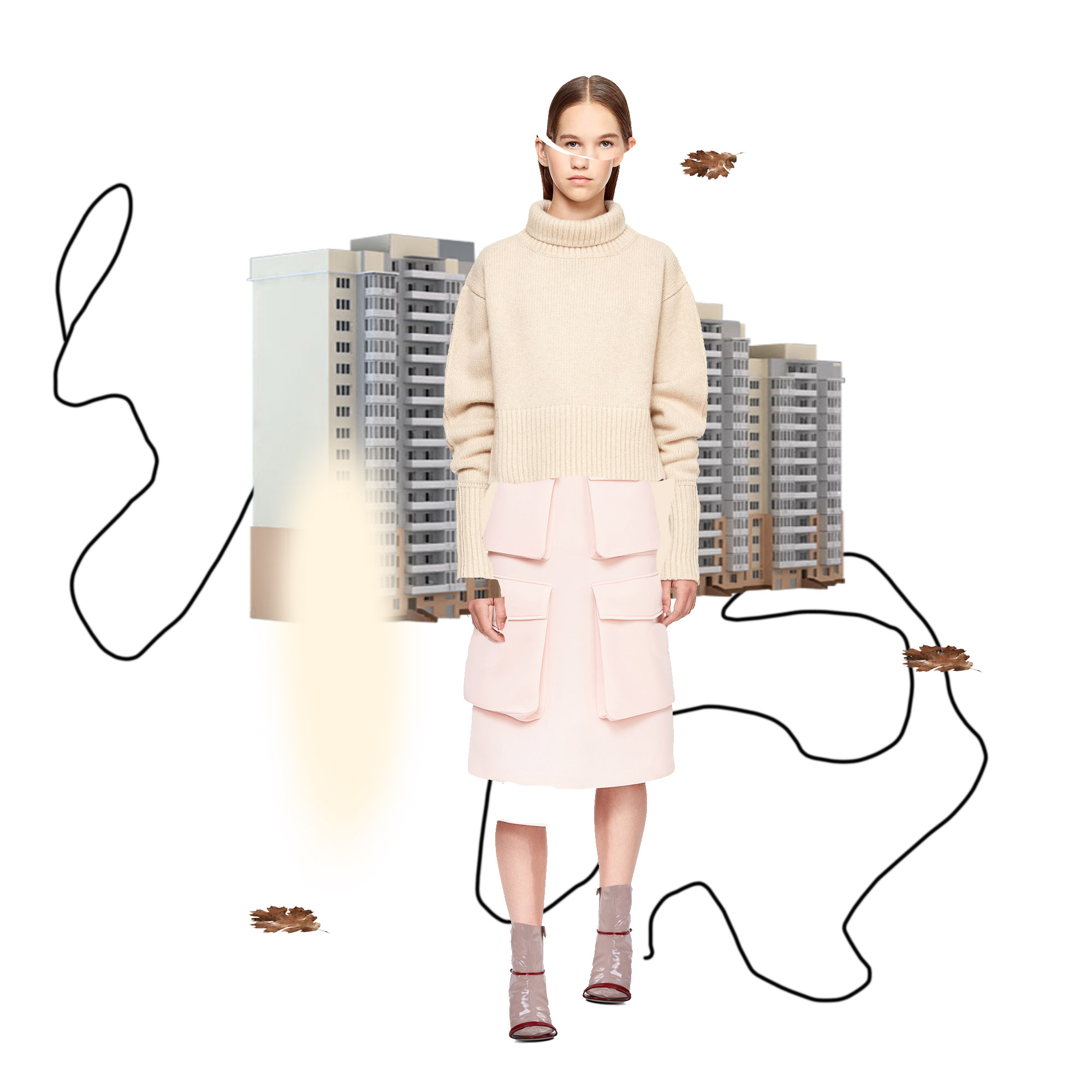 На модели: кашемировый свитер KHAITE, платье Simone Rocha, кожаные босоножки Gucci