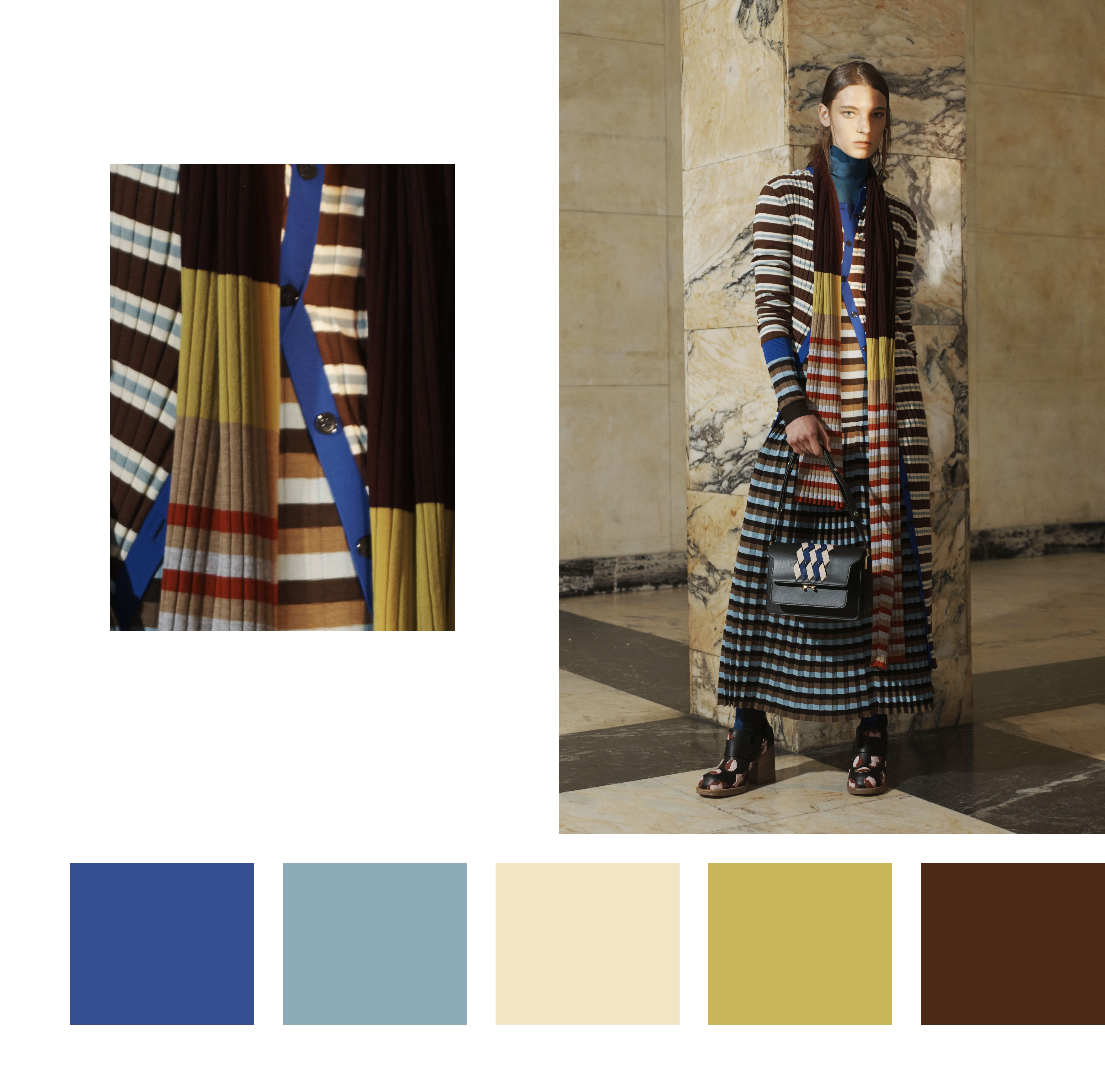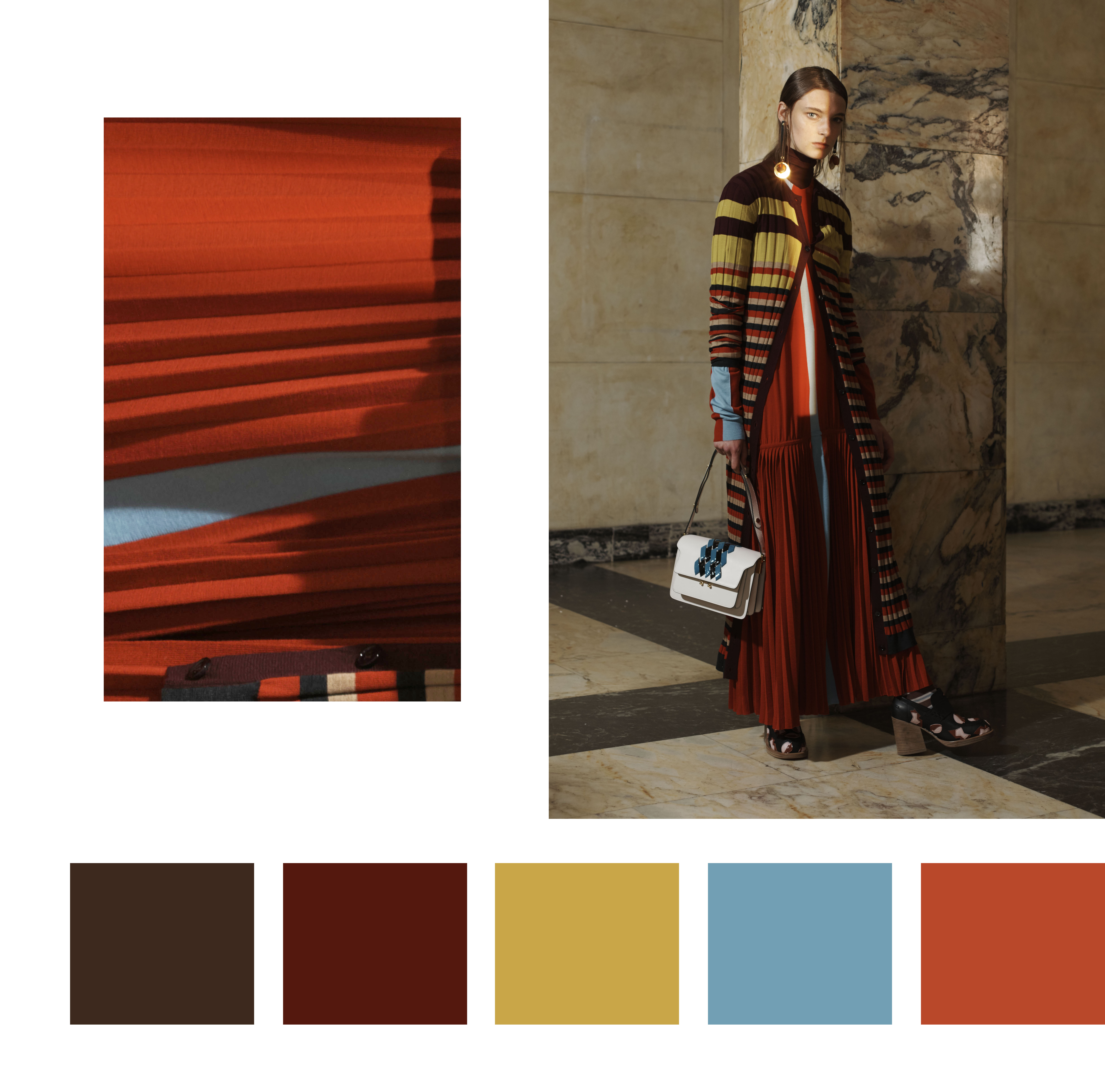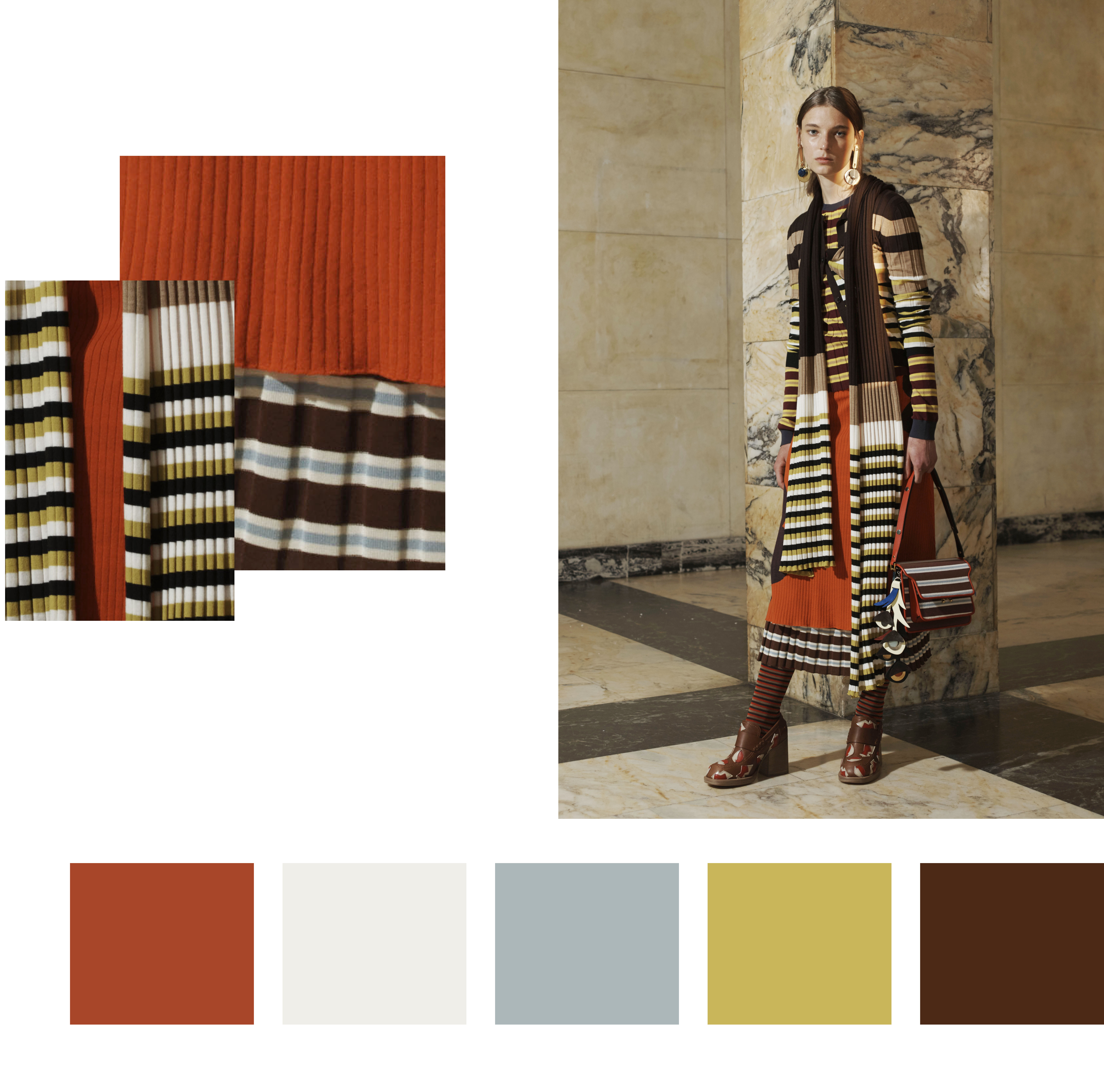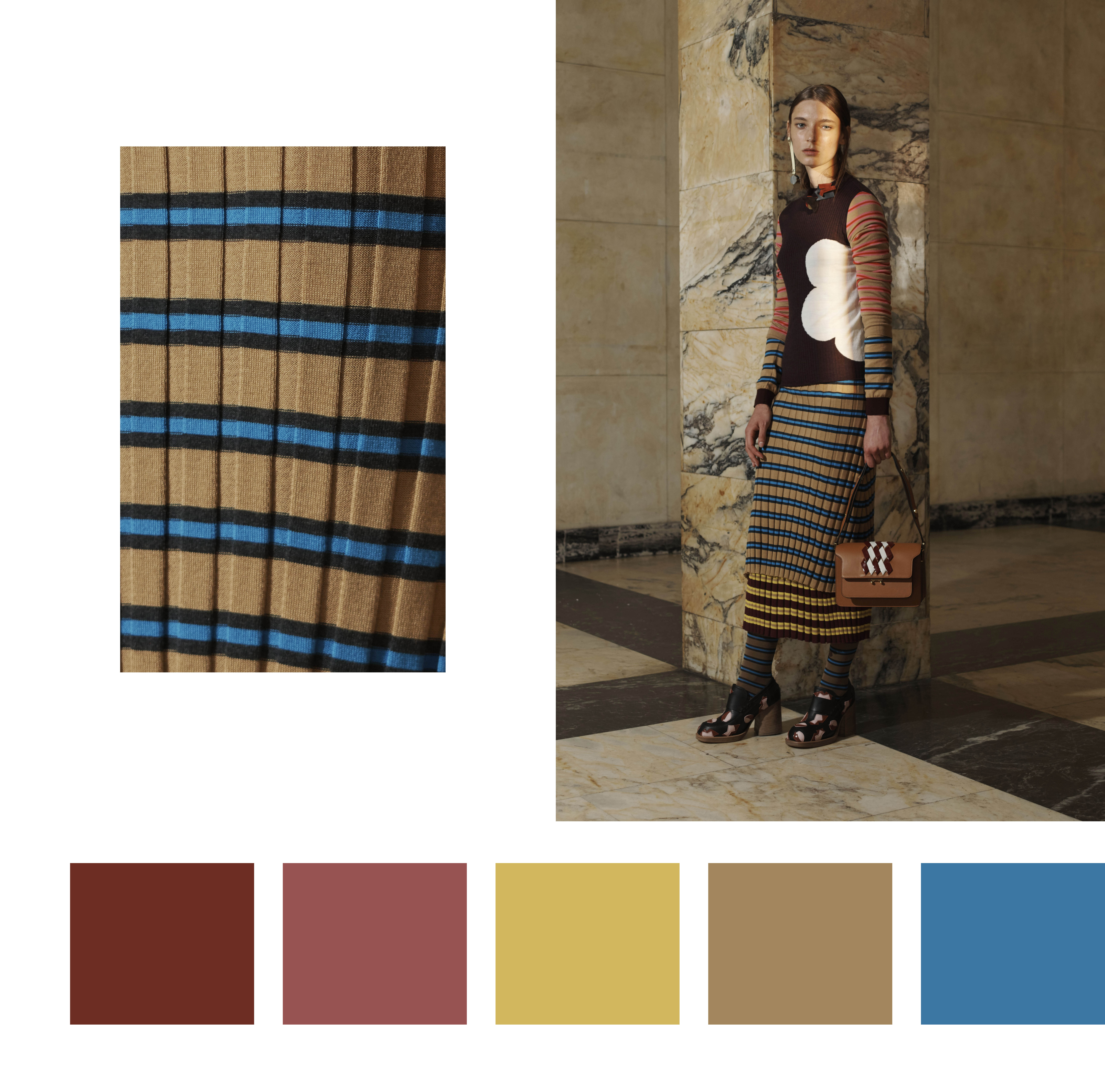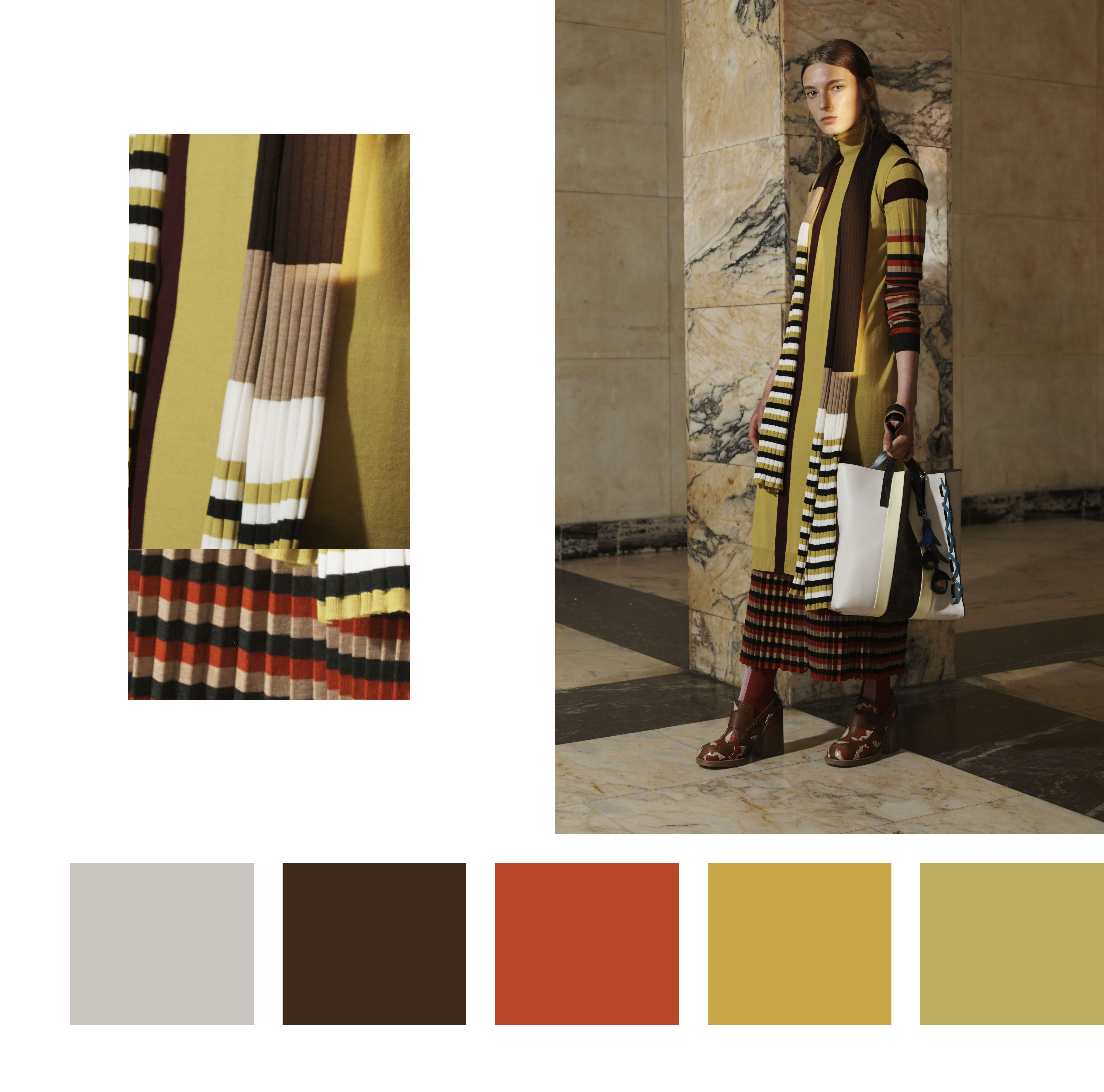 Принты, паттерны, конфликтующие цвета и геометрия — упорядоченный хаос, который характеризует эстетику Marni, был представлен в коллекции трикотажа сезона осень-зима 2017. В этом сезоне Франческо Риссо, креативный директор Marni, использовал только натуральные ткани: кашемир, хлопок и шерсть. В коллекции делается акцент на графические элементы: горизонтальные линии в теплых оттенках сочетаются с ребристой вязкой. Также дизайнер умело выстраивает колорблокинг - и все образы выглядят целостными. Этой осенью и зимой Marni предлагают носить кардиганы разной длины, а также миди-юбки — все то, что обязательно вас согреет в ненастную погоду.