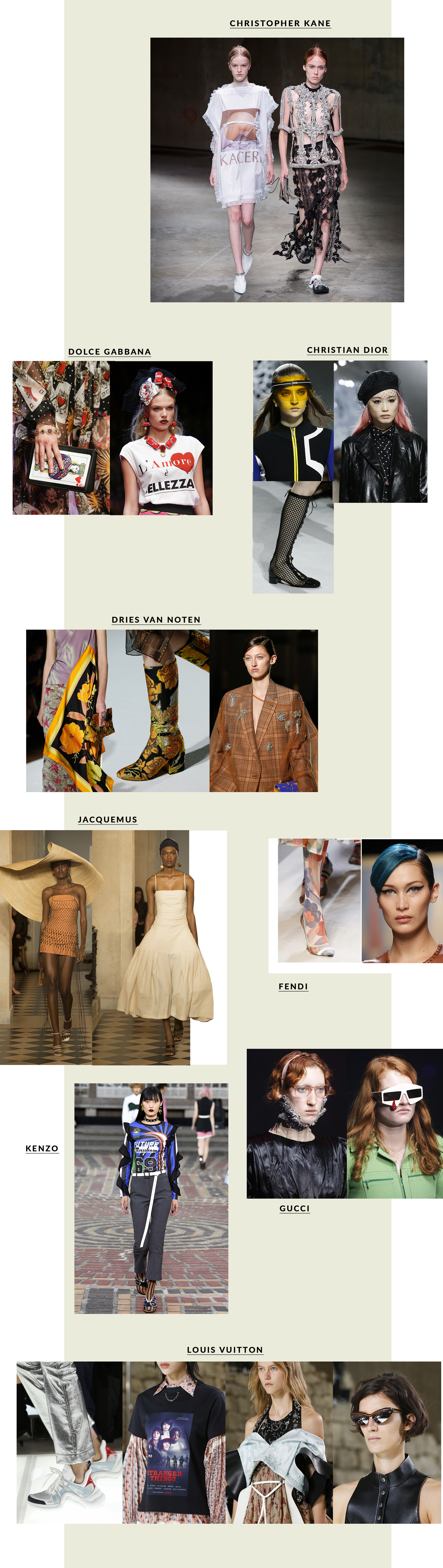 За массивными серьгами стоит обращаться к Jacquemus, Proenza Schouler или Simone Rochas, а украшения и даже одежда из крупных стразов – это по части Dries Van Noten, Christopher Kane и Gucci. И, наконец, очки: за футуристическими моделями – к Louis Vuitton и Miu Miu, а самая запоминающаяся модель сезона, с красной слезой, принадлежит авторству Алессандро Микеле.