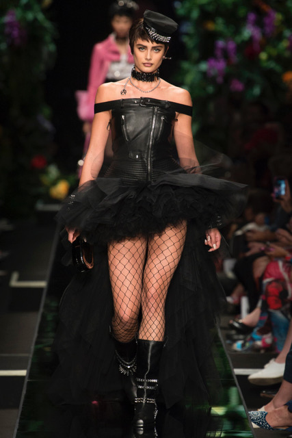 Пышную юбку-пачку Moschino из фатина дополняем косухой или другим верхом в байкерском стиле. Образ завершают тяжелые ботинки и шляпа Ruslan Baginskiy.