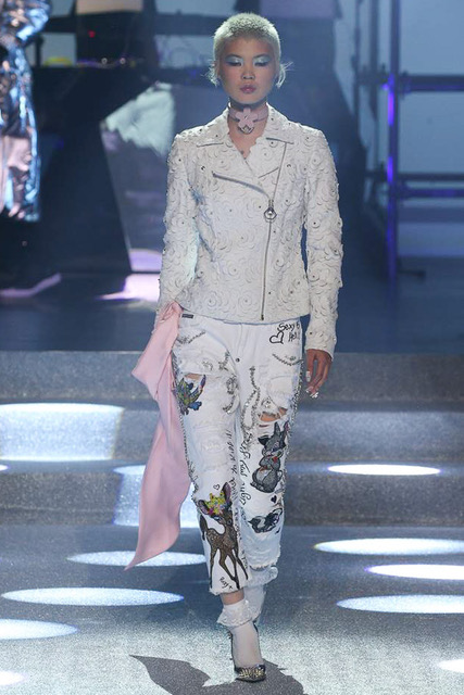 Помните, что главное правило образа глэм-рокера — это сочетание ярких цветов, рваной одежды и сияющих аксессуаров. Для него хорошо подойдет белая кожаная косуха Philipp Plein, брюки из денима с нашивками и яркий шелковый платок от Olga Dvoryanskaya.