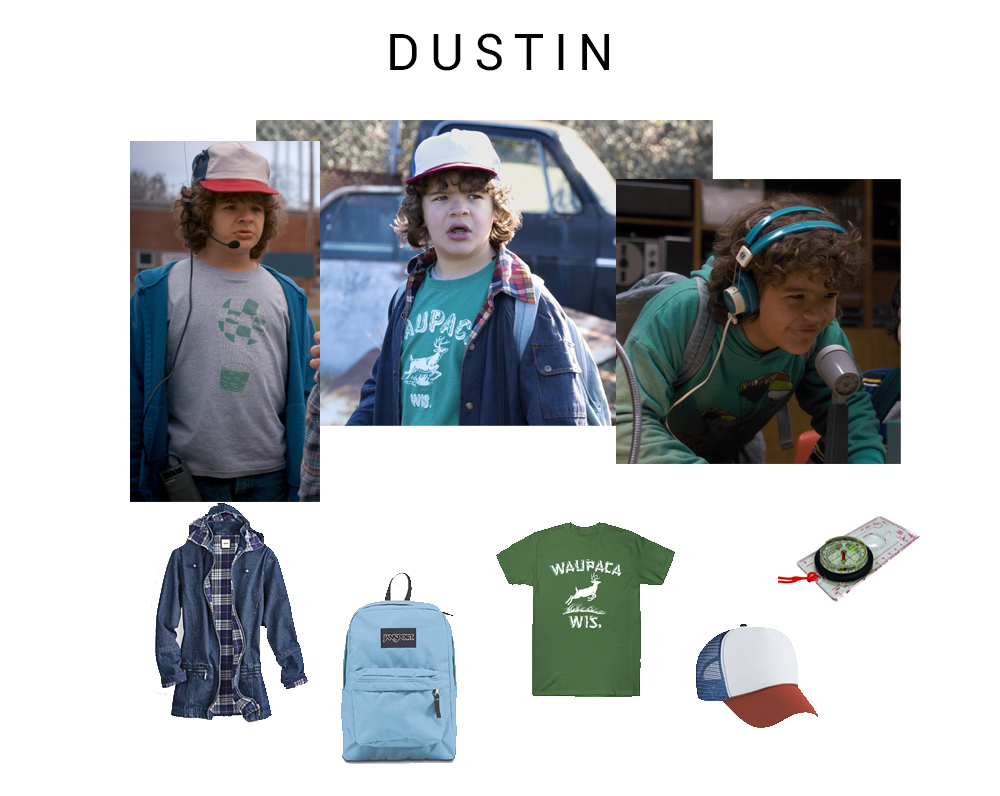 Хотите выглядеть как Дастин? Во-первых, не пренебрегайте завивкой, без его шикарных кудрей образ будет несовершенен. Во-вторых, примите стиль athleisure и полюбите его как самого себя: бейсболки, удобные куртки, футболки и рюкзаки отныне ваше все. Образ дополнят наушники и компас.