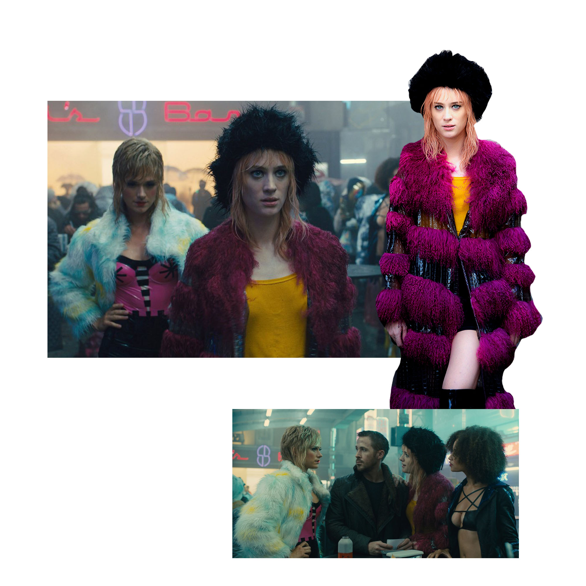 В этом мире на Земле живут люди, которые по разным причинам не смогли переселиться на другие, менее загрязненные и истощенные планеты, а также репликанты — роботы-андроиды, предназначенные для различных работ. Репликанты предыдущих поколений — вне закона ввиду того, что иногда выходят из-под контроля, и за ними охотятся и «списывают» так называемые бегущие по лезвию из специального под- разделения полиции. Одного из них по имени Кей играет Райан Гослинг, который весь фильм ходит в довольно практичном темно-сером пальто, — его работа и материальное положение не предусматривают обширного гардероба. По словам Рене, этот образ был легким и в то же время удачным — костюм пришелся по вкусу требовательному актеру и не успел надоесть самому костюмеру, что бывает крайне редко.