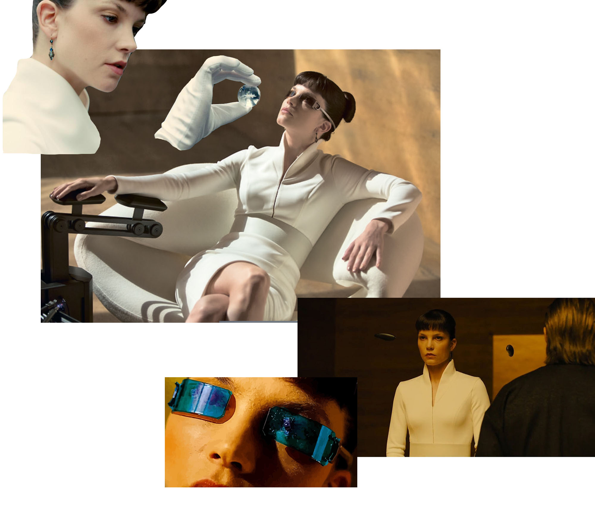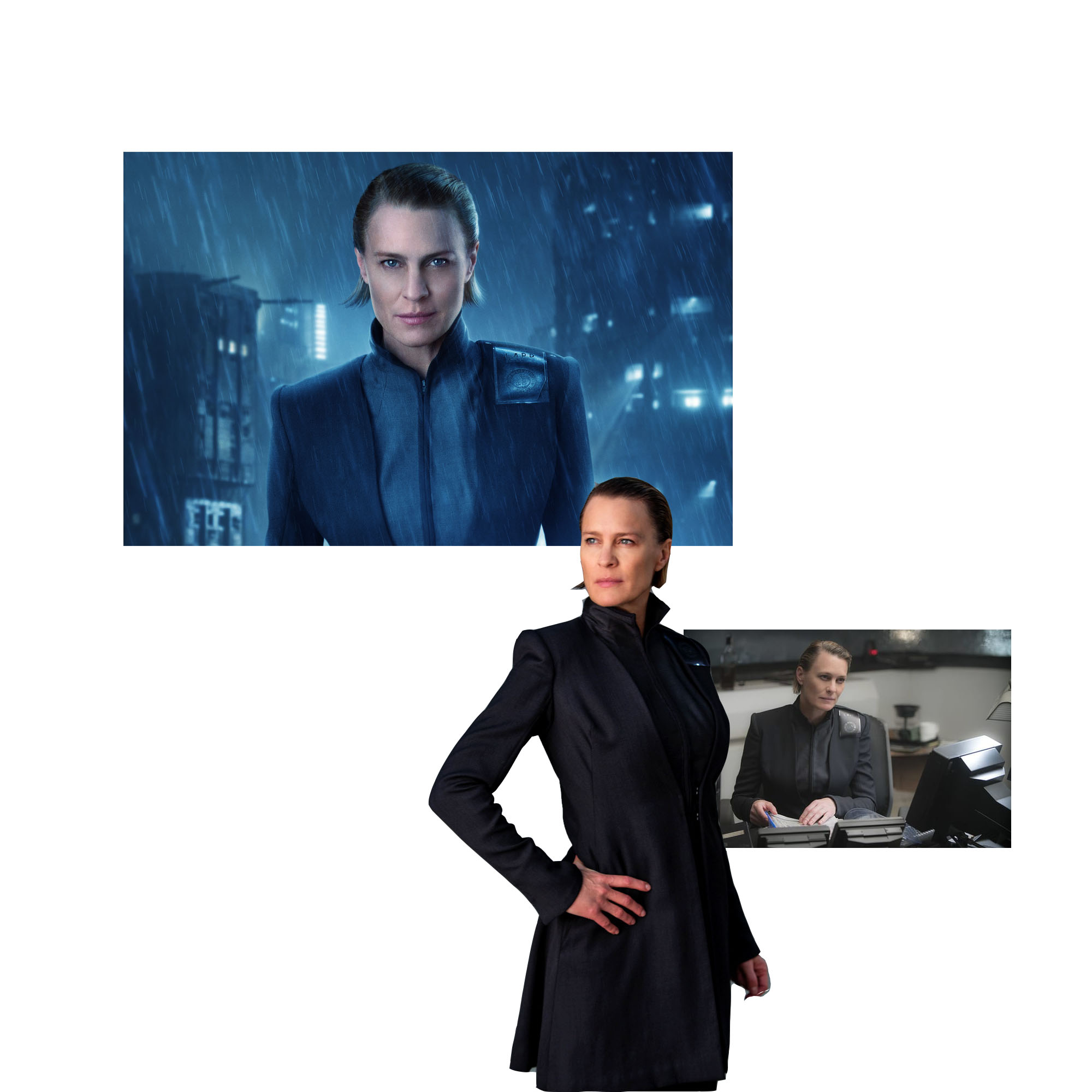Натуральных материалов на Земле образца 2049 года не осталось, поэтому, помимо искусственного меха и кожи, фильм сверкает образцовым футуристичным дизайном, словно сошедшим с подиумов осень-зима 2017. «Мы работали с мягким и твердым пластиком, использовали оптоволокно, светящиеся LED-элементы, 3D-печать и лазерную обработку тканей — искали новые материалы, что было непросто и очень интересно», — делится Рене. Результат ее работы говорит сам за себя: постоянно меняющиеся наряды голограммы Аны, сдержанное пальто Кея и образцовые примеры power dressing от Лав и Джоши, героини Робин Райт, заставляют и без того безупречную картинку заиграть новыми красками, дополняя и раскрывая образы персонажей.