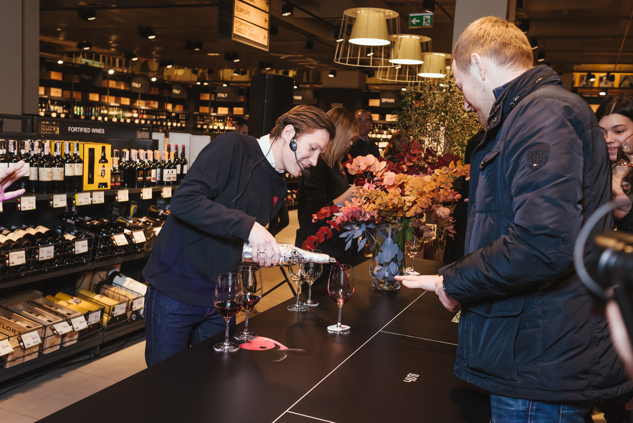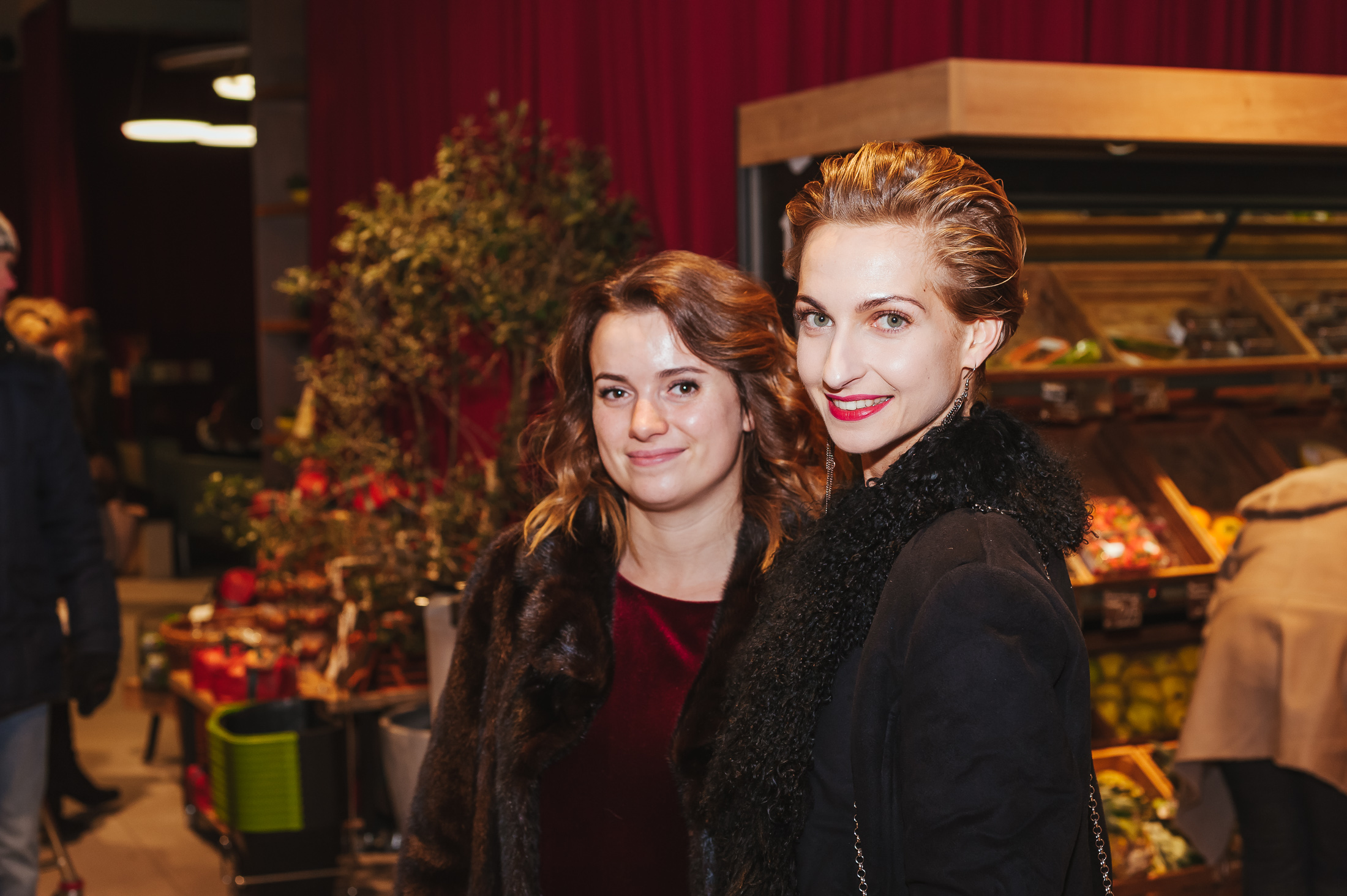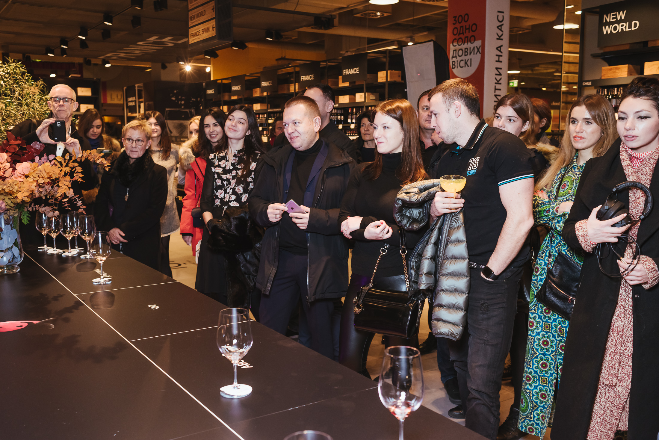 В каждой из 10 тематических зон знаменитости проводили свои активности, привлекая гостей делать добрые дела. Так, в отделе healthy food Ольга Фреймут готовила здоровые смузи с суперфудами и рассказывала о том, почему они полезные, а Катя Сильченко заваривала зеленый чай матча и подавала его с сетом конфет ручной работы. Владимир Ярославский, бренд-шеф Good Wine, готовил ризотто с трюфельной пастой в голове сыра Parmigiano, пока Василиса Фролова проводила мастер-класс по открыванию устриц, рассказывая об их полезных свойствах, а рядом с ней Юля МакГаффи готовила коктейли. Илья Чичкан и Маша Шубина отвечали за атмосферу в отделе крепкого алкоголя — в этот вечер там готовили коктейли Horse’s Neck и презентовали арт-наборы с иллюстрациями от художников; в нескольких шагах от них, в отделе вин, Андрей Доманский развлекал гостей винной рулеткой — игрой, где вслепую гости дегустировали вино, угадывая, в какой из стран его произвели. В пивной зоне Фагот из ТНМК разливал пиво от шотландских панков-пивоваров BrewDog и подавал его с орехово-крекерно-сырной тарелкой, а неподалеку Лера Бородина и Андрей Шабанов разливали шампанское из самой большой бутылки в Украине — 15-литровый «навуходоносор» Taittinger — и разрезали 13-килограммовый торт от Bakehouse. Наконец, в отделе флористики Лида Арфуш создавали зимние цветочные композиции со свечами и эвкалиптом. Музыкальным гостем вечера была DJ Katro Zauber, которая играла в винном баре 101 Wine Bar.