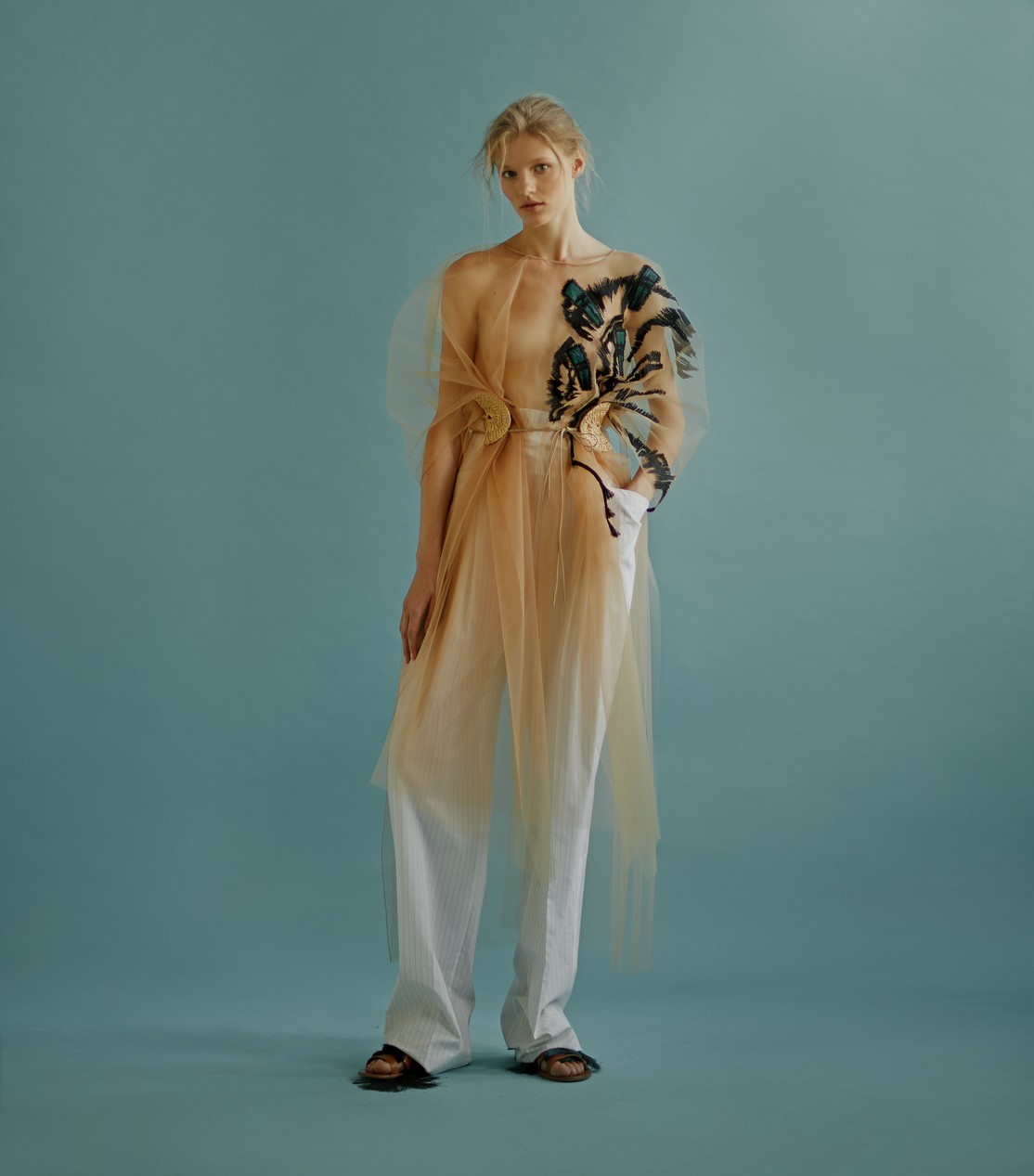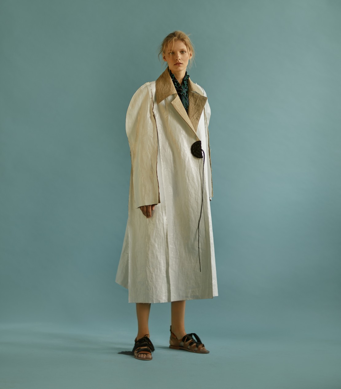 Весенне-летняя коллекция соединяет сразу несколько сложных ремесленнических техник, и как очередное признание в любви бренда к необычным контрастам самая тонкая работа здесь сделана мужскими руками. Отдельное место в коллекции отведено знаковому силуэту марки – пальто-кофру (Coffre Coat).