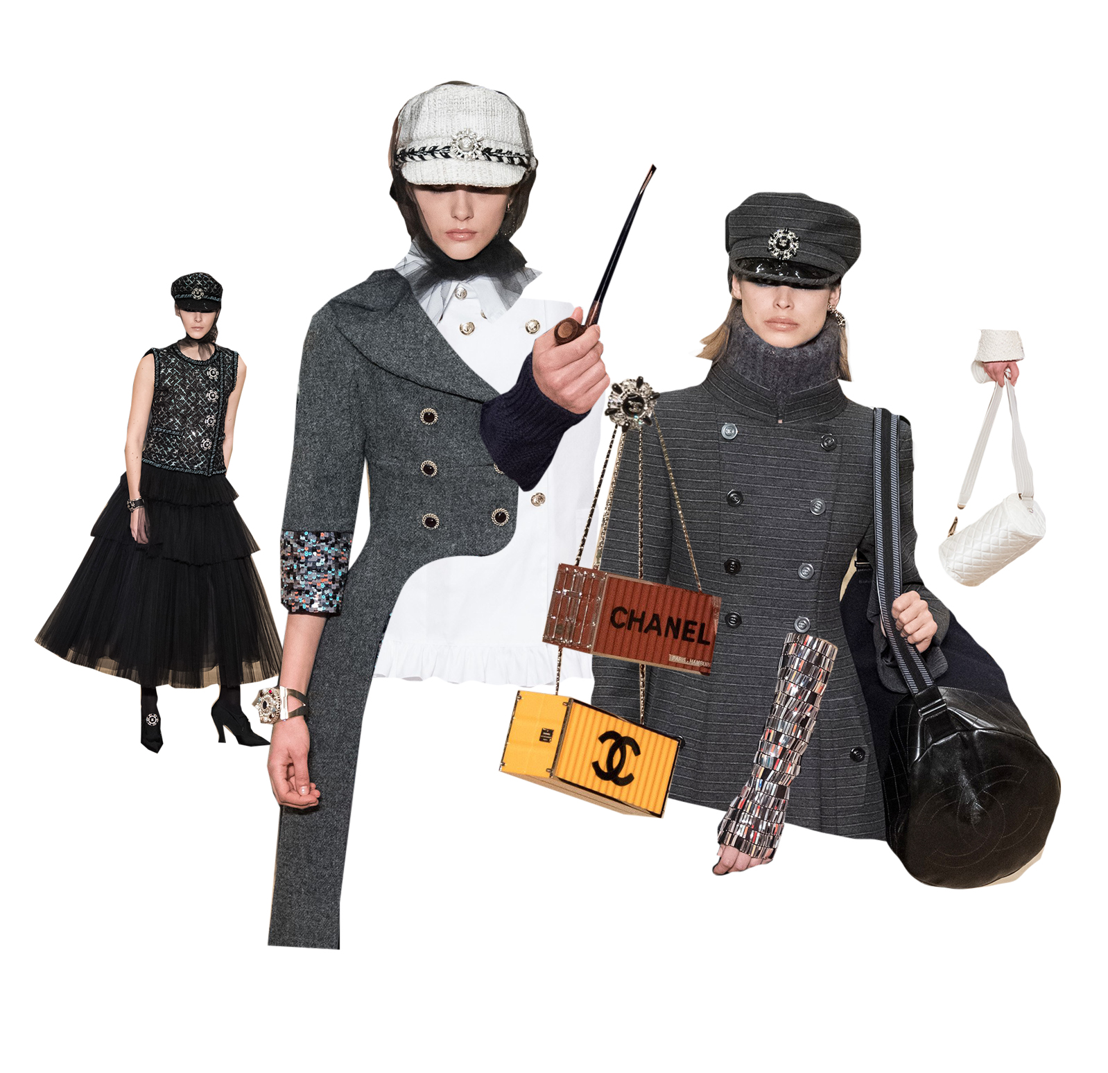 Футуристическое здание, напоминающее волну, и его сдержанная цветовая гамма читаются во всей коллекции: оттенки ржавчины и красного напоминают старые рыбацкие судна, светло-голубые акценты – чистое небо, а глубокий синий – тихую морскую гладь. Платья и пиджаки, расшитые пайетками и блестками, метафорично перекликаются с мерцающим стеклянным фасадом Elbphilharmonie и лучами солнца на воде. Здесь же и классическая матросская полоска, которую так любила Шанель, предпочитая ее для повседневных выходов. Кстати, в этой коллекции она появилась на платье, украшенном контрастными перьями. В продолжение морской темы Карл придумал остроумные сумки – миниатюрные грузовые контейнеры на изящной цепочке. А чего стоят отложные воротнички, как на форме у молодых матросов, капитанские фуражки и курительные трубки!