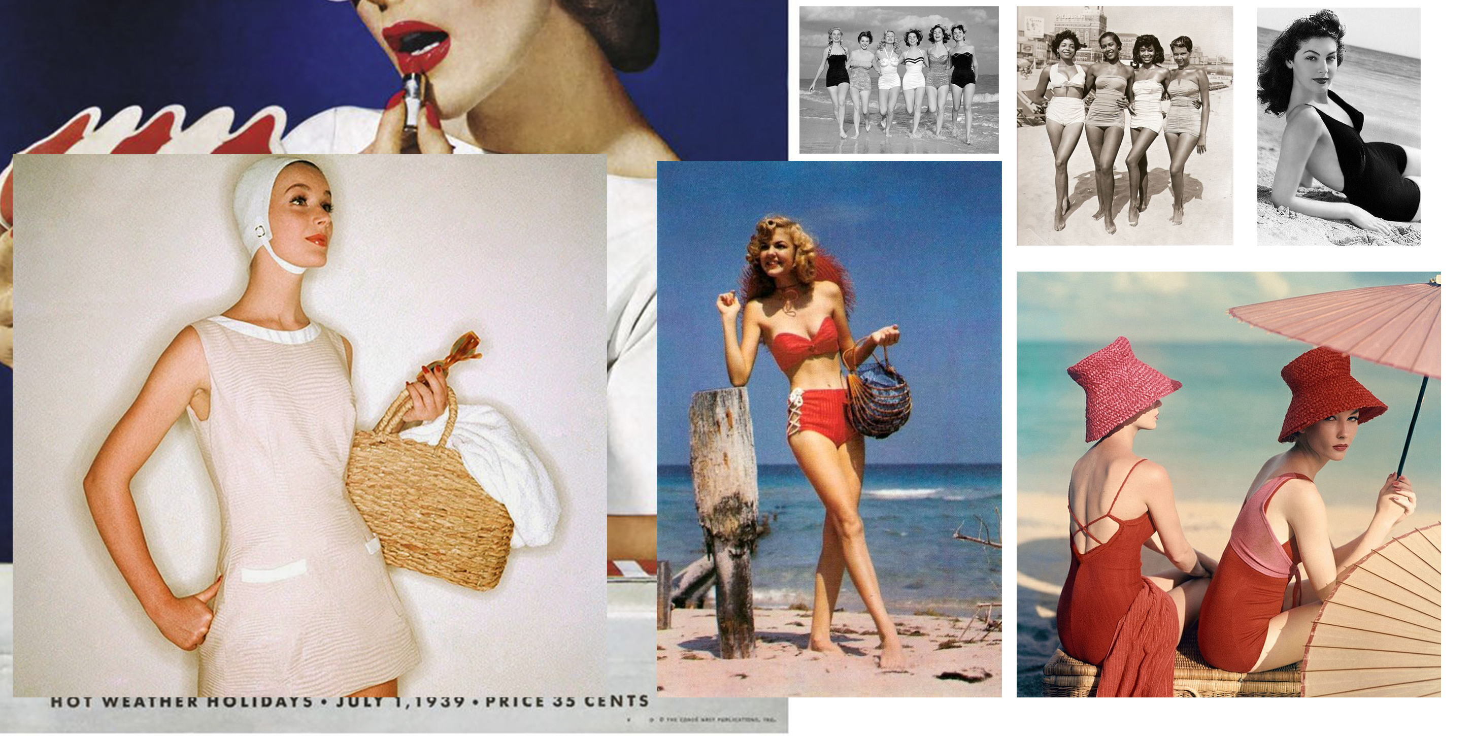 Американцы и европейцы побогаче даже позволяли себе иногда заниматься эскапизмом, уезжая в отпуск в теплые страны. Особенно модно было отдыхать в Средиземноморье, на Багамах и на восточном побережье Флориды. Загар тоже уже не считался чем-то зазорным, ведь Коко Шанель еще в 20-х убедила европейцев в том, что смуглая кожа вовсе не противоречит аристократичности и утонченности. Благодаря моде на пляжный отдых зародились и определенные правила курортной одежды: мужчины щеголяли в подчеркивающих загар белых пиджаках, а женщины впервые начали носить «пляжные пижамы» – легкие костюмы, оголяющие живот и руки. Также пользовались популярностью купальники – их впервые начали делать из синтетики, а не из шерсти, так что носить их было гораздо удобнее. Раздельные купальники впервые появились благодаря федеральному правительству США – в 1942 году вышел указ, согласно которому производители цивильной одежды должны были использовать на 10% меньше ткани, чем до этого. Чтобы сэкономить, дизайнеры вроде Тины Лесер начали предлагать клиентам первые раздельные купальники. Хотя изначально многие дамы выступали против таких нескромных нарядов, деваться было некуда – больше ткани попросту не было. Впрочем, даже первые купальники регулировались строгими правилами. Так как демонстрация пупка считалась нарушением всех норм приличия, низ купальника обычно был с завышенной талией. В 1946 году был изобретен первый купальник «бикини», получивший свое название от атолла Бикини – места в Тихом океане, где американцы проводили испытание ядерного оружия. По мнению модельера Луи Реара, его новое творение должно было «взорвать» модный мир. Так, собственно, и случилось – бикини перестало быть чем-то скандальным и действительно начало пользоваться популярностью только спустя десять лет.