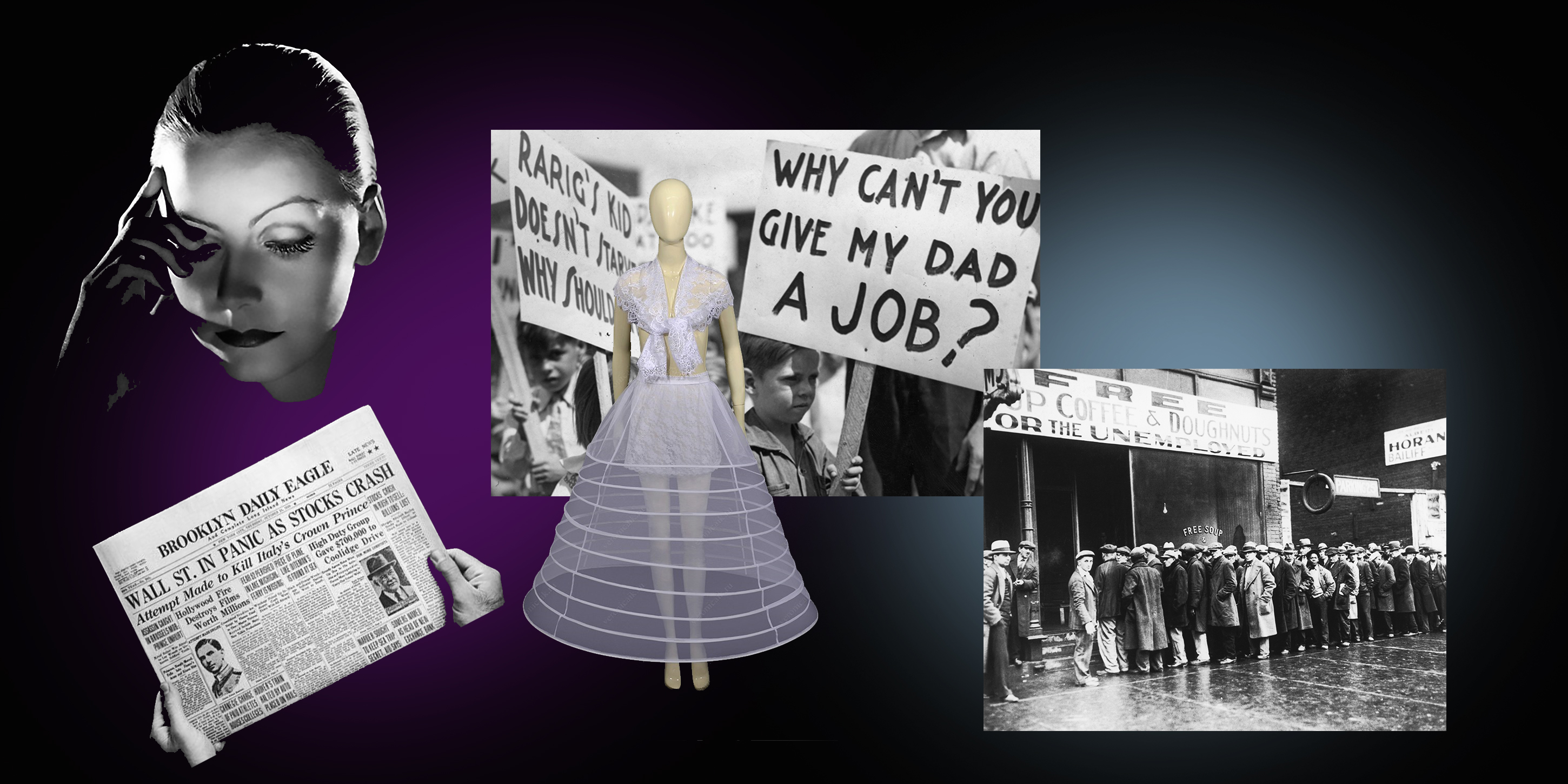 Первой жертвой Биржевого краха 1929 года стал образ девушки-флэппера – на смену беззаботному и игривому стилю пришла строгость и маскулинность в женской одежде. Юбки, которые в 1920-х даже оголяли колени, резко опустились чуть ли не до пола, а на смену расслабленным заниженным талиям вновь пришли корсеты. Идеальной девушкой 1930-х была «фатальная женщина» – решительная и способная самостоятельно зарабатывать, несмотря на массовую безработицу. Даже в самые сложные годы Депрессии индустрия красоты процветала – чтобы хорошо выглядеть перед своими работодателями-мужчинами, женщины массово пользовались помадой и подводили брови. Домохозяйки тоже красились, считалось, что жена должна всячески радовать уставшего от работы мужа, в том числе – своим подчеркнуто изысканным внешним видом. Если раньше модницы подстригали волосы «под мальчика», то в 30-х вернулся тренд на длинные локоны, которые считались более женственными. Несмотря на желание выглядеть максимально изысканно, многие девушки начали носить брюки – на них уходило меньше ткани, чем на длинные юбки, да и работать в тяжелых фабричных условиях было удобнее. Кокетливые шляпки тоже имели практическую ценность – они не давали волосам падать на лицо и позволяли работающим девушкам реже мыть голову.