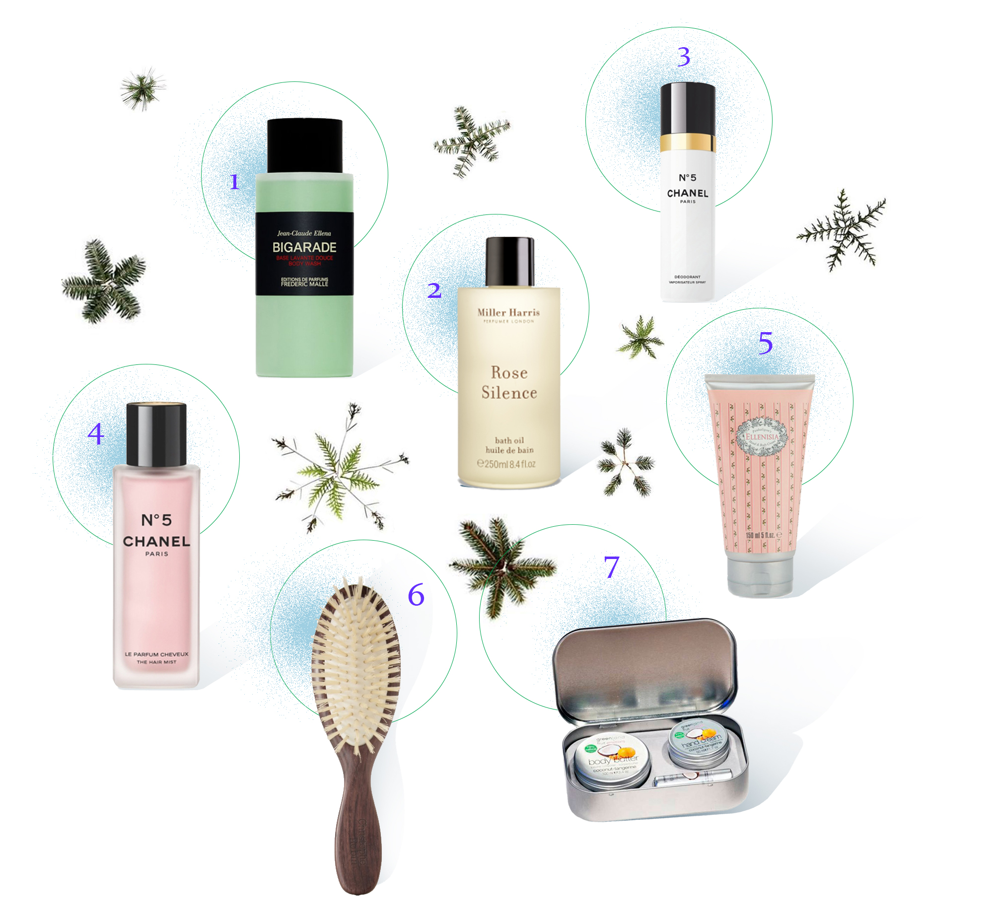 1) Frédéric Malle Гель для душа Bigarade — 1 400 грн; 2) Масло для ванны Miller Harris Rose Silence — 945 грн; 3) Дезодорант-спрей Chanel №5 — 895 грн; 4) Дымка для волос Chanel №5 — 968 грн; 5) Крем для тела и рук Penhaligon's — 705 грн; 6) Щетка для волос Christophe Robin — 2290 грн; 7) Набор для ухода за телом Greenland Skin Kit Set — 419 грн.