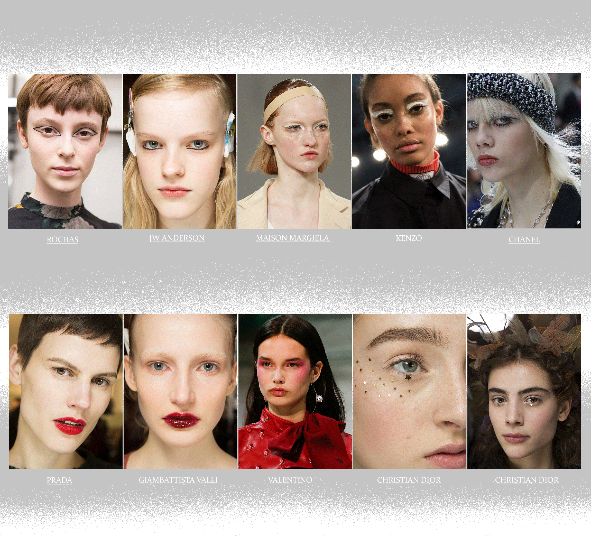 Минималистам подойдут графические чёрные линии как альтернатива привычным стрелкам. Интересные примеры можно подсмотреть у Maison Margiela, Rochas, Chanel и J.W Anderson. Если хочется чего-то необычного и в то же время сдержанного, изучите образы с показов Marni, Kenzo и Prabal Gurung — бьюти-мастера обратились к пастельным кремовым теням и нанесли их на верхнее веко. А ещё есть интересные варианты — особенно для тех, у кого возникают проблемы с созданием стрелок, — у Prada и Giambattista Valli: акцент на губы и ничего лишнего.