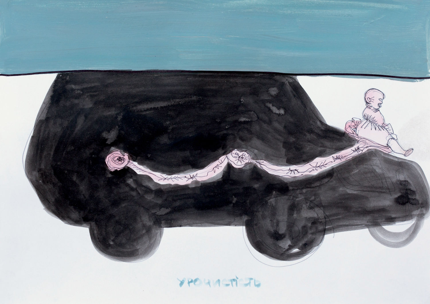 Предисловием и к названию выставки, и к глобальным размышлениям художницы послужила свадьба, на которой побывала Влада, пока гостила в резиденции арт-сообщества “ЧервонеЧорне” в Каневе. Типичное для украинской глубинки празднество с вычурными платьями и костюмами, надетыми не по погоде, громко играющей “попсой”, бутербродами и черными джипами, украшенными “ритуальными” цветами. Влада вспоминает с легкой иронией: “Это мрачное пятно чем-то напоминало катафалк — возможно, все дело в цветах. Но он — этот “кентавр” — и послужил названием для выставки и двух моих работ. Вместе с ним слово “торжественность” раскрыло дополнительный смысл и других рисунков. Я стала размышлять о том, что люди, выполняя какие-то повседневные и праздничные ритуалы, часто забывают об их значении, функциях и истоках”. Таким образом через свое творчество Влада задает зрителю вопрос и о двойственности понятий, в том числе: “Что вы на самом деле делаете?”