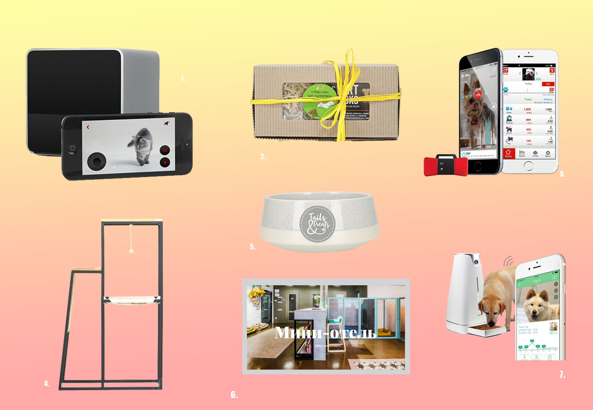1. Домашняя камера Petcube — цена по запросу. 2. Вкусняшка для любимца — 99 грн. 3. Фитнес-трекер для собак — 1599 грн. 4. Котолофт — 3080 грн. 5. Мисочка для еды — 385 грн. 6. Абонемент в мини-отель для животных — от 400 грн. 7. Умная кормушка — 4999 грн.