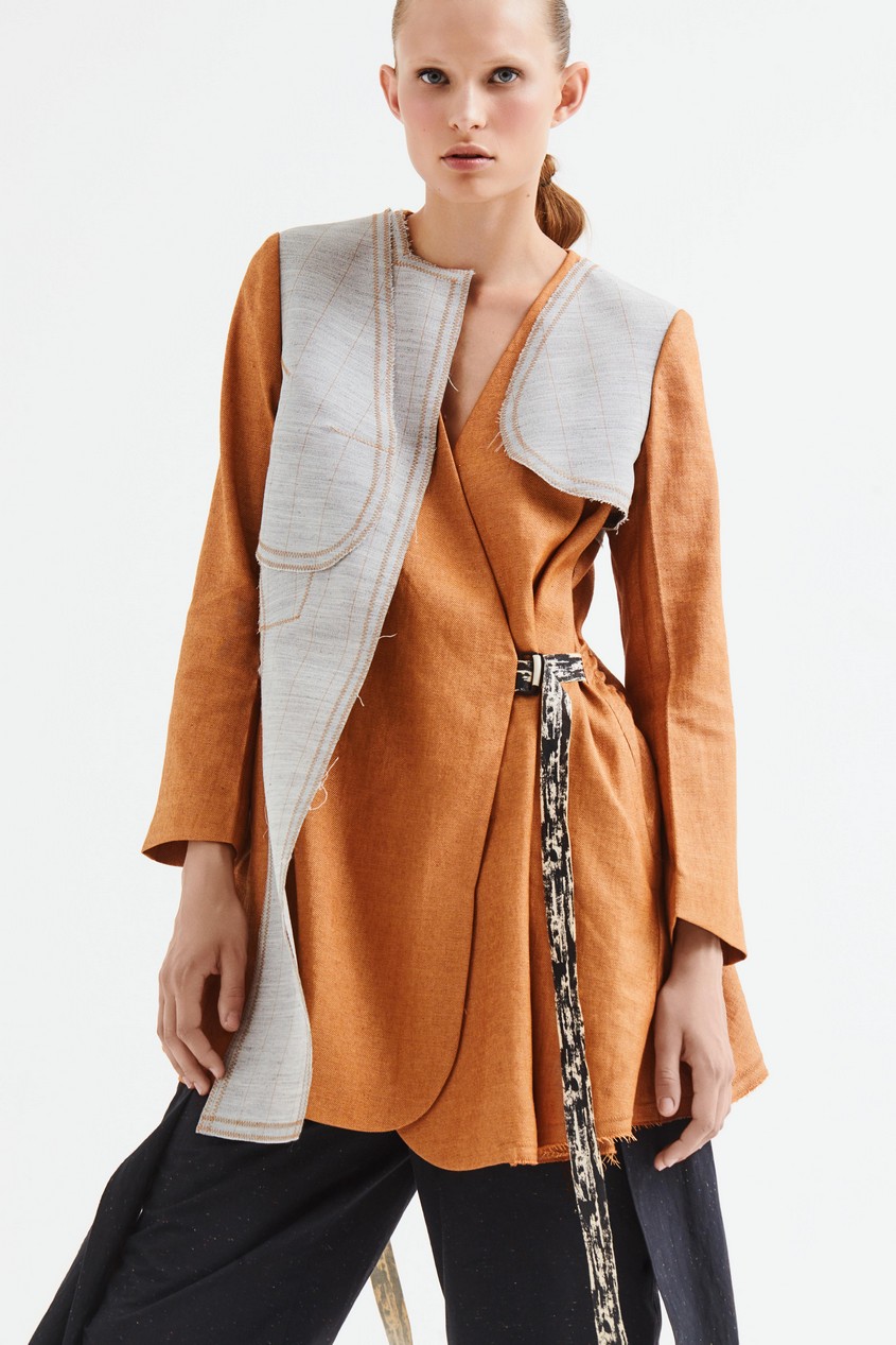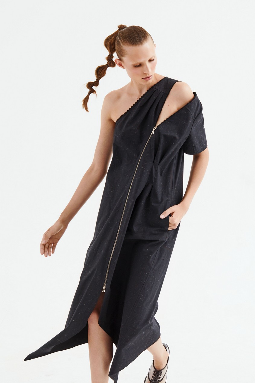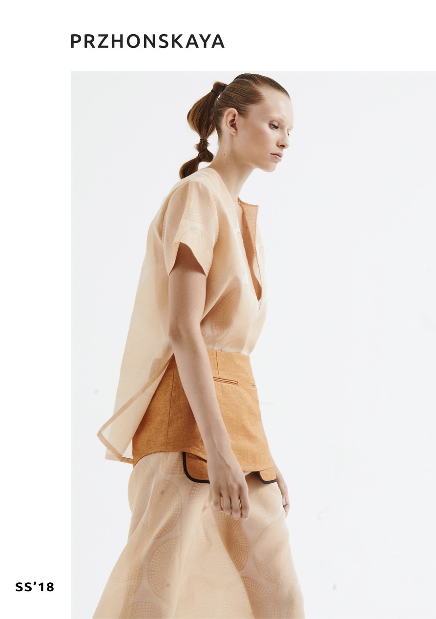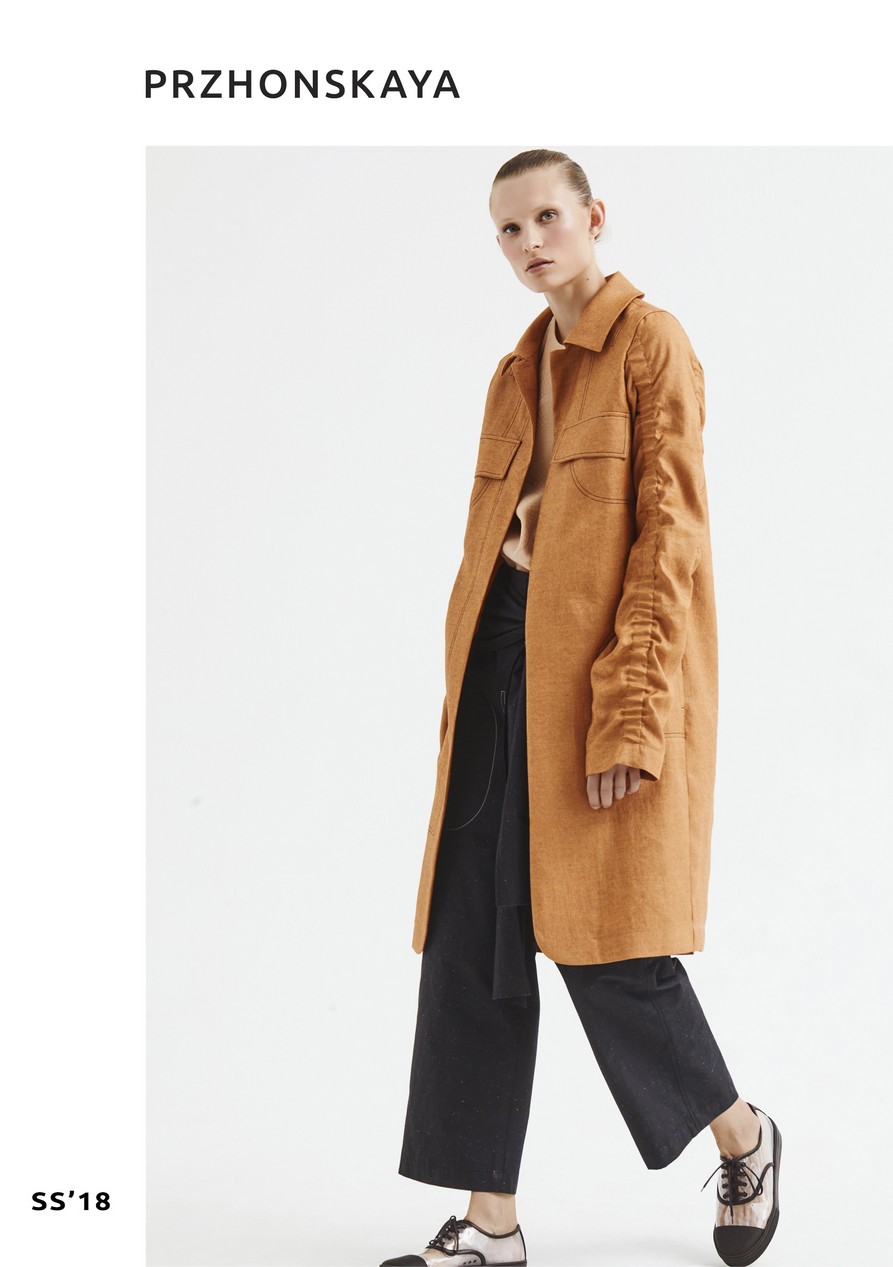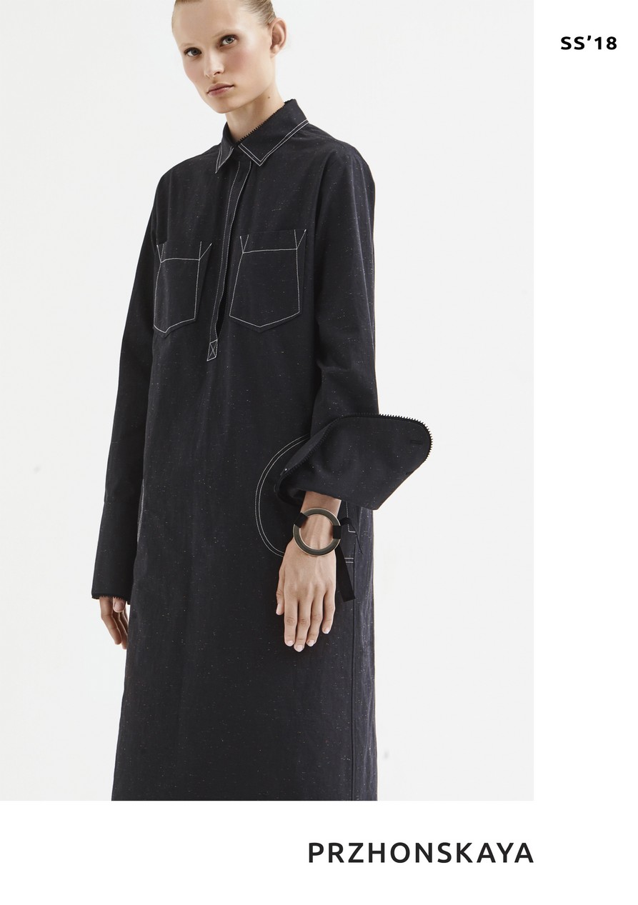 Основная идея коллекции — показать то, что обычно остается за кадром индустрии, провести за кулисы производства и изготовления одежды. Используя элементы мужского костюма в женской одежде, дизайнер также переосмысливает роль гендера и взаимосвязь полов. Коллекция построена вокруг классической формы и деталей. Прикладные материалы, которые служат для формообразования мужского жакета, в ключевых женских моделях играют декоративную роль. Жакеты и плащи сложного кроя выдержаны в минималистичном стиле, но полны деталей при ближайшем рассмотрении. Платья и рубашки служат дополнением к верхней одежде, которая традиционно играет главную роль в коллекциях PRZHONSKAYA. А все акценты сосредоточены вокруг необработанных швов, отстежных элементов, металлической фурнитуры и сборок.