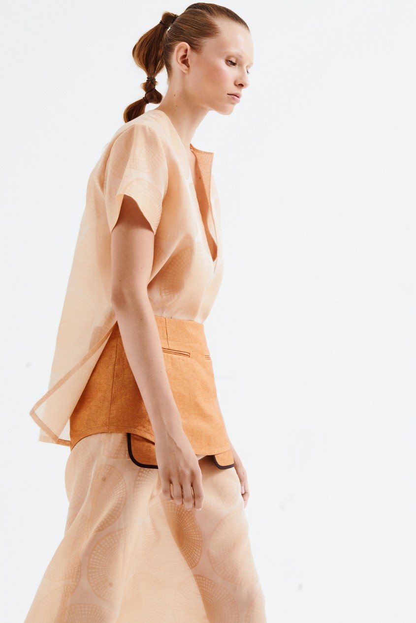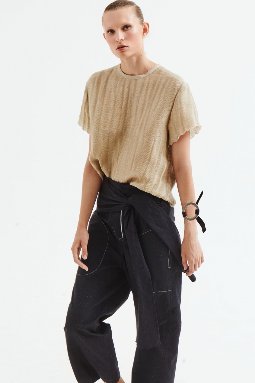 В этом сезоне марка показывает весь сложный путь от конструкции до готовой одежды, заводит смотрящего за кулисы производства. Поэтому помимо явных отсылок к демонстрации внутренней отделки на внешней стороне изделия, гости показа могут посмотреть видео о том, кто стоит за созданием вещей бренда. В этом сезоне бренд PRZHONSKAYA открывает двери своего ателье, чтобы показать свою главную гордость — мастерство кроя и команду.