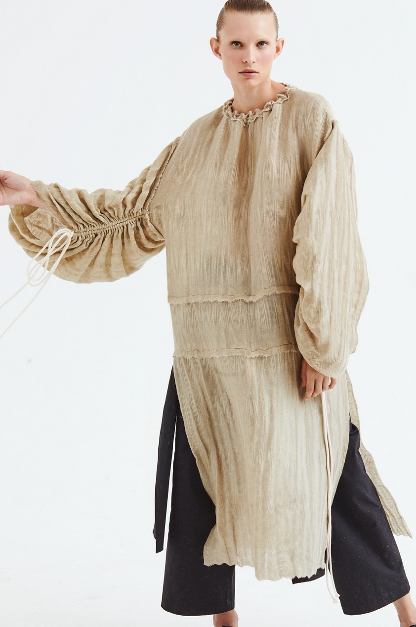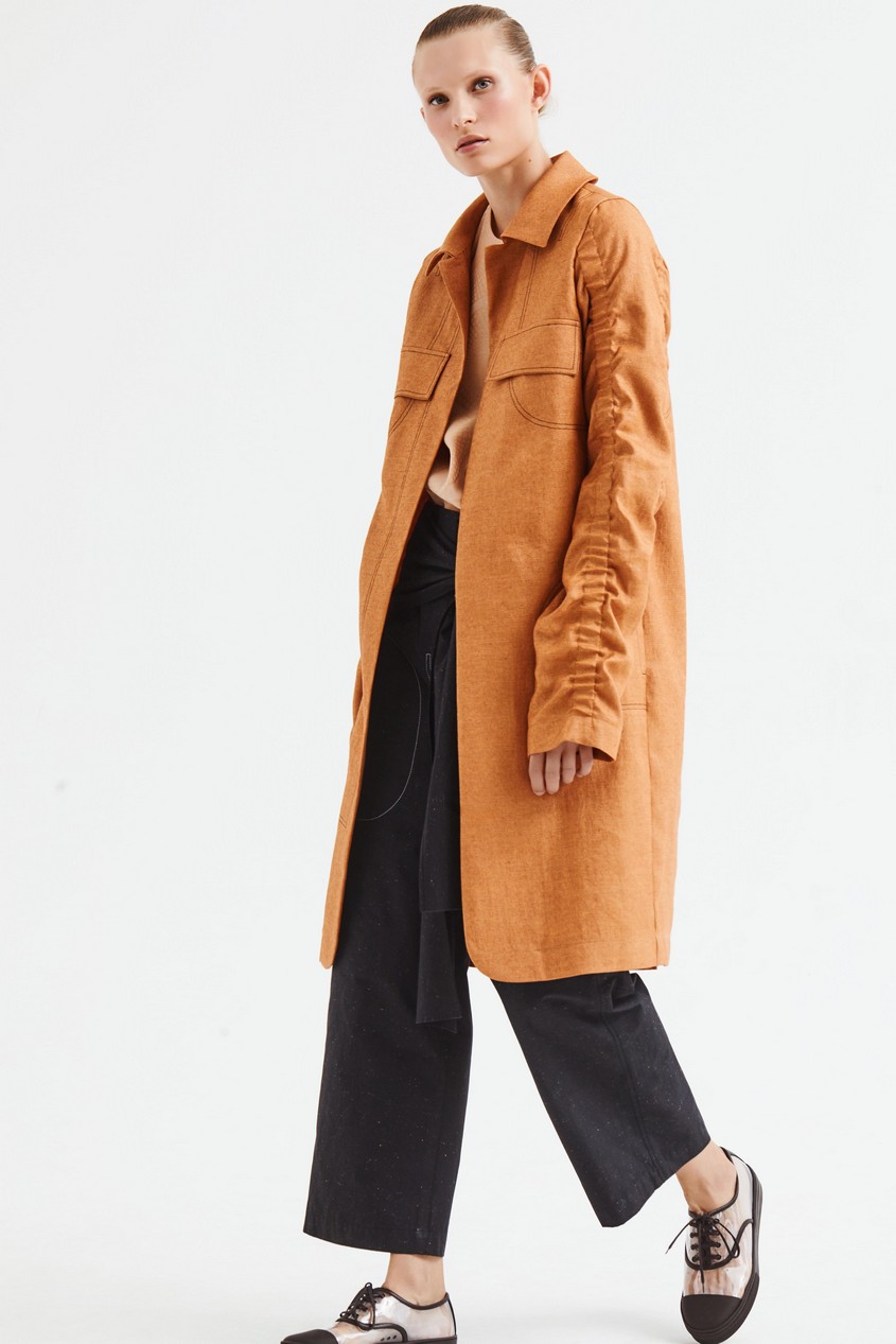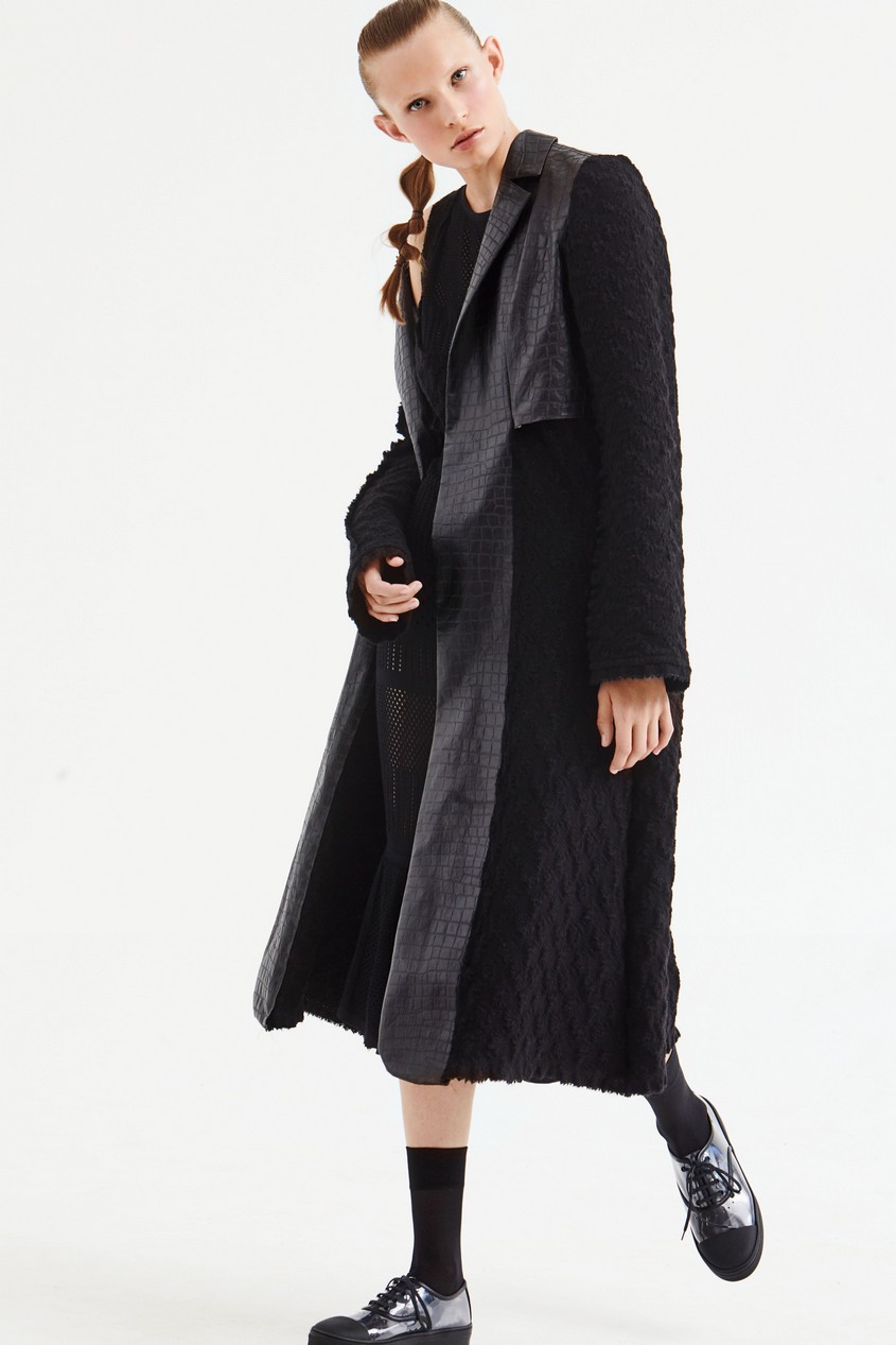 В этом сезоне дизайнер уделяет внимание необычным материалам, среди которых плиссированный шелк «волны», лен с тиснением, хлопок «звездное небо» и полюбившийся HI-TECH-материал с полиуретановым покрытием, которые добавляют эффектности сложным конструкциям. Вся коллекция выполнена в традиционной для марки монохромной гамме: в черном, белом, бежевом и медном цветах.