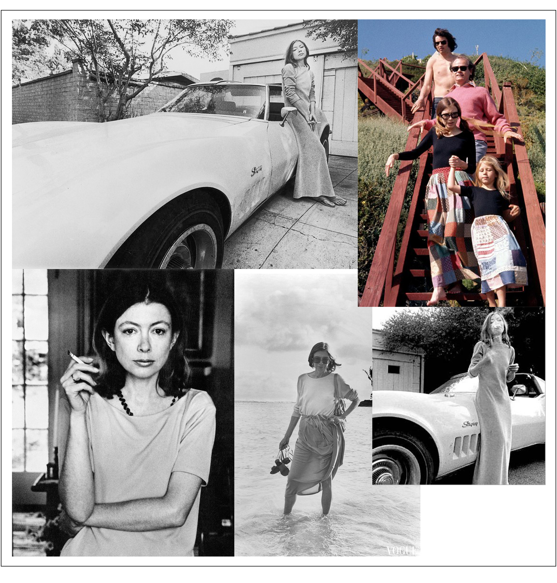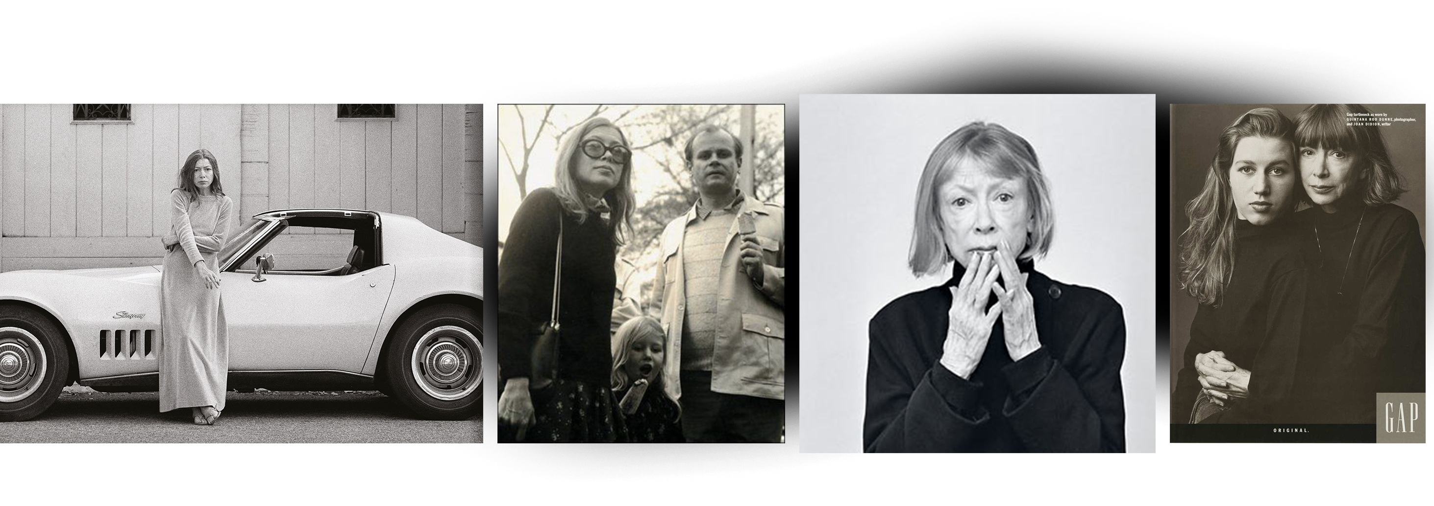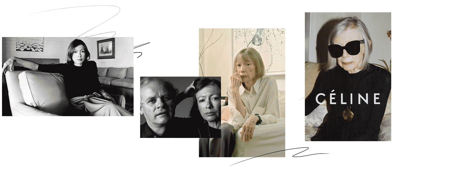 В 2015-м Фиби Файло пригласила ее стать лицом рекламной кампании Céline. Джоан, все такая же хрупкая, миниатюрная, молчаливая, в черной водолазке и таких же черных очках, сидит в своей гостиной в Верхнем Ист-Сайде и смотрит в объектив Юргена Теллера. Та кампания прошлась по всему миру, покорив социальные сети. «К чему шуметь? Я уже снималась в рекламе», — говорит Дидион, вспоминая о кадре авторства Энни Лейбовиц для Gap, на котором Джоан обнимает Кинтану-Роо.