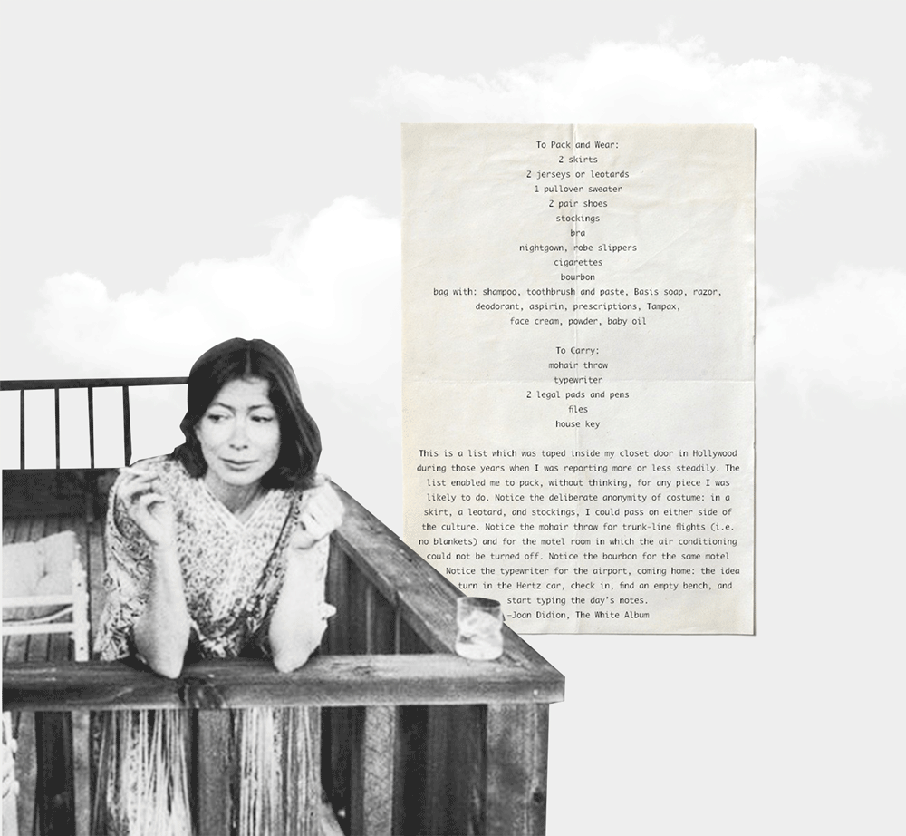 Джоан — хрупкая маленькая женщина с бледной кожей, тонкими пальцами и бесконечно дымящей сигаретой. В ее очерках и романах строки пропитаны трагизмом, тревогой и личным, местами лиричным, откровением. В конце концов, ее чувства и тяготы жизни стали живыми героями ее романов. Дидион представляет себя отстраненным наблюдателем — нет, даже свидетелем: она смотрит вокруг, слушает все, но не участвует. В этом они были схожи с Уорхолом — некоторые журналисты называли их «духовными близнецами».