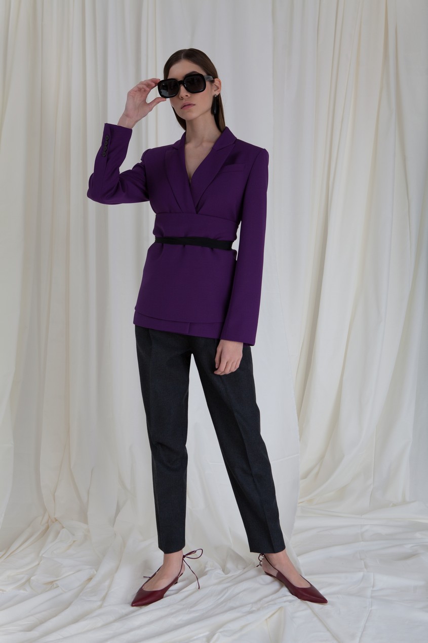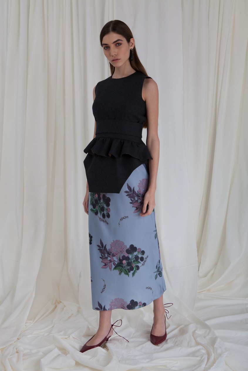 Палитра коллекции Pre-Fall — дань богатству оттенков французской природы. В нее вошли разнообразные оттенки налитого южным солнцем зеленого, небесно-голубого, цветущего лилового и лавандового. Кстати, лаванда разрастается в коллекции и в качестве принта. В один букет с ней вплетаются ягоды ежевики и полевых растений. Образы дополняют аксессуары: ремни со вставками из кружева, пояса, манишки и остроносые kitten heels.
