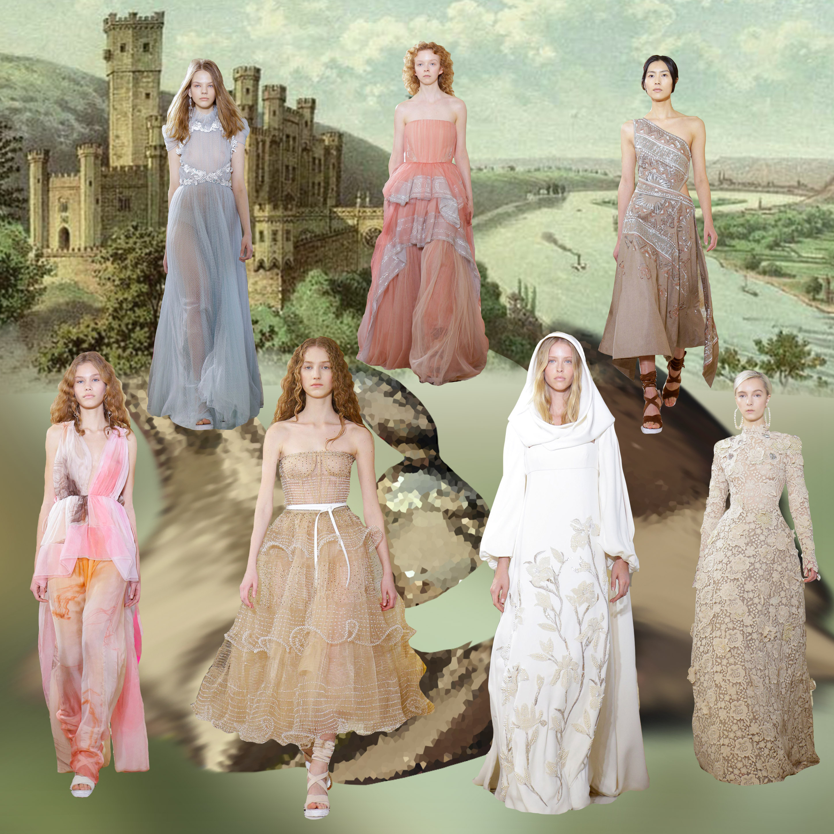 Судя по коллекции, больше всего Гийона вдохновили средневековые полотна и гобелены: на невесомых платьях и жакетах ползут лозы невероятных растений и носятся обитатели бестиариев. Кроме того, фасоны некоторых платьев-бюстье, платьев с капюшонами и кружевных моделей явно отсылают все к тем же Средним векам. При этом параллельно с историческими отсылками в коллекции присутствует «трайбал», вариации на тему офисных луков и обязательные для от-кутюр пышные платья. Так что, разумеется, эстетика Средневековья – не основная тема коллекции, это лишь одно из многих ее направлений, но нас оно очаровывает, пожалуй, больше всего: когда дизайнер цитирует 80-е, только не 1980-е, а 1480-е, это не может не подкупать.
