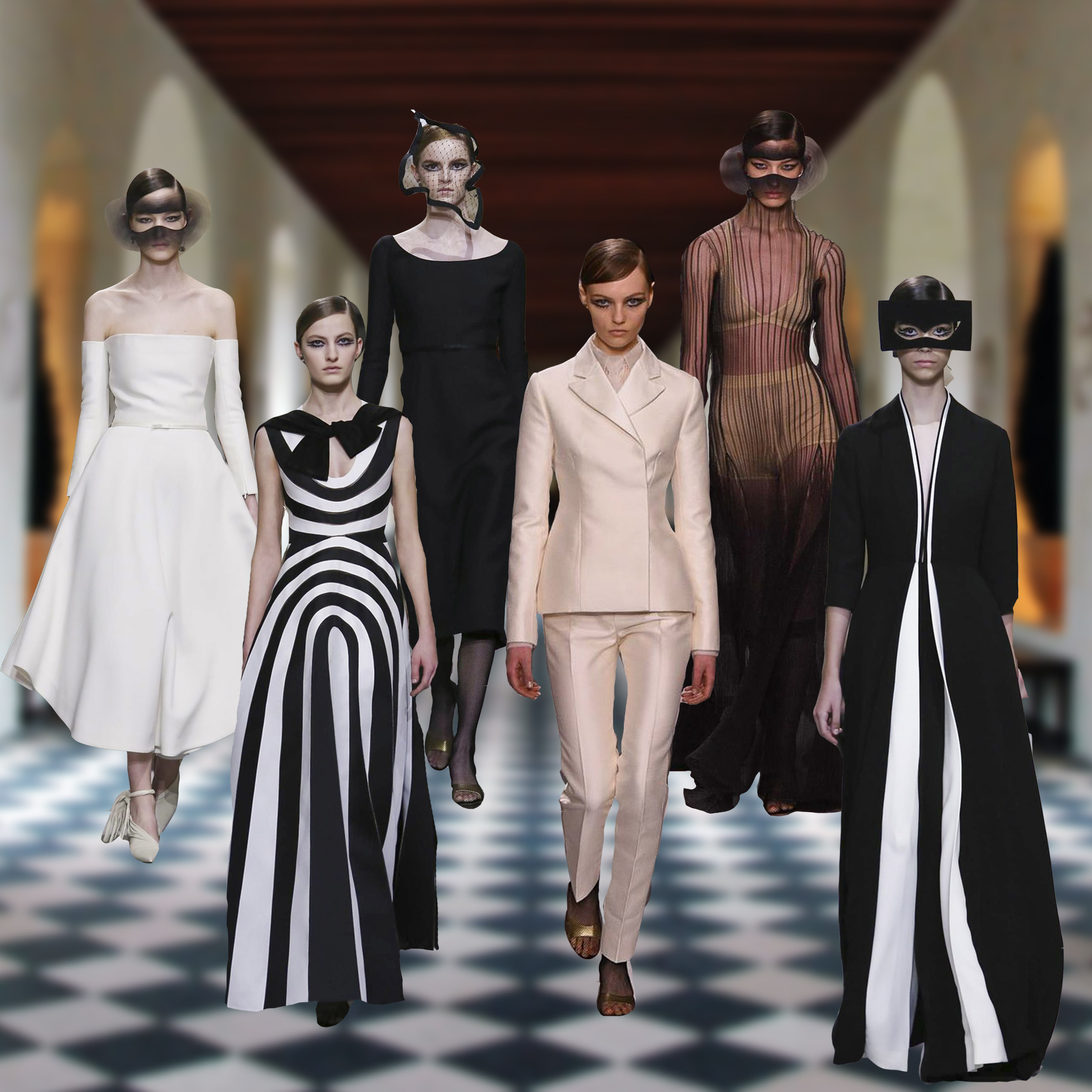 Как и в осенне-зимней коллекции, дизайнер обращается к теме женщин в искусстве: на этот раз избранницей Кьюри стала французская художница Леонор Фини. Если вдруг вы захотите разыскать ее фотографии, то непременно найдете парижанку, одетую в полосатые черно-белые колготки или такую же полосатую черно-белую юбку new look. На тех же фотографиях ее легко обнаружить в причудливых масках, украшенных перьями, или узнать в автопортрете 1970-х годов ее лицо, прикрытое тонкой черной сеткой, которая появляется в новой коллекции Christian Dior.