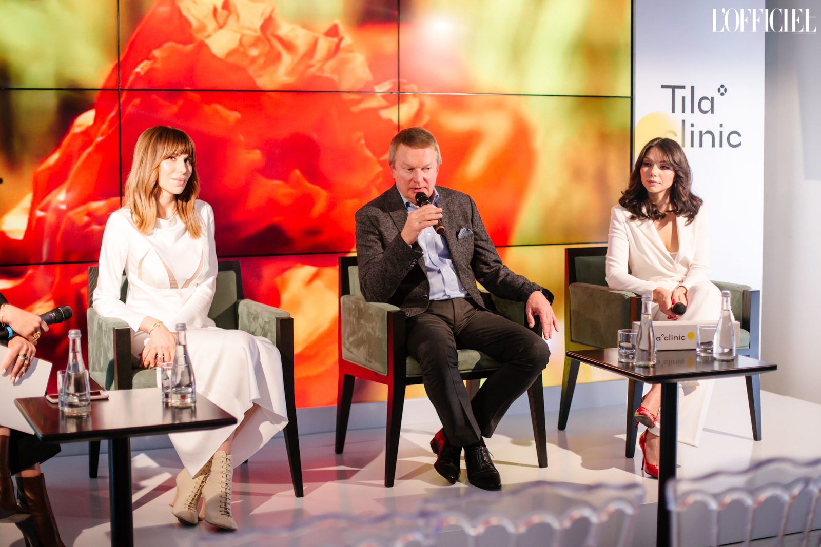 Специально для гостей провели public talk "Разговор о теле", который модерировала известный адепт здорового образа жизни, ведущая и почетный посол ООН Мария Ефросинина, спикеры Tila Сlinic: главврач Николай Соколов, Мария Газда — специалист антиэйджинга, а также сертифицированный коуч-нутрициолог, автор проекта Fooditation Алина Палкина.