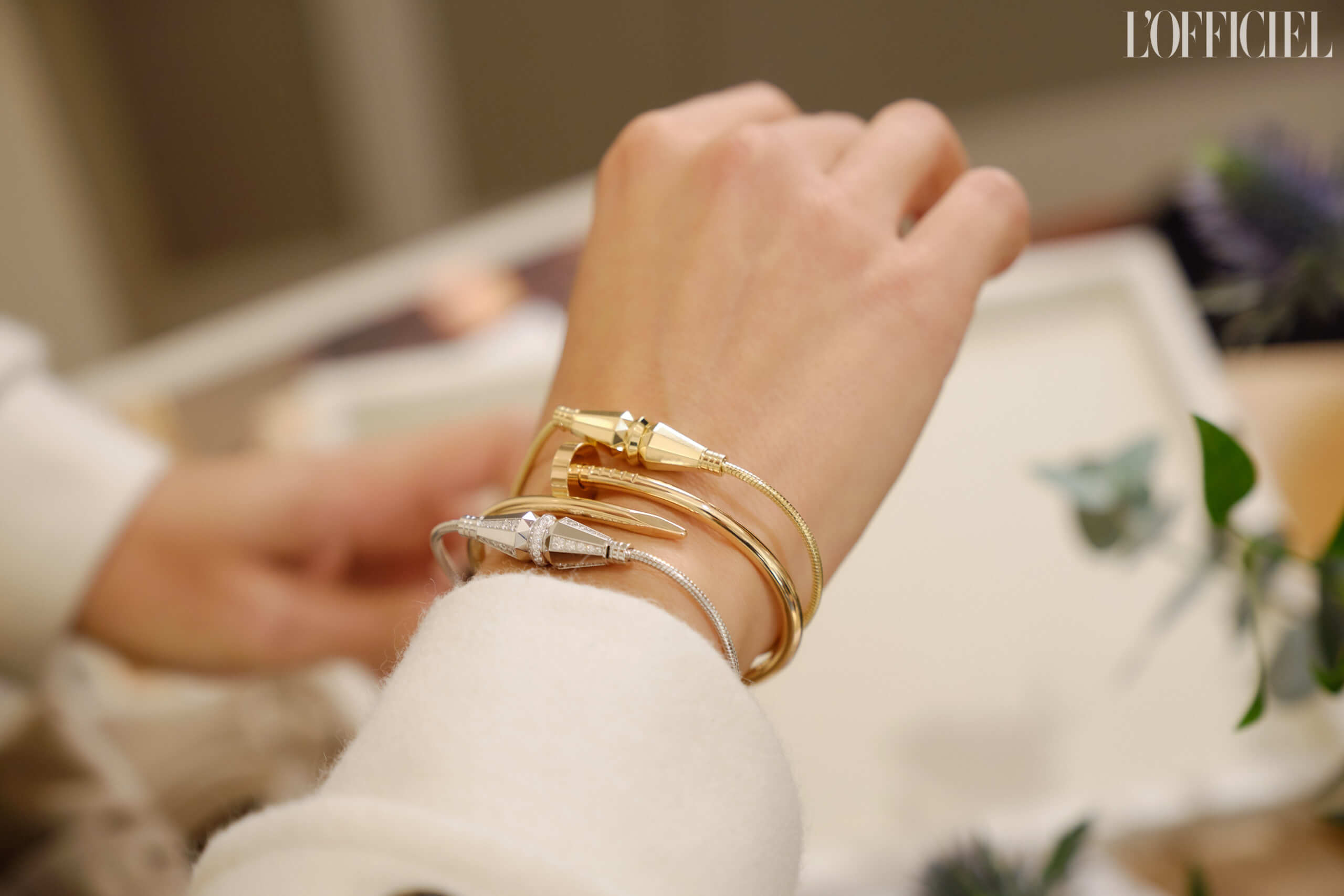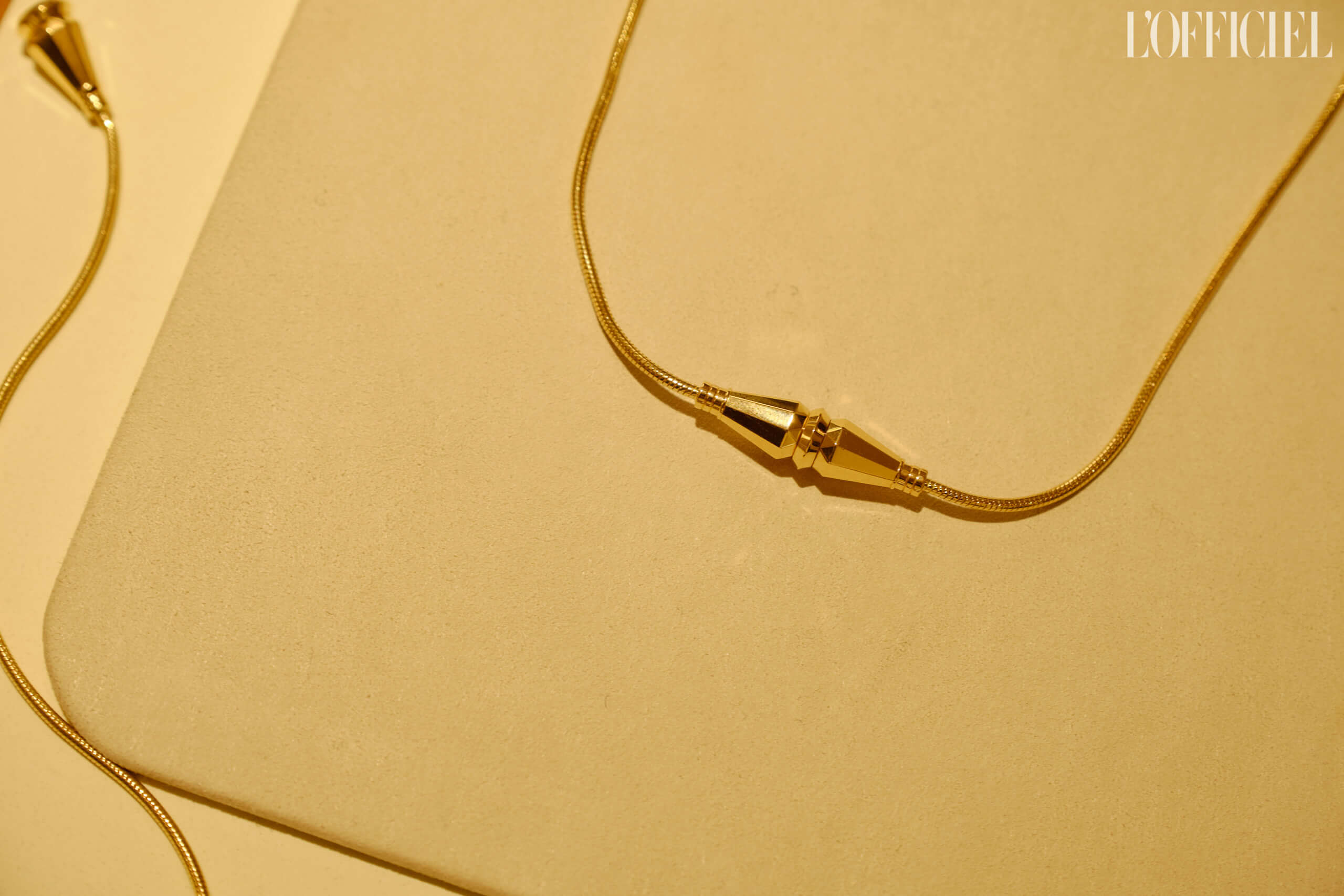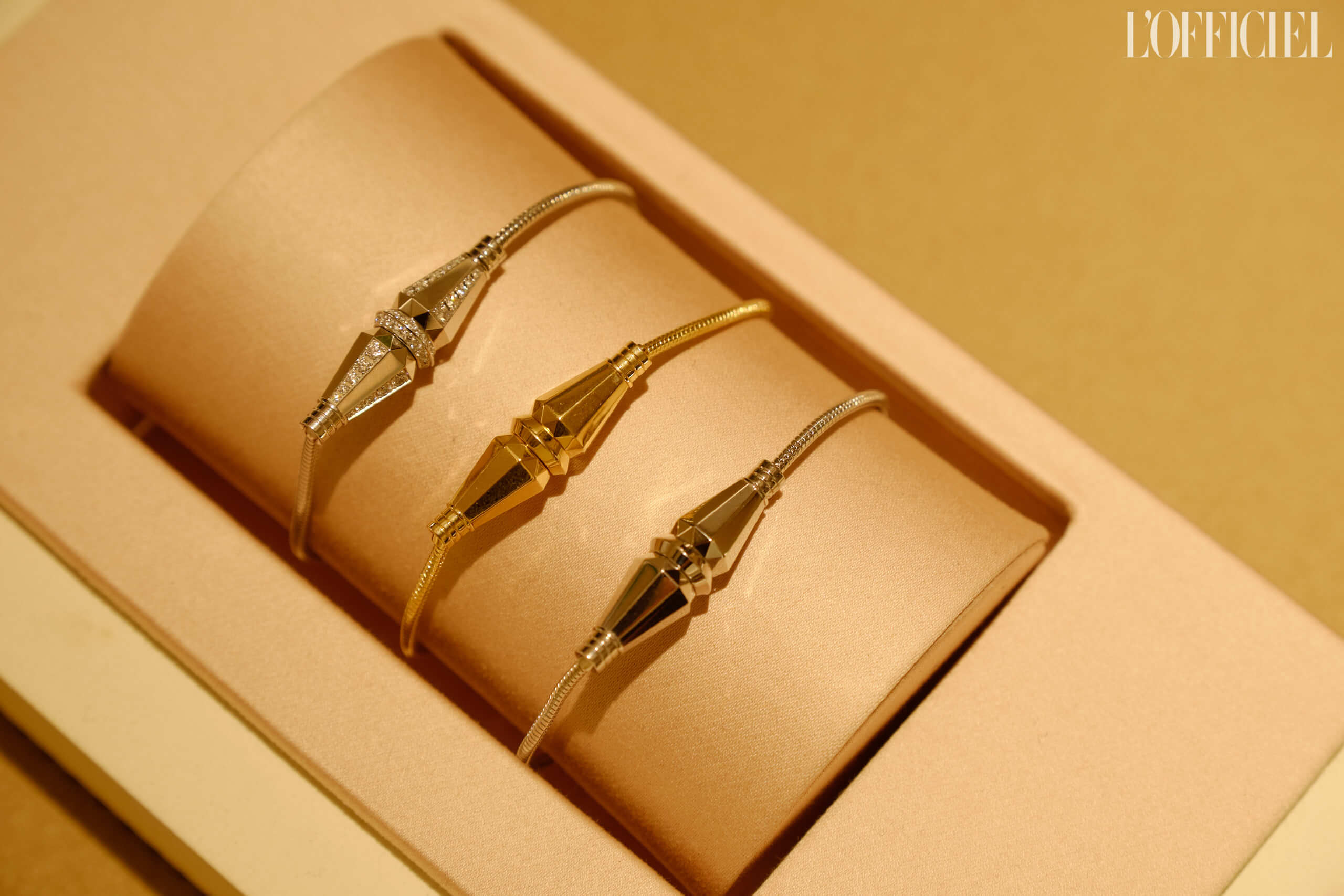 Браслеты и ожерелья доступны в белом и желтом золоте, а также с отделкой бриллиантами. У них есть три длины: стандартный браслет и цепи, которые можно обернуть вокруг руки три или шесть раз. Длина украшений регулируется и легко объединяется с другими изделиями коллекции.
