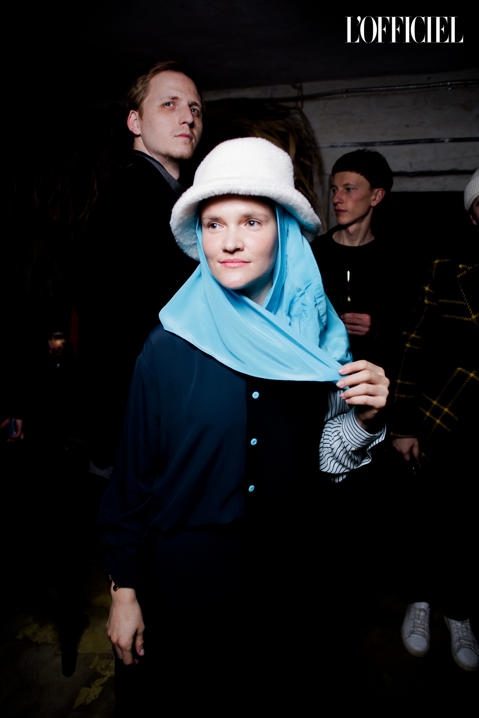 Оранжевая пальмовая ветка на пуховике вышита тамбурным швом, который встречается в рушниках Северной Украины, мини-платье с отложным воротником апаш, который напоминает крой винтажных анораков, по подолу прошито цепочкой — декор утяжеляет легкий "медузный" шелк. Конструкторская находка коллекции — вторая планка сорочки: можно оставить лететь шлейфом, а можно повязать на голову как платок.
