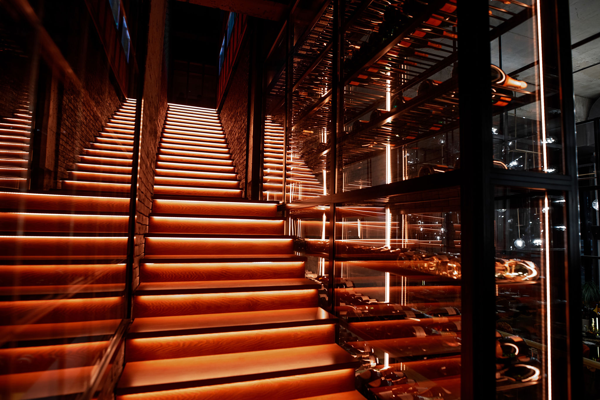На 2-м этаже комплекса Queen, где расположился новый ресторан, находятся 2 открытые шоу-кухни, где можно наблюдать за процессом приготовления блюд, итальянская и русская дровяные печи и ледник со свежими морепродуктами.
