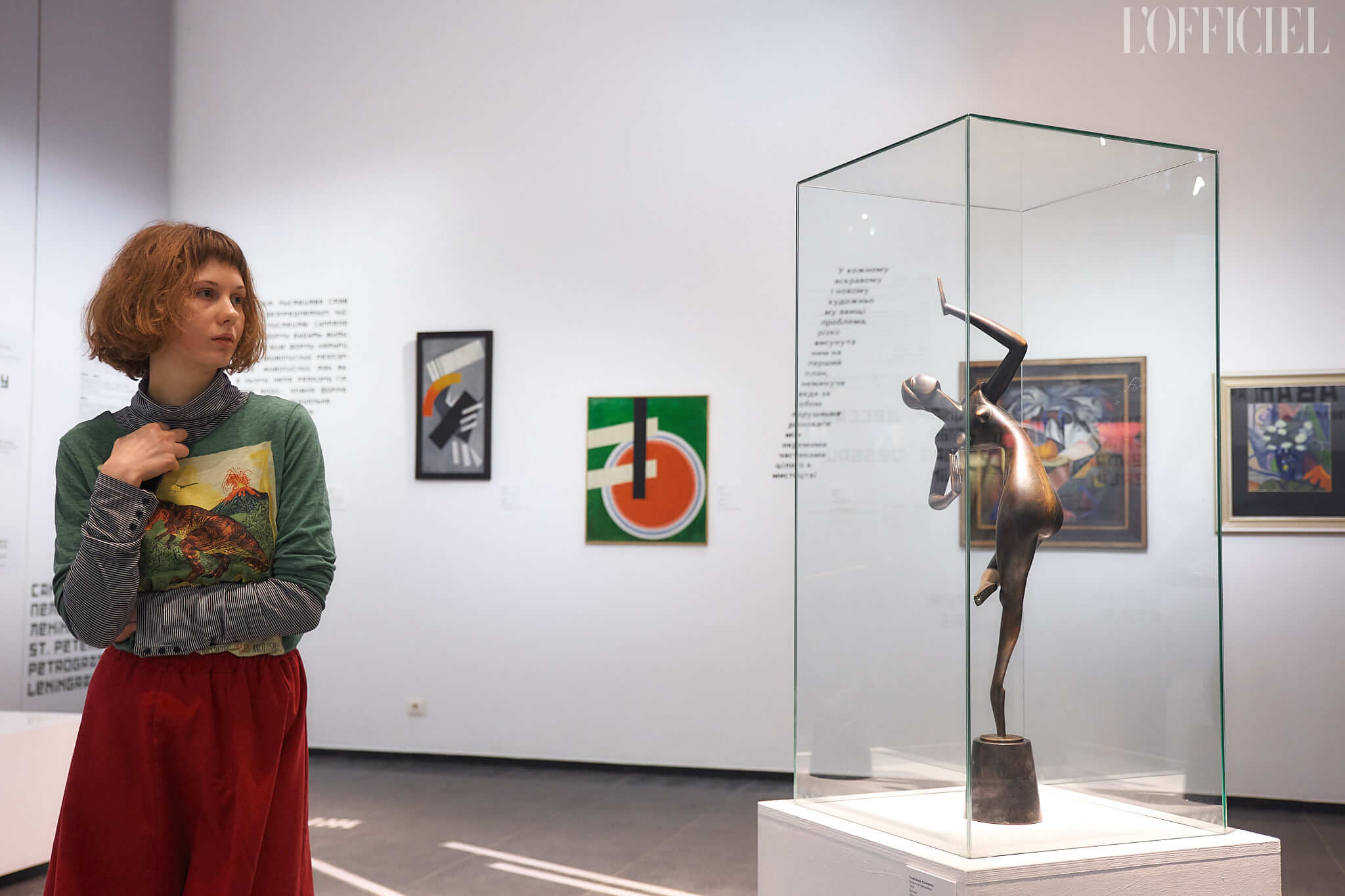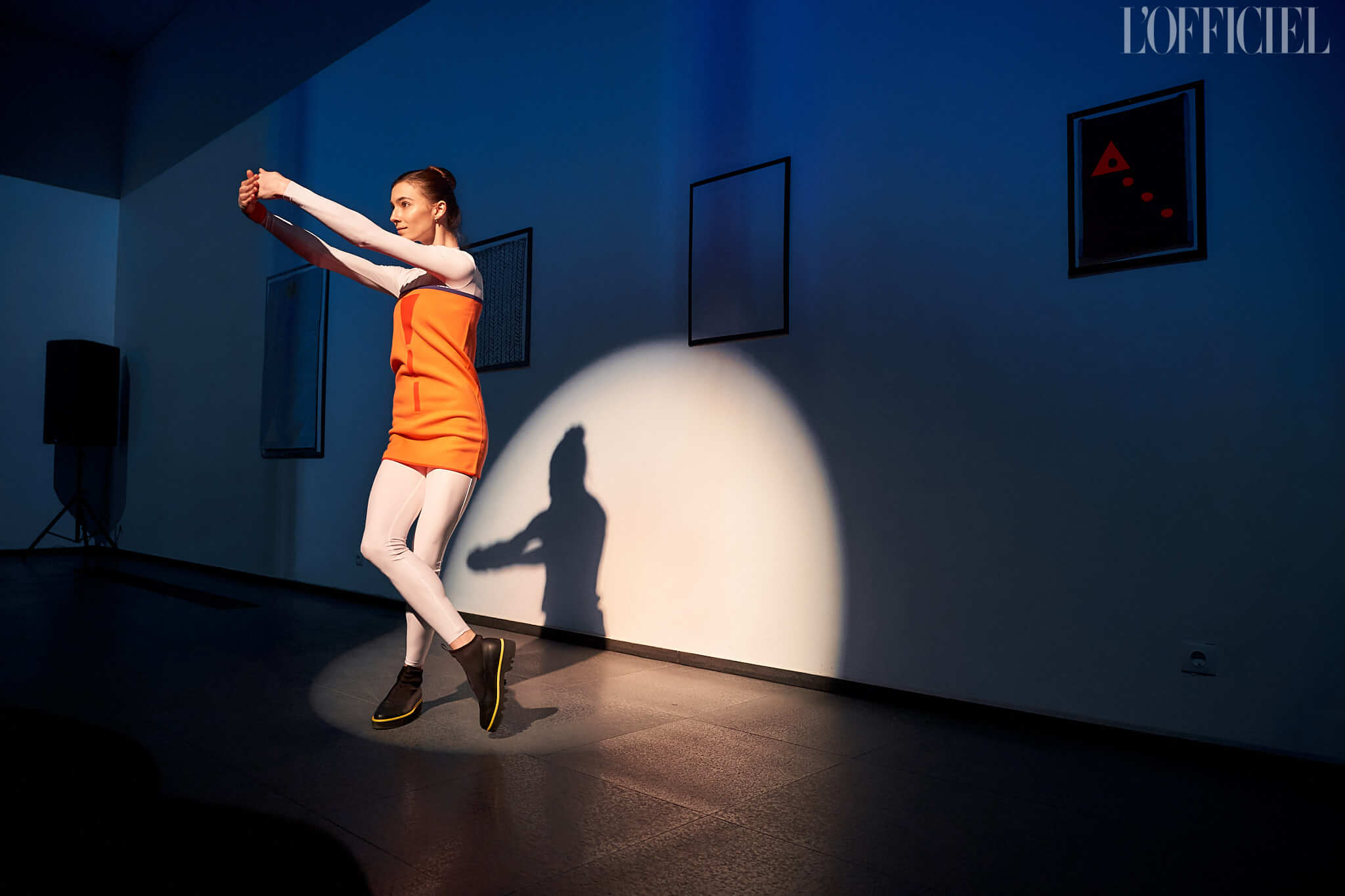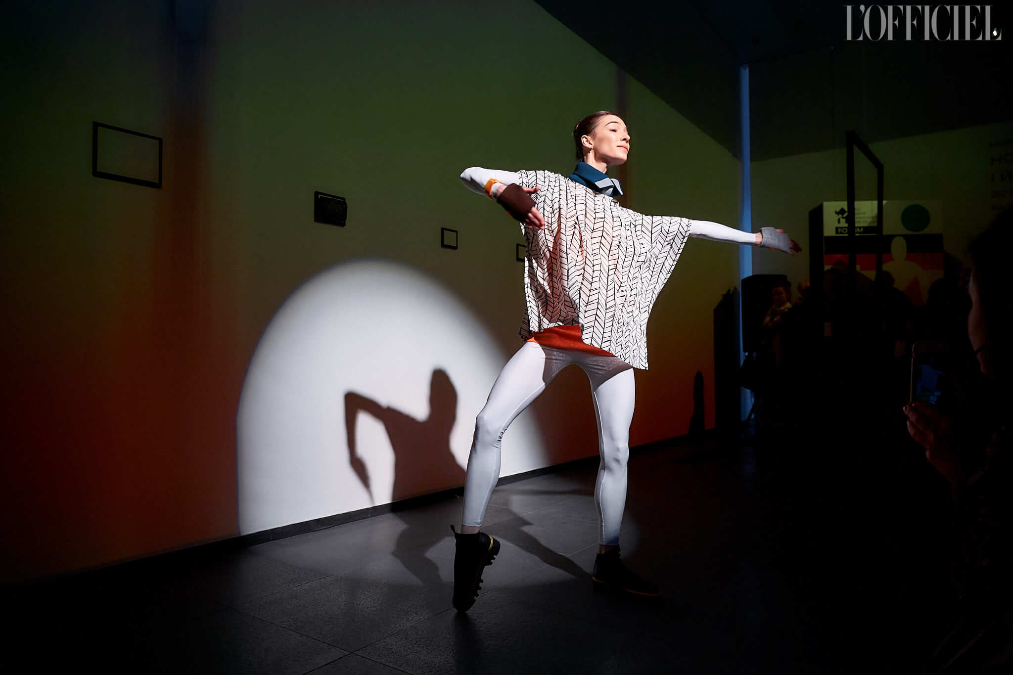 Гости презентации собрались в большом зале обновленного центра современного искусства М17 и рассматривали супрематические картины, в непривычном порядке развешенные на стене. В ожидании начала показа все старались занять место в центре зала, где были установлены высокие технические конструкции, — казалось, именно там будет происходить что-то важное, однако лучом мягкого света работник зала вдруг выхватил пустоту у стены с картинами и гостям пришлось как по команде выстроиться вдоль, чтобы увидеть происходящее. Под музыку композитора Джона Адамса из темноты вышла балерина в белоснежном трико и задумчиво, с интересом, начала разглядывать картины вместе со зрителями. Спустя несколько минут девушка, демонстрируя экспрессивный и завораживающий танец, начала подходить к каждой из картин и буквально вынимать содержимое из рамы. На глазах у восторженных и по-детски радостно удивленных гостей балерина надела на себя все картины по очереди — красный квадрат превратился в мини-платье, большое голубое полотно с разноцветными элементами, которое казалось до этого работой художника-авангардиста середины прошлого века, — в спортивный плащ на кулисках, а висевшие рядом крошечные картины одна за другой — в шейный платок, браслет и сумку.