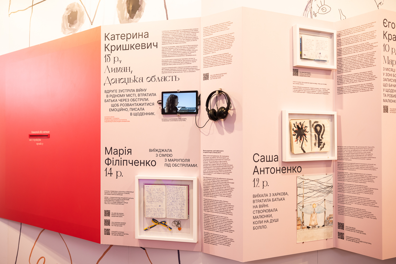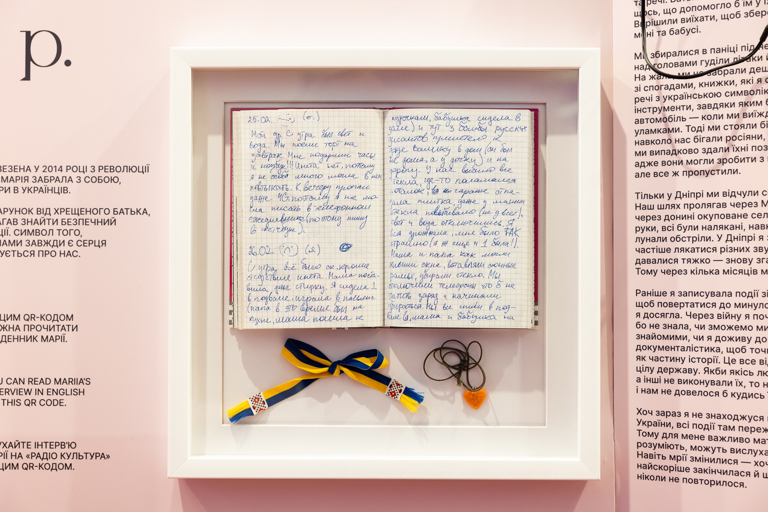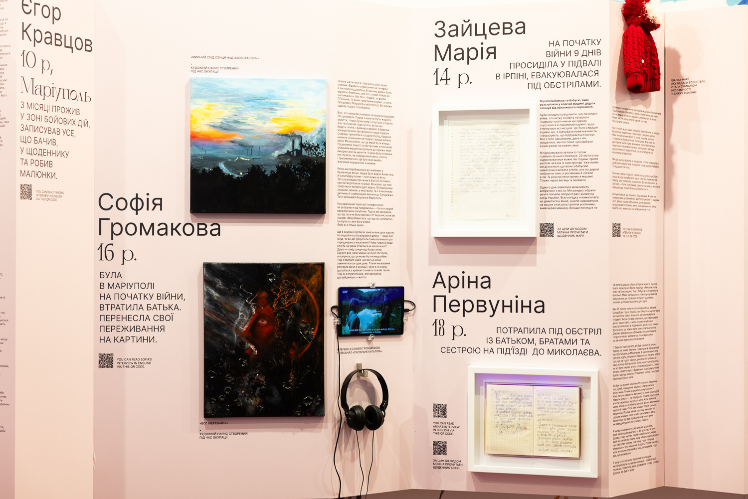 На виставці представлені дитячі щоденники, нотатки, малюнки та особисті речі українських дітей. Загалом виставка охоплює 14 зворушливих історій дітей з різних куточків України: Донеччини, Харківщини, Херсонщини, Київщини.