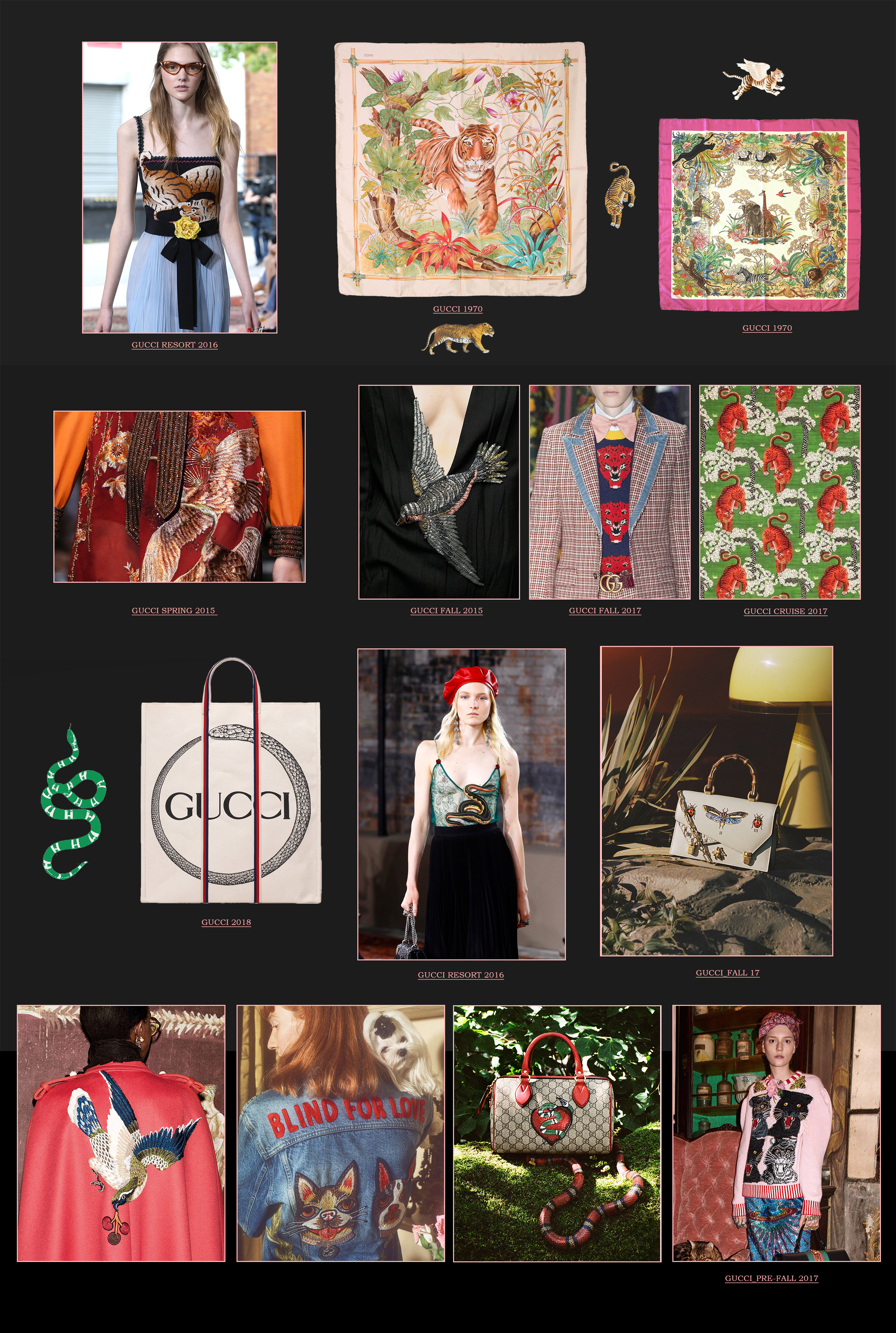 Если при Фриде Джаннини и до нее в коллекциях Gucci и появлялись животные, то в основном — насекомые: порхающие с платка на платок бабочки и жужжащие пчелы — знак благородства в Европе. С приходом Микеле все изменилось: он будто знал, что миллениалы и центениалы вырастут ярыми зоозащитниками и будут поклоняться кошкам. С революционного 2015-го на сумках, обуви, небольших аксессуарах, почти на каждой вещи из коллекций и даже в рекламных кампаниях развелся зоопарк. На изделиях мирно сосуществуют кошки с собаками, зебры с тиграми и змеи со сказочными драконами и птицами, а на съемках жирафы дружно гуляют с леопардами.