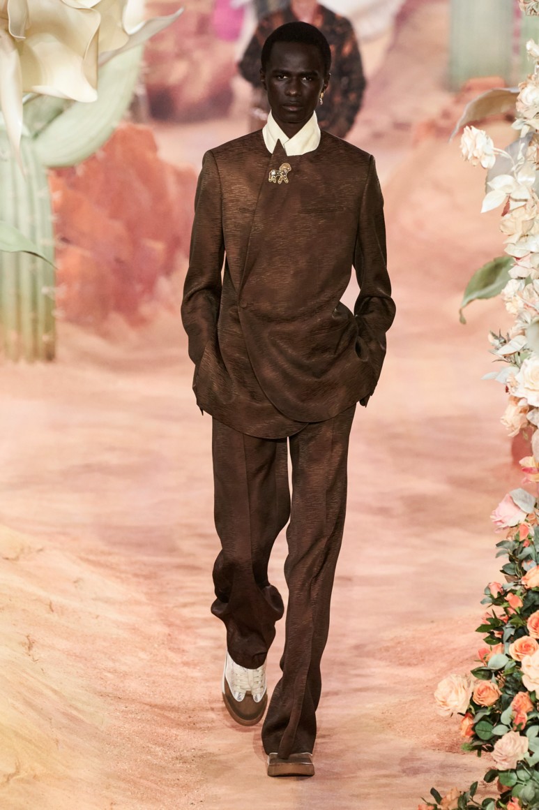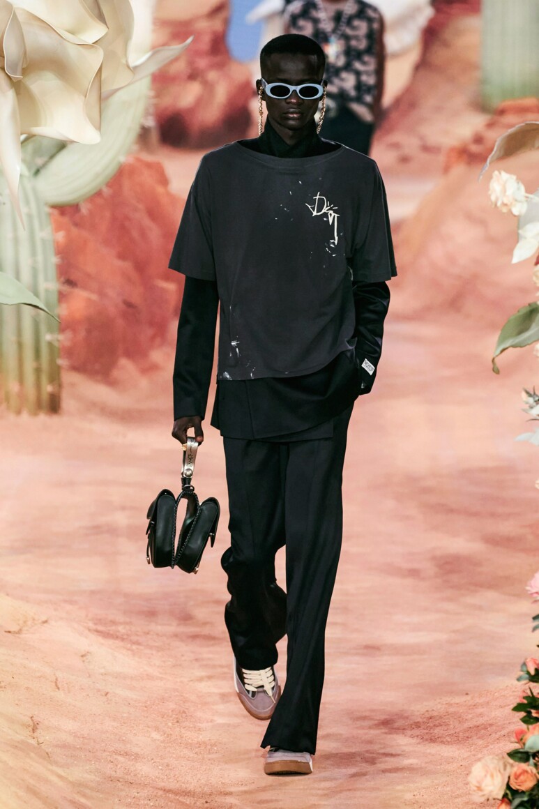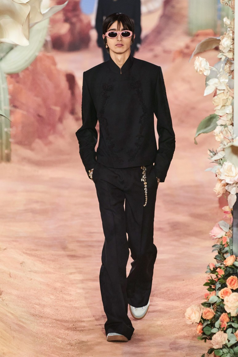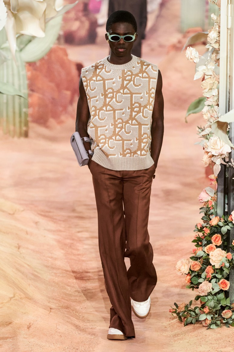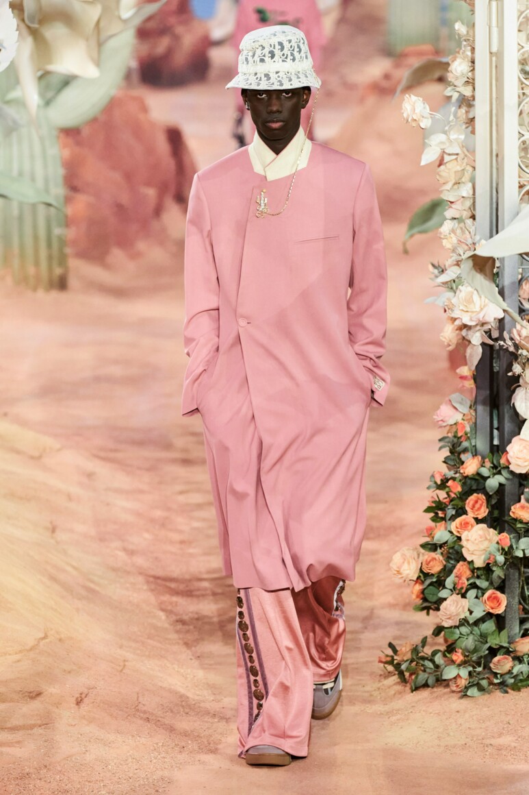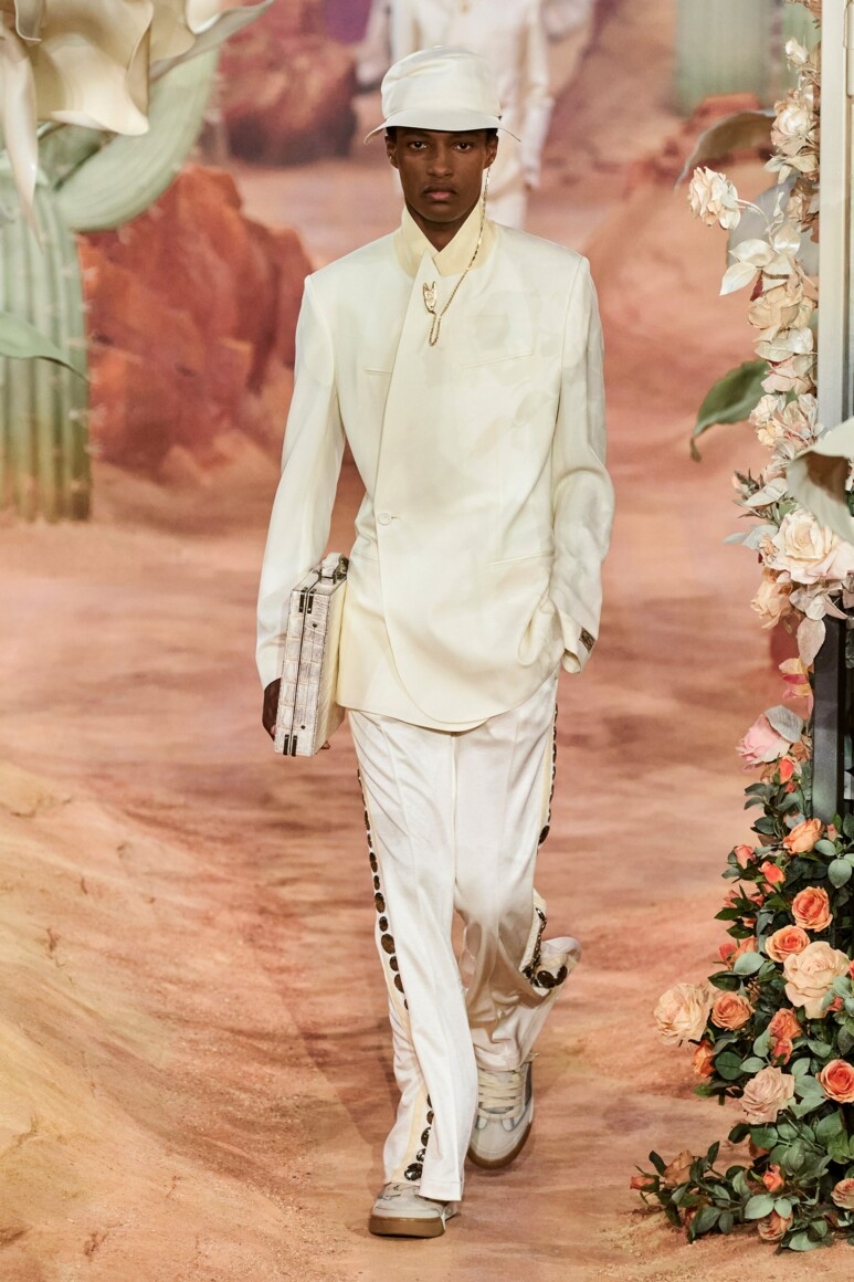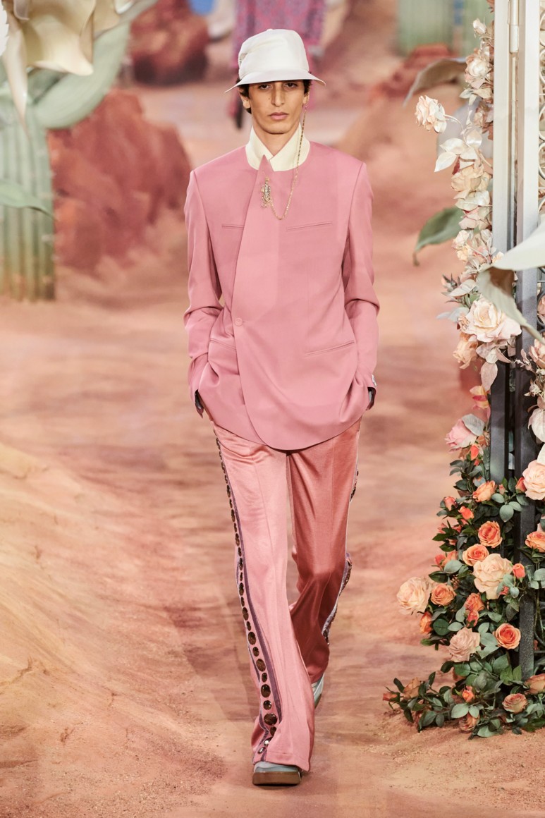 Новая коллекция Dior Men будто разделена на две полярные половины. В сет-дизайне шоу исполинские кактусы и обрамляющие подиум бутафорные каньоны аппелируют к родному штату рэпера — Техасу, а трёхметровые белые розы и садовые ворота — к заядлому флористу Кристиану Диору. Эта дуальность прослеживается и в самой одежде: элегантные классические силуэты и сдержанная палитра остаются за наследием Dior, а смелые приемы, яркие блоки и любовь к своде — за простым техасским парнем Тревисом, который также плодотворно поработал над логотипом бренда (самовольно перерисовав его), изменил монограмму Oblique, а сумку Saddle переместил на пояс и добавил массивные металические ручки. Палитра коллекции вторила пейзажу пустыни — розовый от нежного к глубокому темно-лиловому, коричневый, оттенки охры и пыльного аквамарина, и тотальный черный. В свою очередь, Ким Джонс показал нам идеальный тейлоринг с расклешенными силуэтами и любезно предоставил полную свободу своему творческому партнеру.