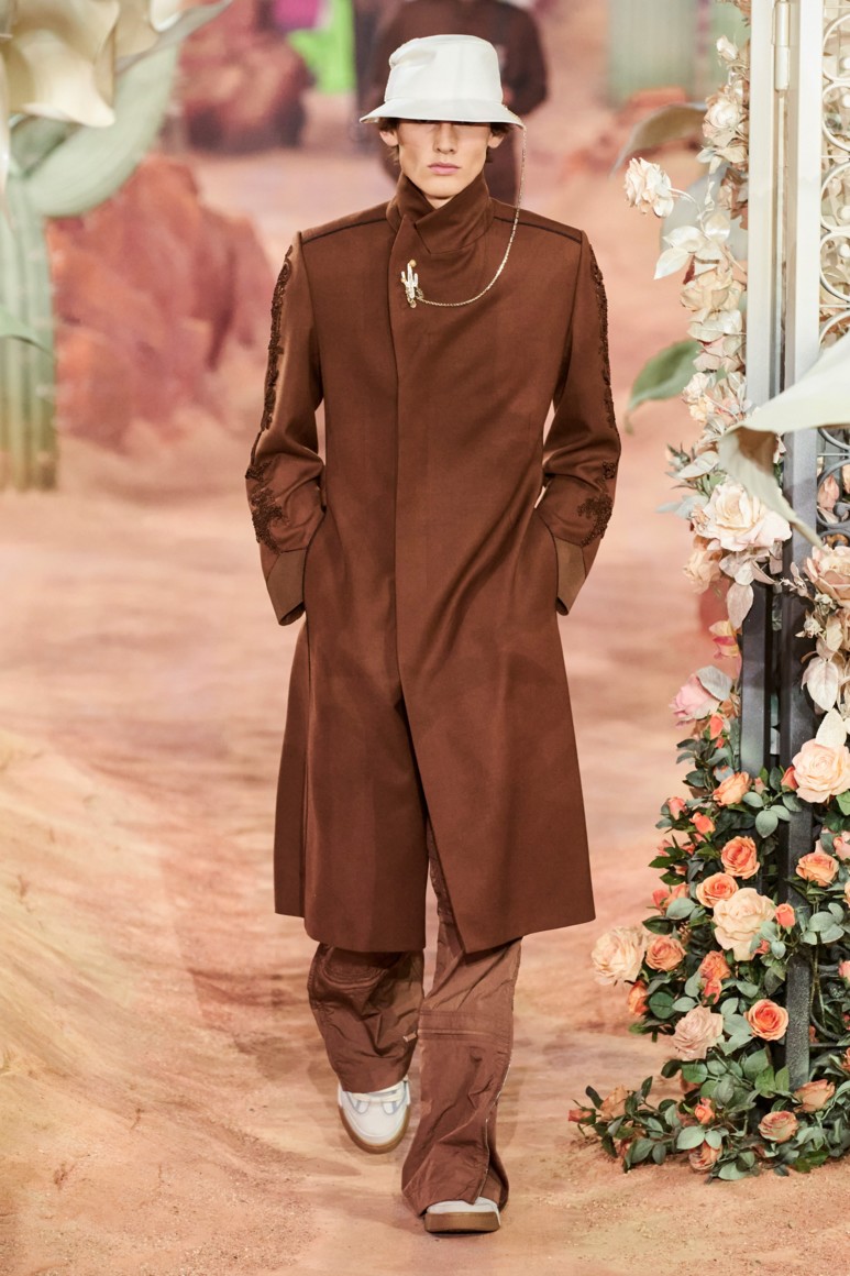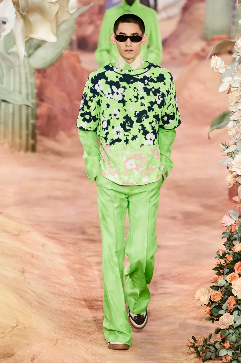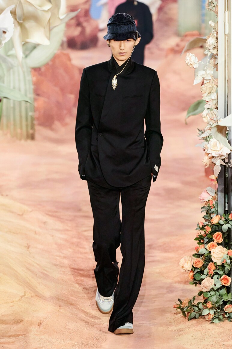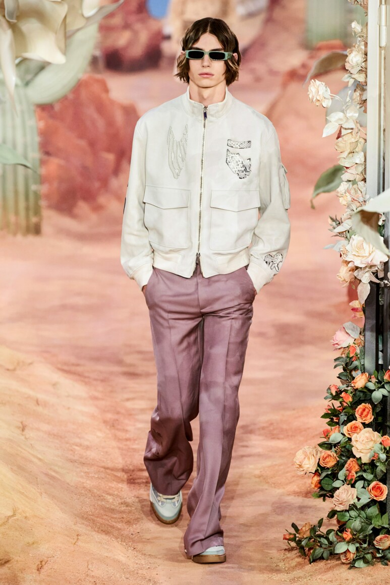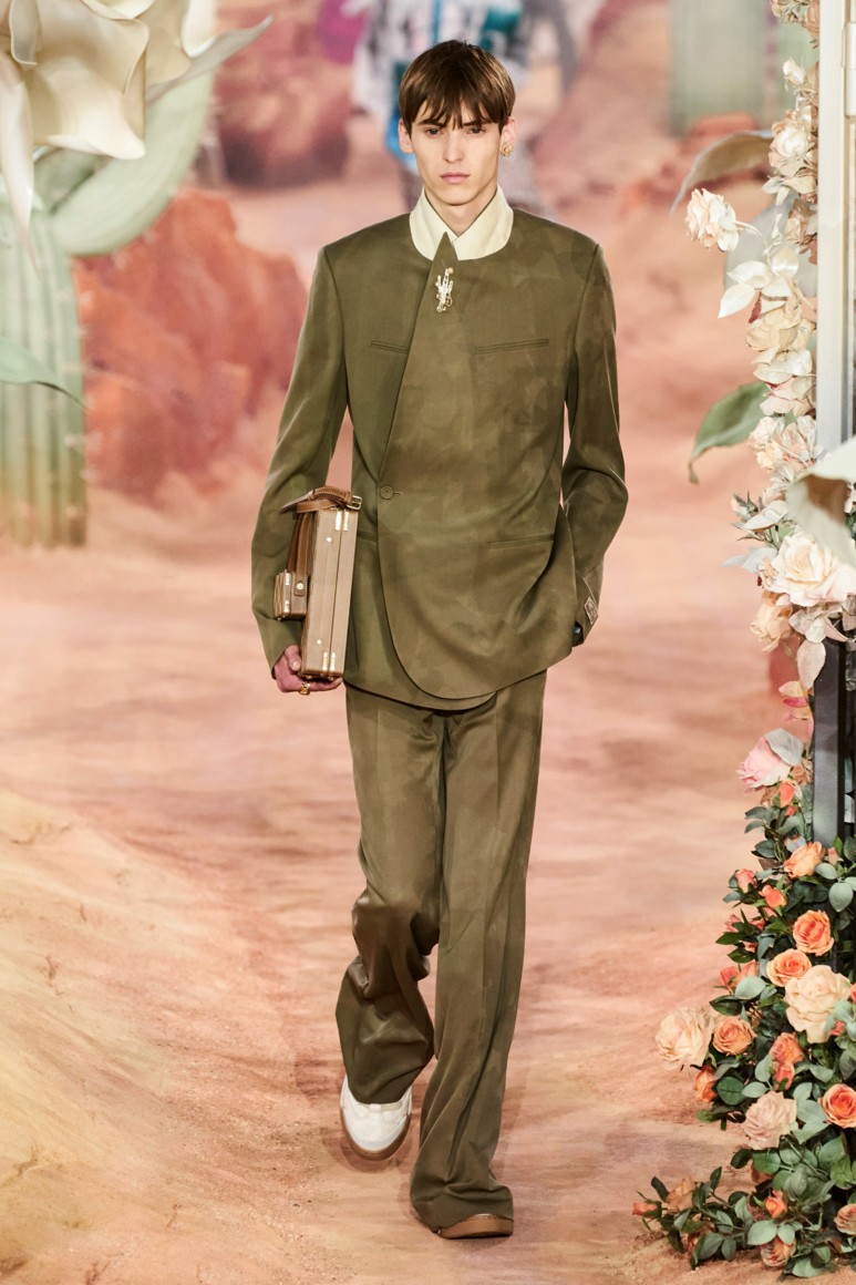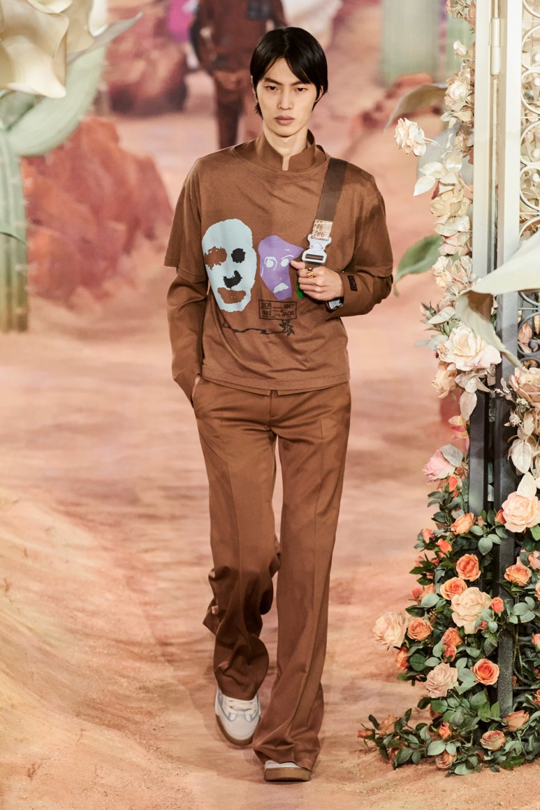 Новая коллекция Dior Men будто разделена на две полярные половины. В сет-дизайне шоу исполинские кактусы и обрамляющие подиум бутафорные каньоны аппелируют к родному штату рэпера — Техасу, а трёхметровые белые розы и садовые ворота — к заядлому флористу Кристиану Диору. Эта дуальность прослеживается и в самой одежде: элегантные классические силуэты и сдержанная палитра остаются за наследием Dior, а смелые приемы, яркие блоки и любовь к своде — за простым техасским парнем Тревисом, который также плодотворно поработал над логотипом бренда (самовольно перерисовав его), изменил монограмму Oblique, а сумку Saddle переместил на пояс и добавил массивные металические ручки. Палитра коллекции вторила пейзажу пустыни — розовый от нежного к глубокому темно-лиловому, коричневый, оттенки охры и пыльного аквамарина, и тотальный черный. В свою очередь, Ким Джонс показал нам идеальный тейлоринг с расклешенными силуэтами и любезно предоставил полную свободу своему творческому партнеру.
