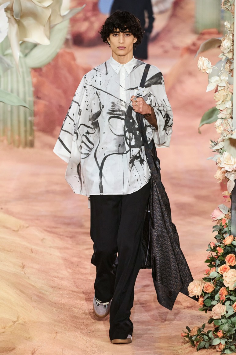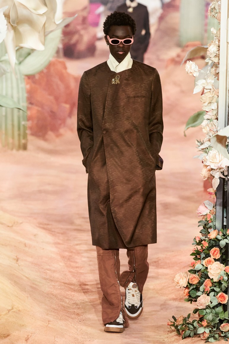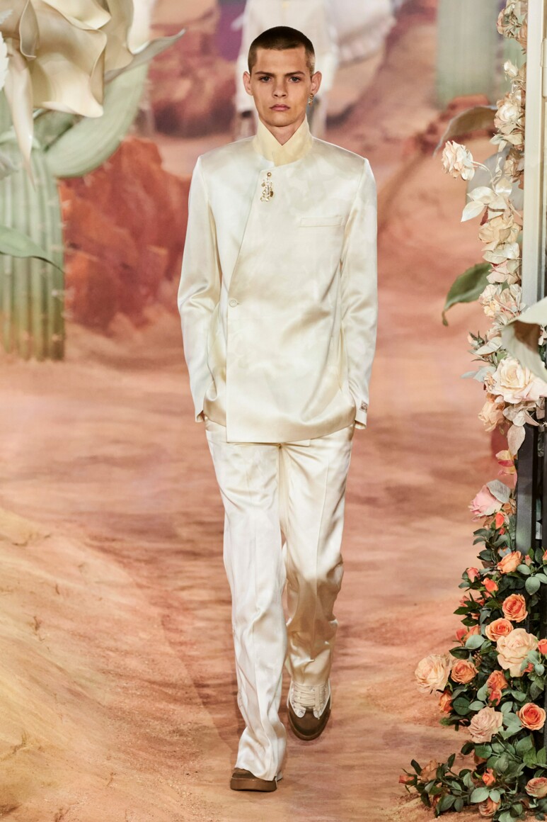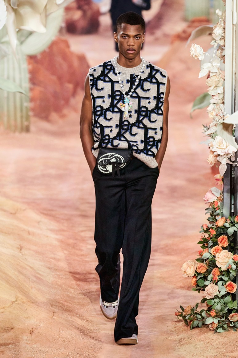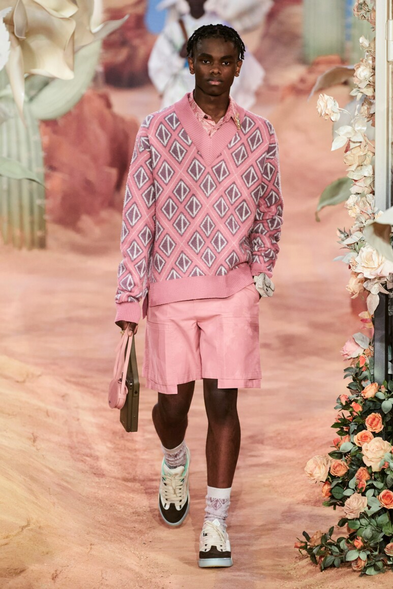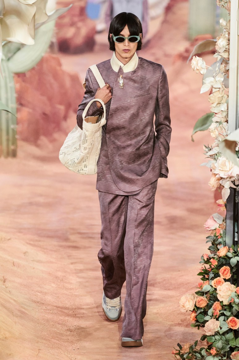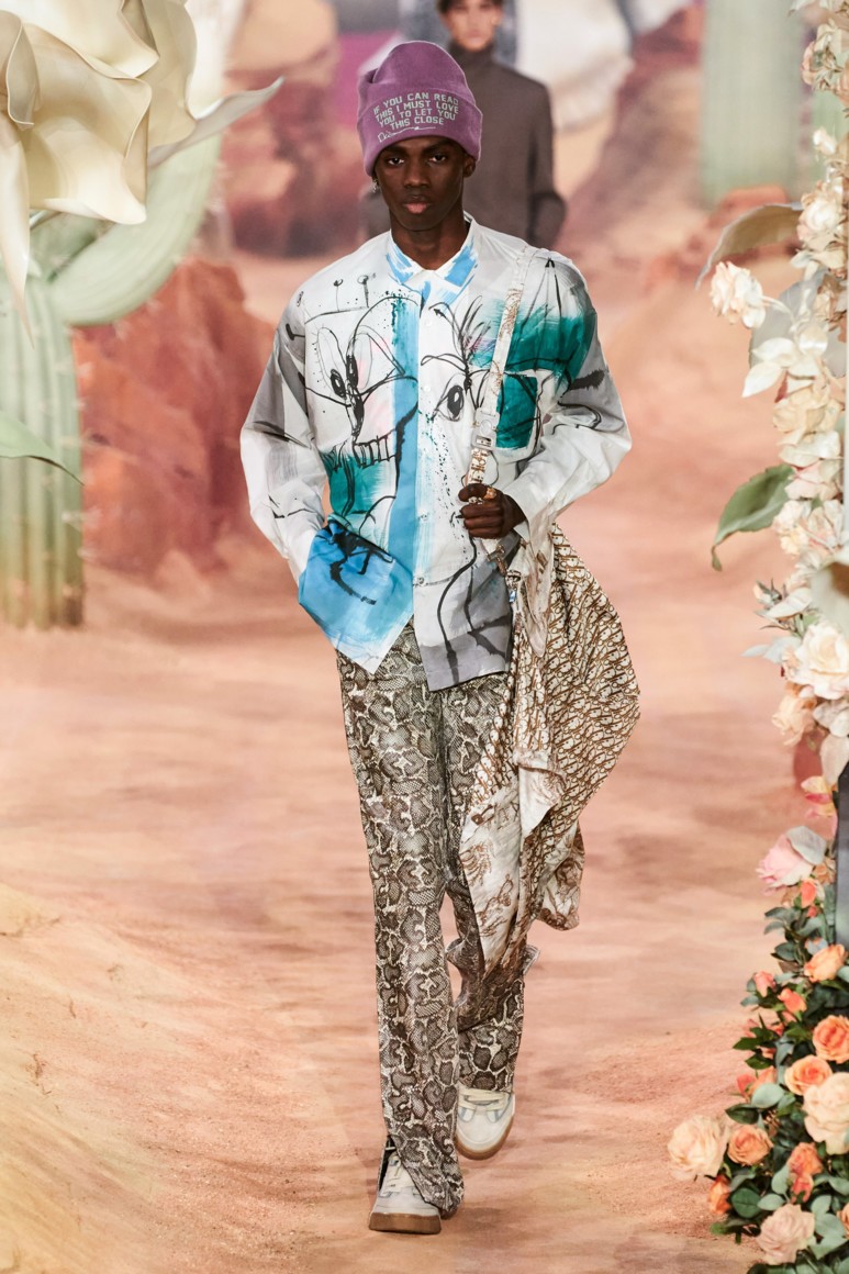 Новая коллекция Dior Men будто разделена на две полярные половины. В сет-дизайне шоу исполинские кактусы и обрамляющие подиум бутафорные каньоны аппелируют к родному штату рэпера — Техасу, а трёхметровые белые розы и садовые ворота — к заядлому флористу Кристиану Диору. Эта дуальность прослеживается и в самой одежде: элегантные классические силуэты и сдержанная палитра остаются за наследием Dior, а смелые приемы, яркие блоки и любовь к своде — за простым техасским парнем Тревисом, который также плодотворно поработал над логотипом бренда (самовольно перерисовав его), изменил монограмму Oblique, а сумку Saddle переместил на пояс и добавил массивные металические ручки. Палитра коллекции вторила пейзажу пустыни — розовый от нежного к глубокому темно-лиловому, коричневый, оттенки охры и пыльного аквамарина, и тотальный черный. В свою очередь, Ким Джонс показал нам идеальный тейлоринг с расклешенными силуэтами и любезно предоставил полную свободу своему творческому партнеру.
