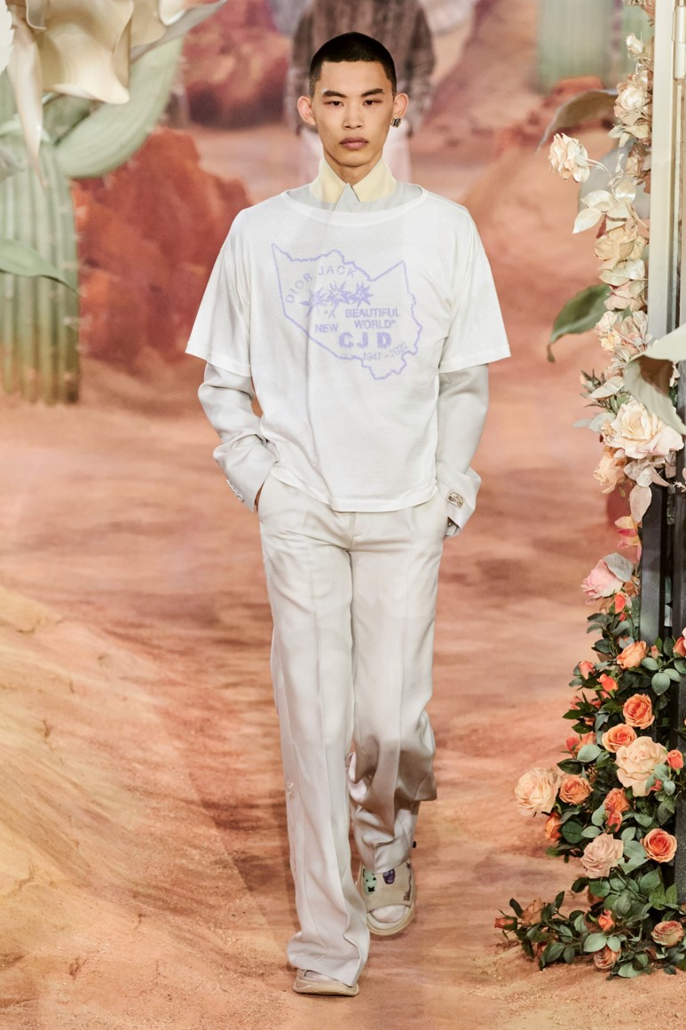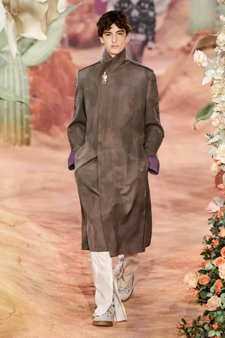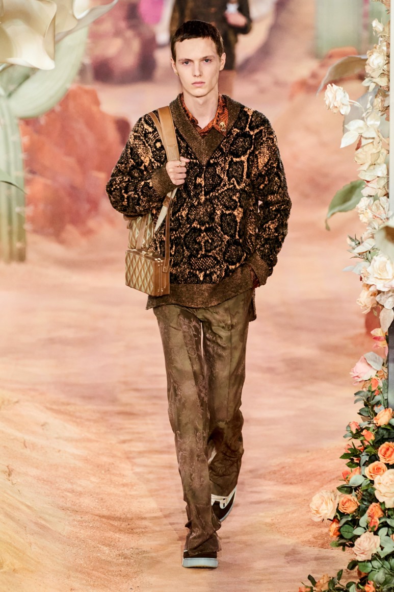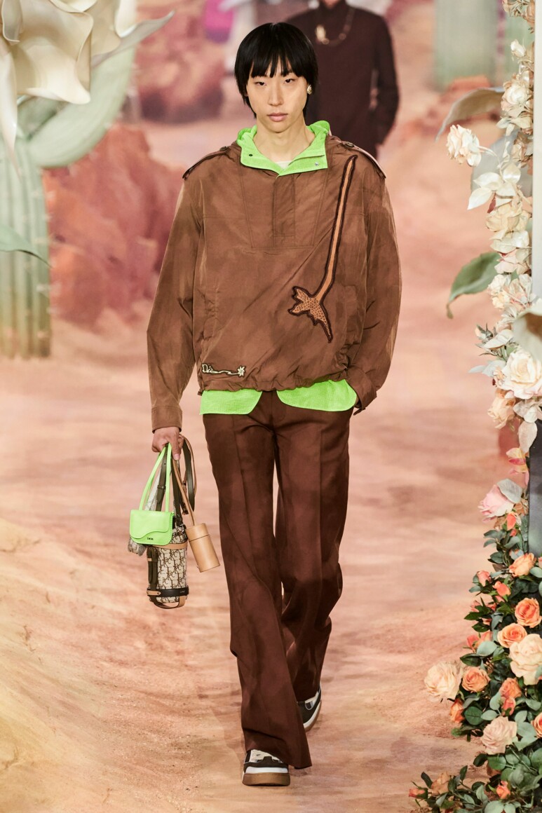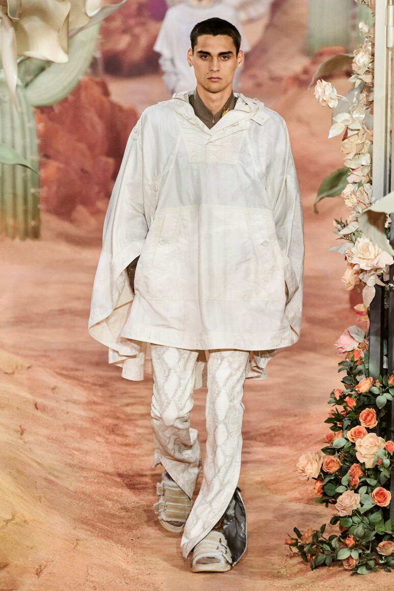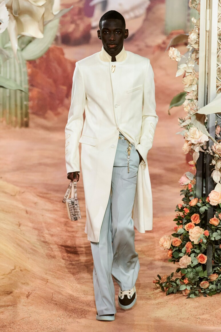 Новая коллекция Dior Men будто разделена на две полярные половины. В сет-дизайне шоу исполинские кактусы и обрамляющие подиум бутафорные каньоны аппелируют к родному штату рэпера — Техасу, а трёхметровые белые розы и садовые ворота — к заядлому флористу Кристиану Диору. Эта дуальность прослеживается и в самой одежде: элегантные классические силуэты и сдержанная палитра остаются за наследием Dior, а смелые приемы, яркие блоки и любовь к своде — за простым техасским парнем Тревисом, который также плодотворно поработал над логотипом бренда (самовольно перерисовав его), изменил монограмму Oblique, а сумку Saddle переместил на пояс и добавил массивные металические ручки. Палитра коллекции вторила пейзажу пустыни — розовый от нежного к глубокому темно-лиловому, коричневый, оттенки охры и пыльного аквамарина, и тотальный черный. В свою очередь, Ким Джонс показал нам идеальный тейлоринг с расклешенными силуэтами и любезно предоставил полную свободу своему творческому партнеру.