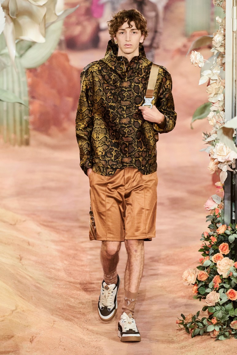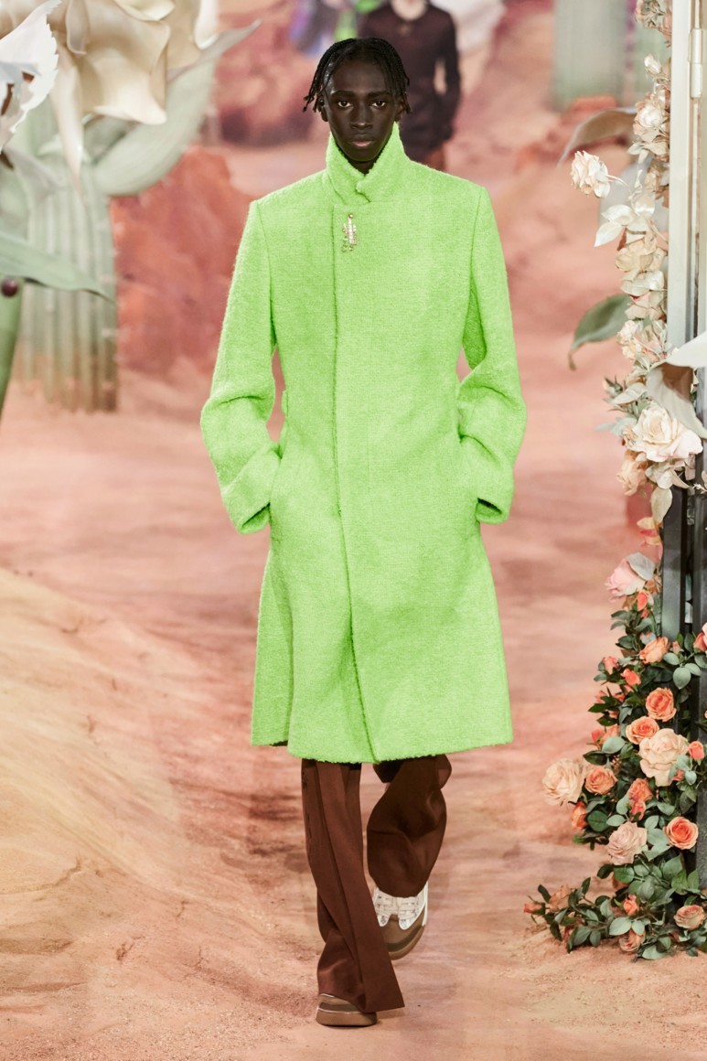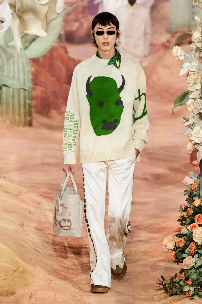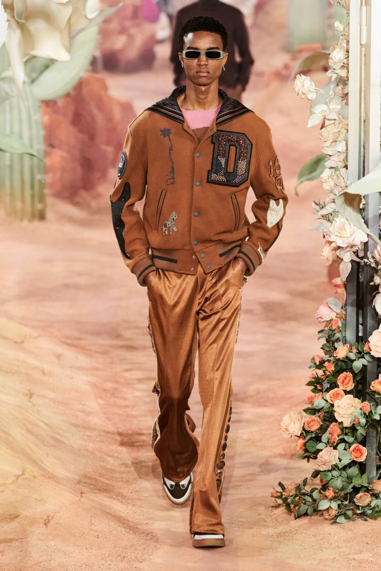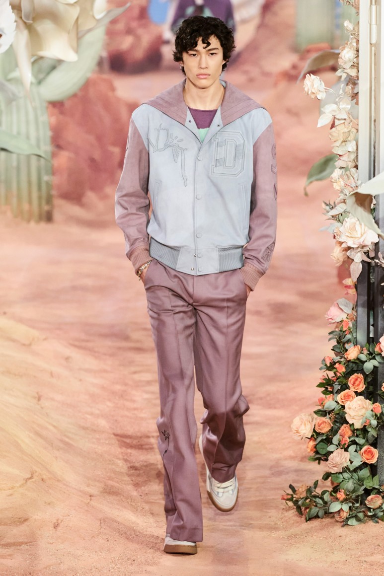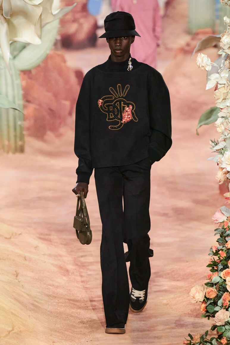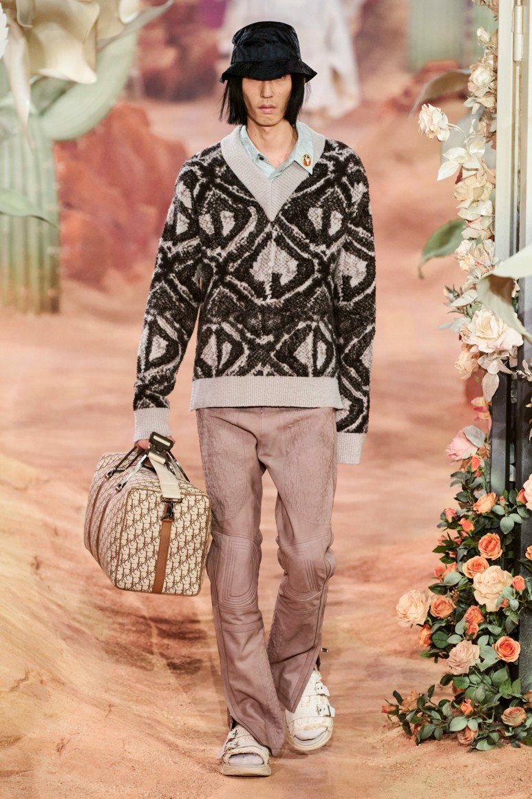 Новая коллекция Dior Men будто разделена на две полярные половины. В сет-дизайне шоу исполинские кактусы и обрамляющие подиум бутафорные каньоны аппелируют к родному штату рэпера — Техасу, а трёхметровые белые розы и садовые ворота — к заядлому флористу Кристиану Диору. Эта дуальность прослеживается и в самой одежде: элегантные классические силуэты и сдержанная палитра остаются за наследием Dior, а смелые приемы, яркие блоки и любовь к своде — за простым техасским парнем Тревисом, который также плодотворно поработал над логотипом бренда (самовольно перерисовав его), изменил монограмму Oblique, а сумку Saddle переместил на пояс и добавил массивные металические ручки. Палитра коллекции вторила пейзажу пустыни — розовый от нежного к глубокому темно-лиловому, коричневый, оттенки охры и пыльного аквамарина, и тотальный черный. В свою очередь, Ким Джонс показал нам идеальный тейлоринг с расклешенными силуэтами и любезно предоставил полную свободу своему творческому партнеру.