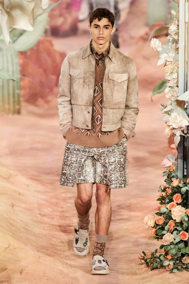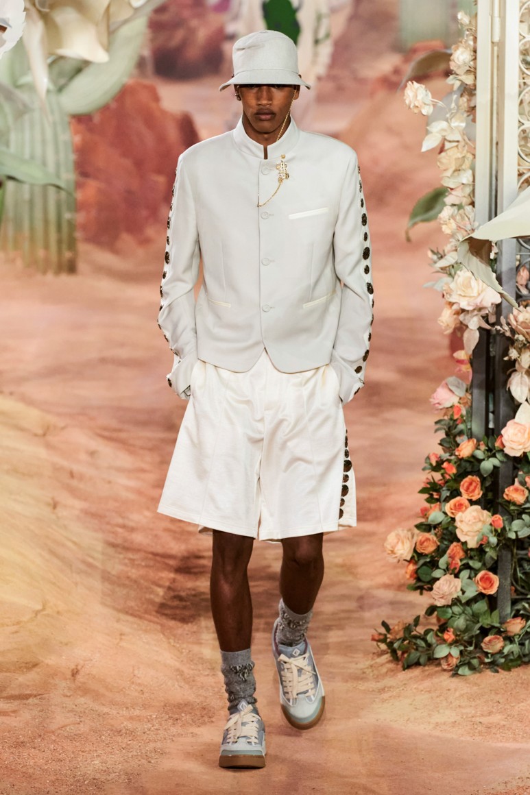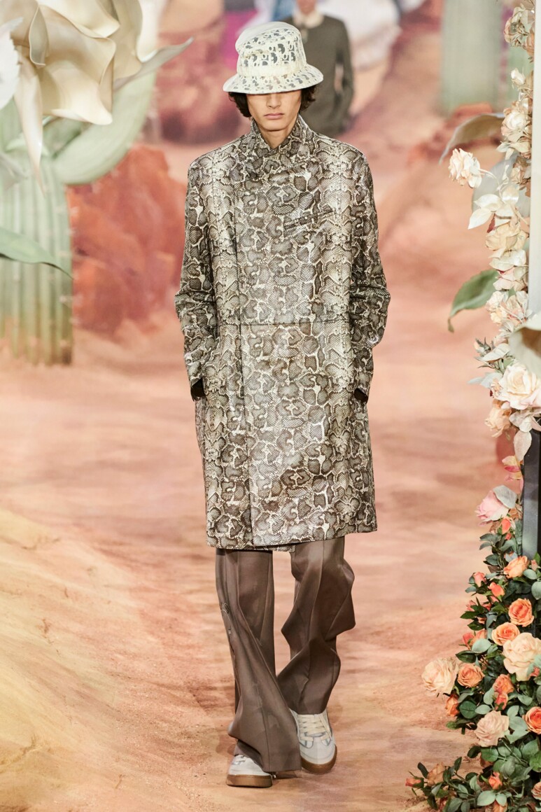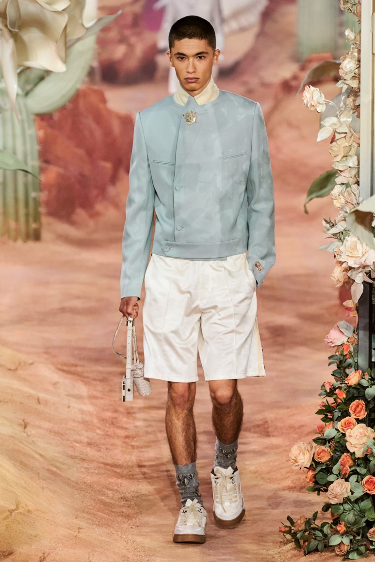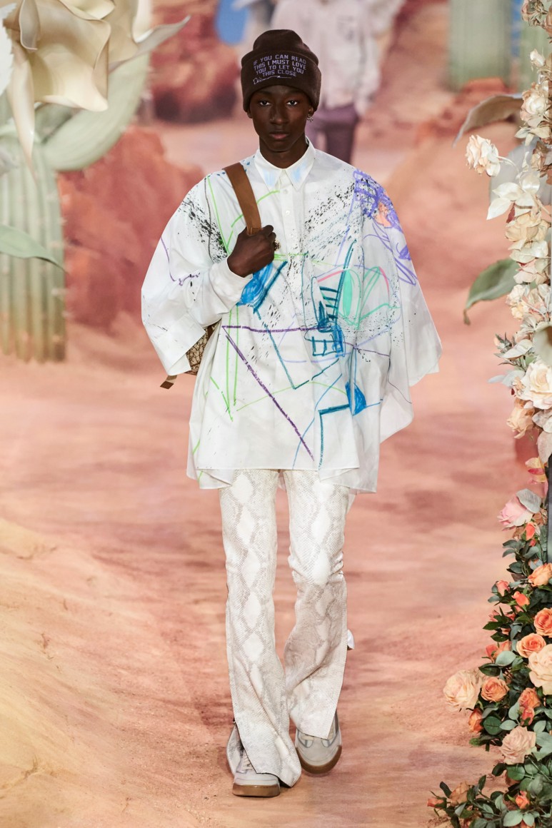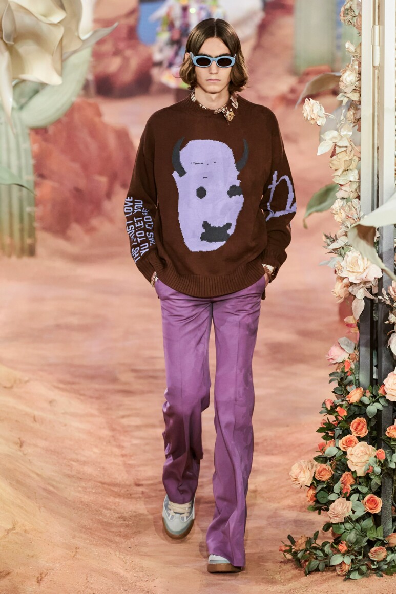 Новая коллекция Dior Men будто разделена на две полярные половины. В сет-дизайне шоу исполинские кактусы и обрамляющие подиум бутафорные каньоны аппелируют к родному штату рэпера — Техасу, а трёхметровые белые розы и садовые ворота — к заядлому флористу Кристиану Диору. Эта дуальность прослеживается и в самой одежде: элегантные классические силуэты и сдержанная палитра остаются за наследием Dior, а смелые приемы, яркие блоки и любовь к своде — за простым техасским парнем Тревисом, который также плодотворно поработал над логотипом бренда (самовольно перерисовав его), изменил монограмму Oblique, а сумку Saddle переместил на пояс и добавил массивные металические ручки. Палитра коллекции вторила пейзажу пустыни — розовый от нежного к глубокому темно-лиловому, коричневый, оттенки охры и пыльного аквамарина, и тотальный черный. В свою очередь, Ким Джонс показал нам идеальный тейлоринг с расклешенными силуэтами и любезно предоставил полную свободу своему творческому партнеру.