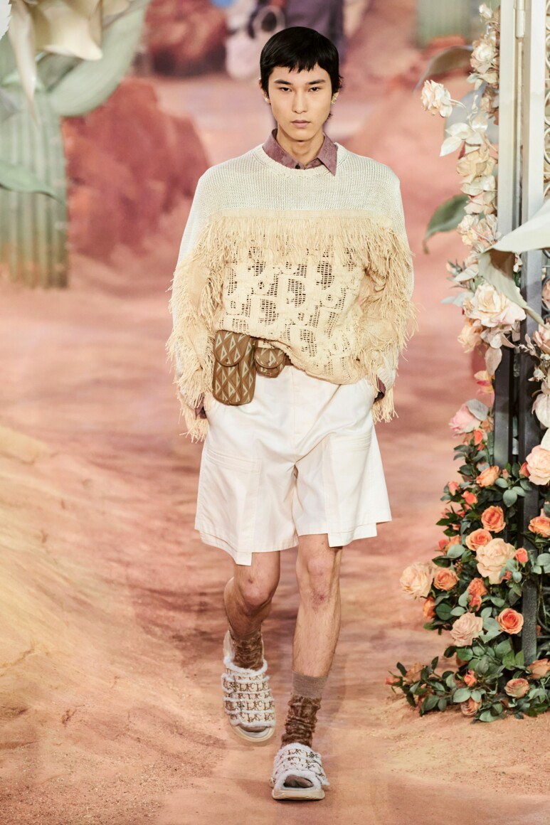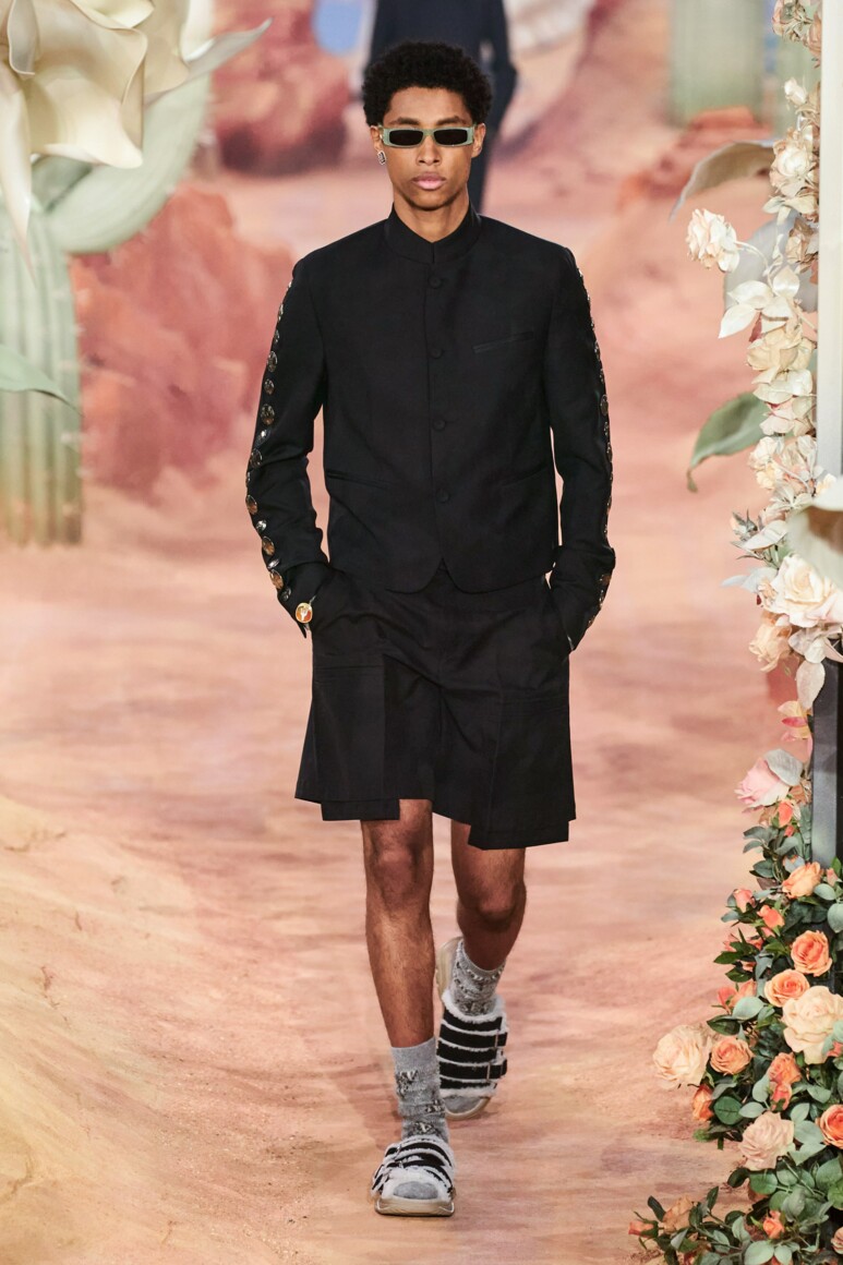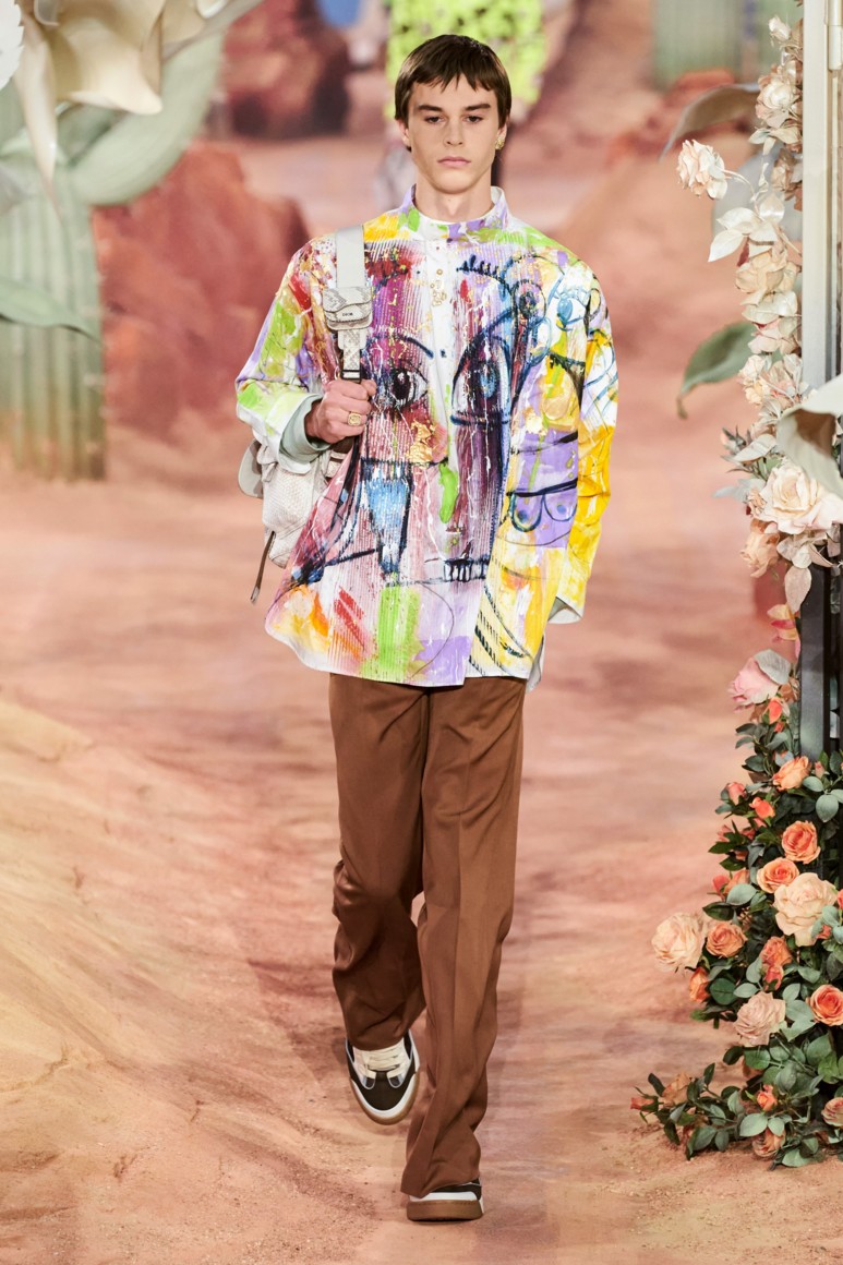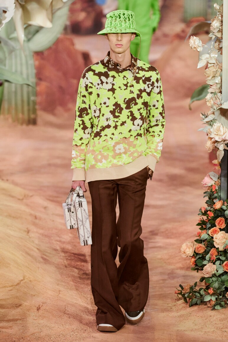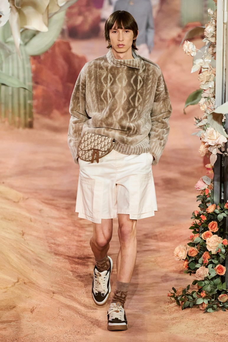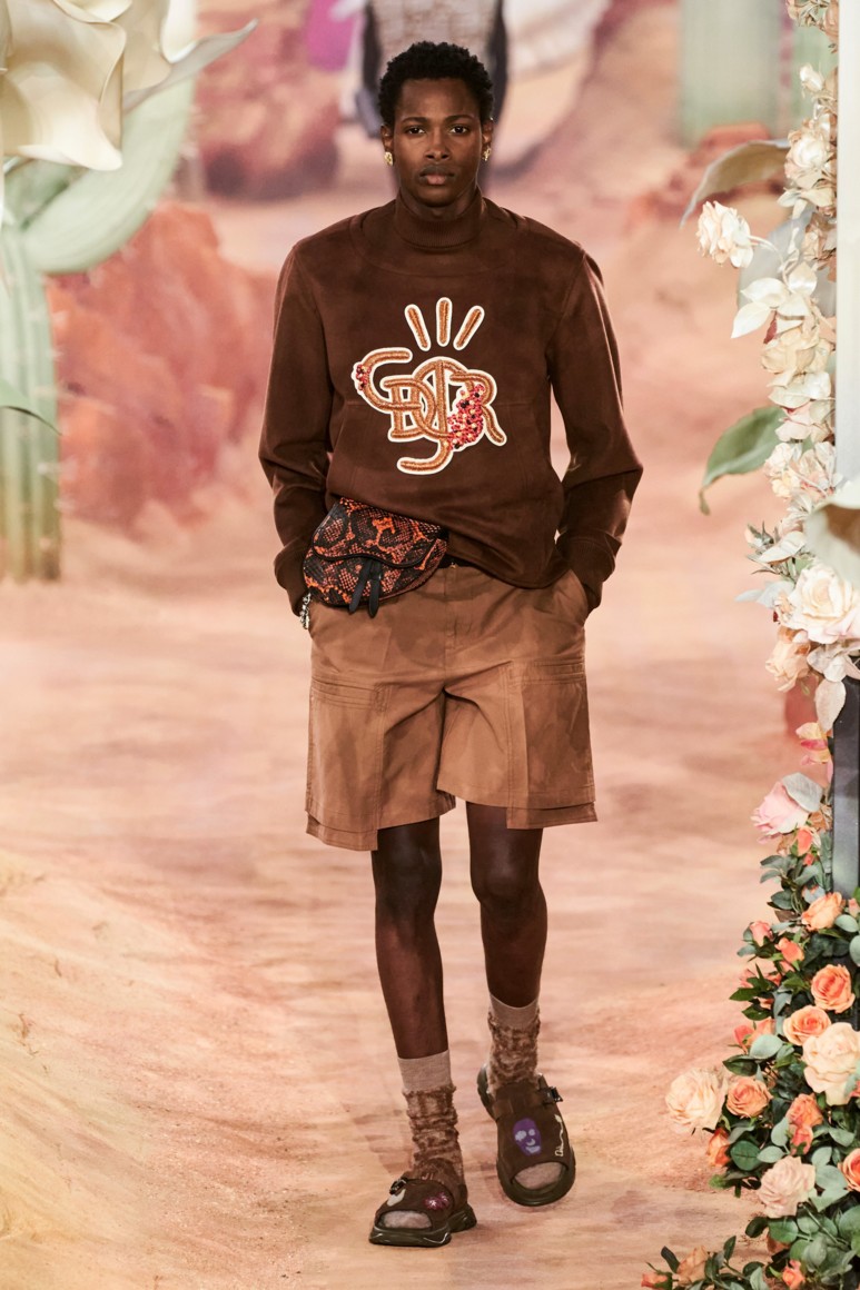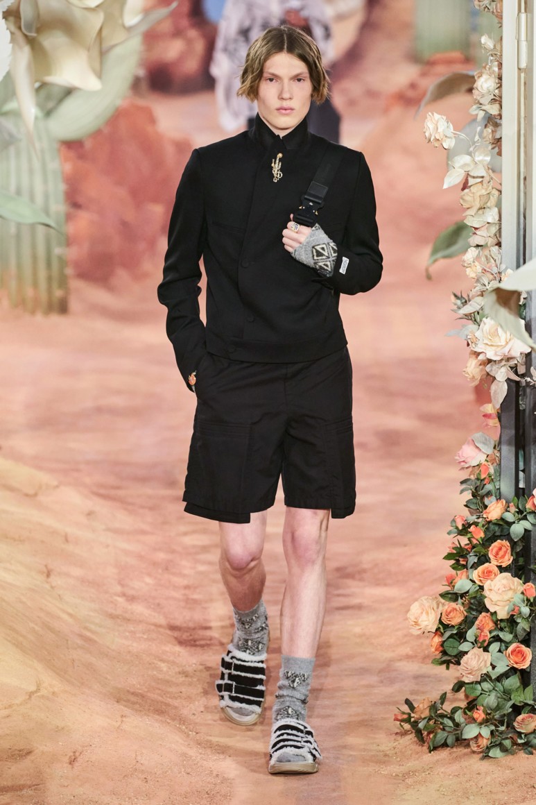 Новая коллекция Dior Men будто разделена на две полярные половины. В сет-дизайне шоу исполинские кактусы и обрамляющие подиум бутафорные каньоны аппелируют к родному штату рэпера — Техасу, а трёхметровые белые розы и садовые ворота — к заядлому флористу Кристиану Диору. Эта дуальность прослеживается и в самой одежде: элегантные классические силуэты и сдержанная палитра остаются за наследием Dior, а смелые приемы, яркие блоки и любовь к своде — за простым техасским парнем Тревисом, который также плодотворно поработал над логотипом бренда (самовольно перерисовав его), изменил монограмму Oblique, а сумку Saddle переместил на пояс и добавил массивные металические ручки. Палитра коллекции вторила пейзажу пустыни — розовый от нежного к глубокому темно-лиловому, коричневый, оттенки охры и пыльного аквамарина, и тотальный черный. В свою очередь, Ким Джонс показал нам идеальный тейлоринг с расклешенными силуэтами и любезно предоставил полную свободу своему творческому партнеру.