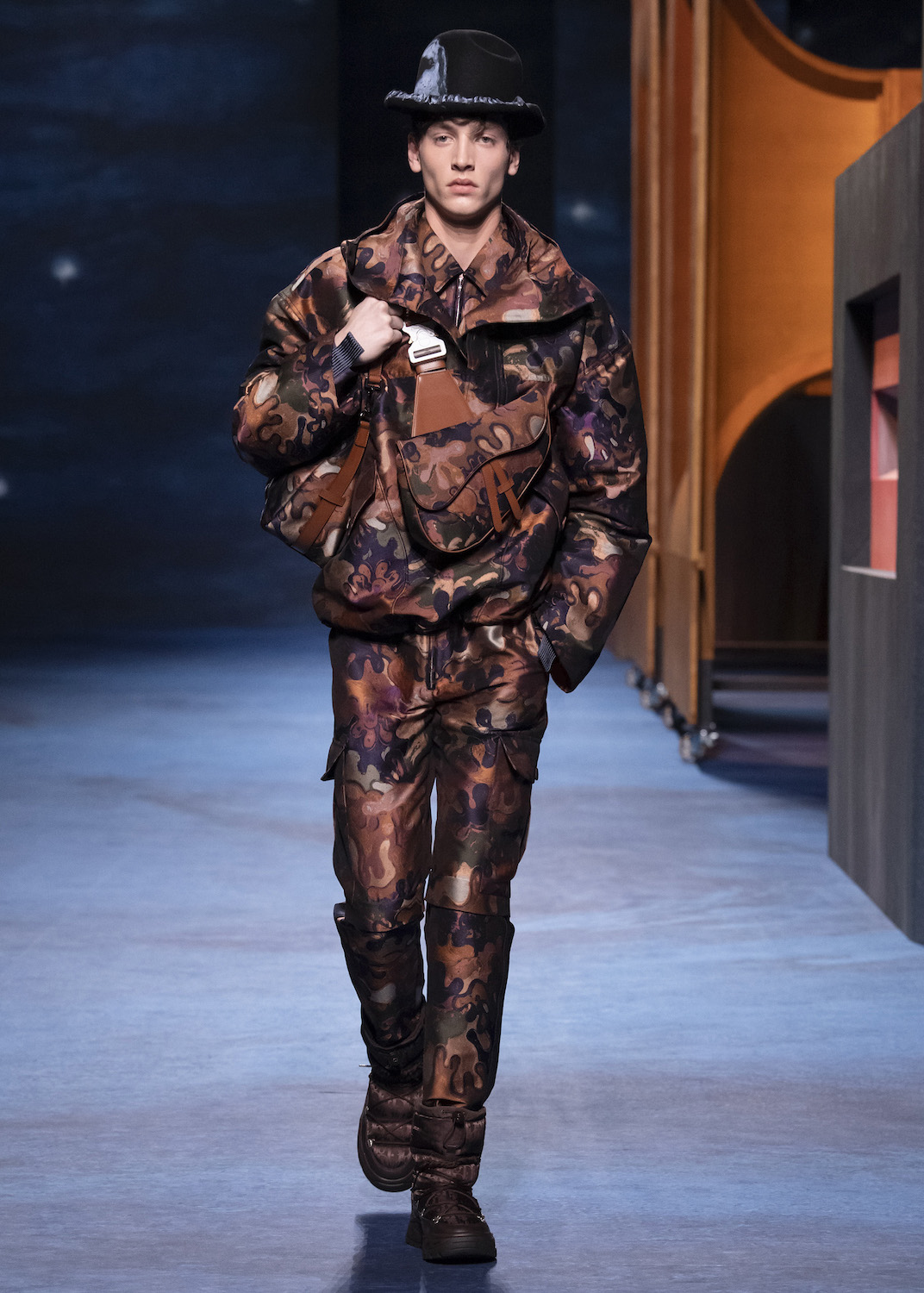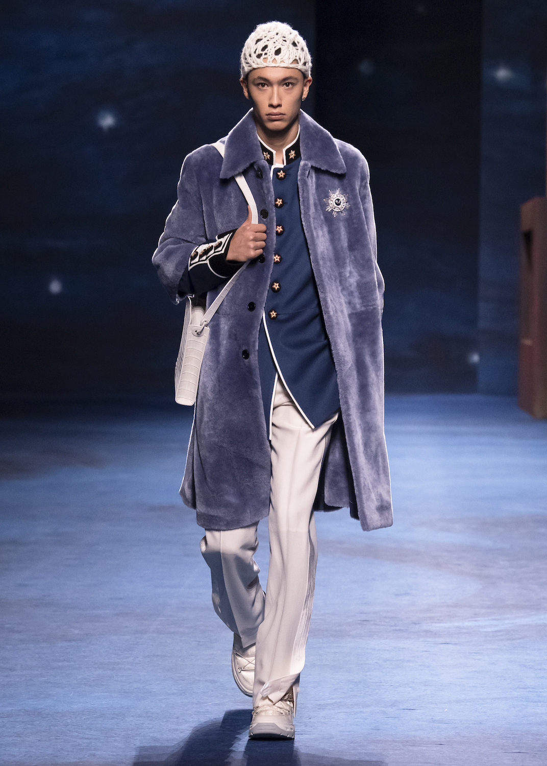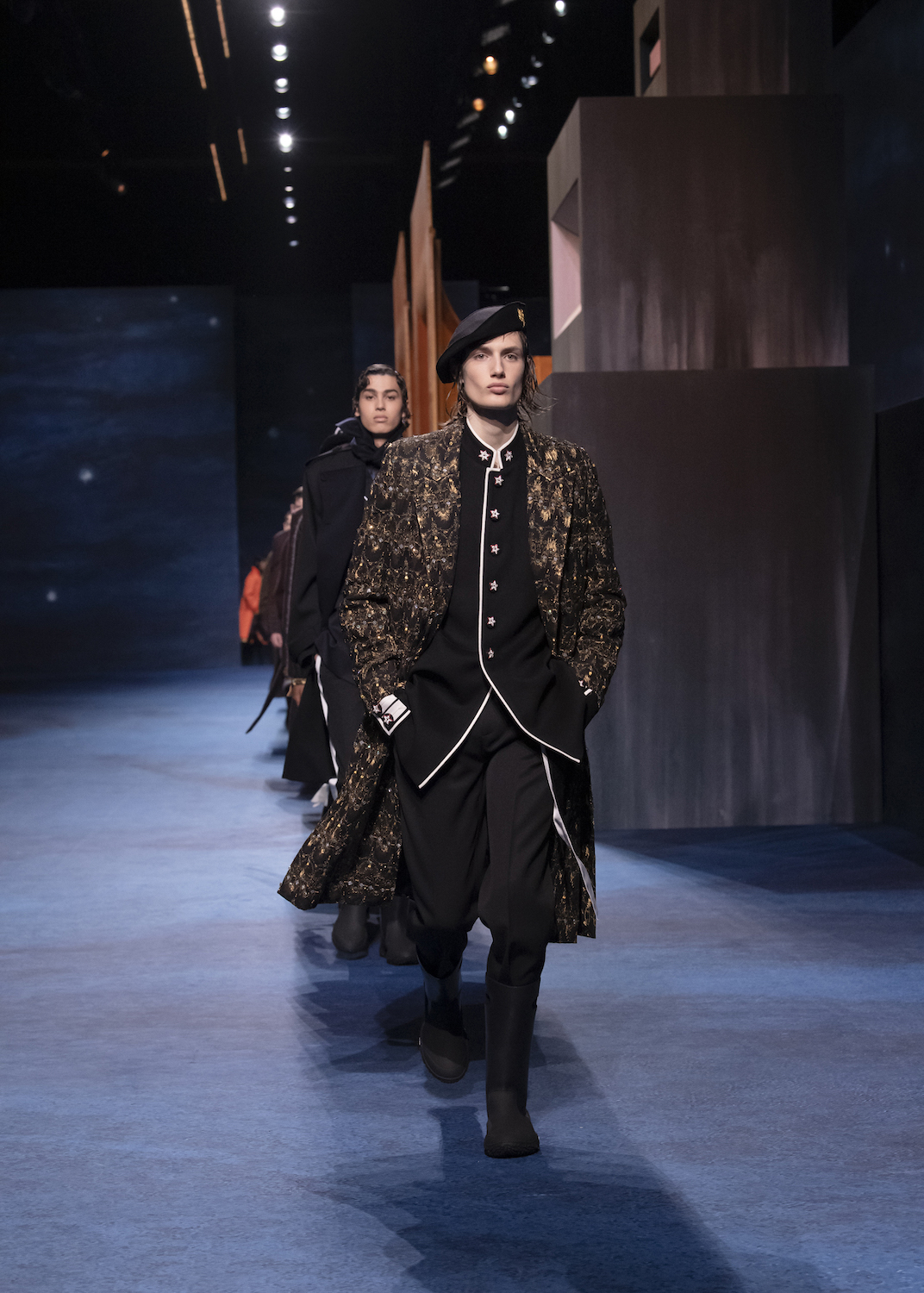 Возвращение к классике мужского гардероба в этом сезоне взял на себя мистер Ким Джонс. Мужской показ Dior открыло золоченое пальто, надетое поверх утилитарной милитари формы. Его вышивка ROSELLA была сделана для вечернего платья haute couture Марком Боханом еще в идеальных шестидесятых. Эта элегантная связь между прошлым и будущим французского дома и парафраз к его архивам, дополненная работами Питера Дойга и его палитрой.