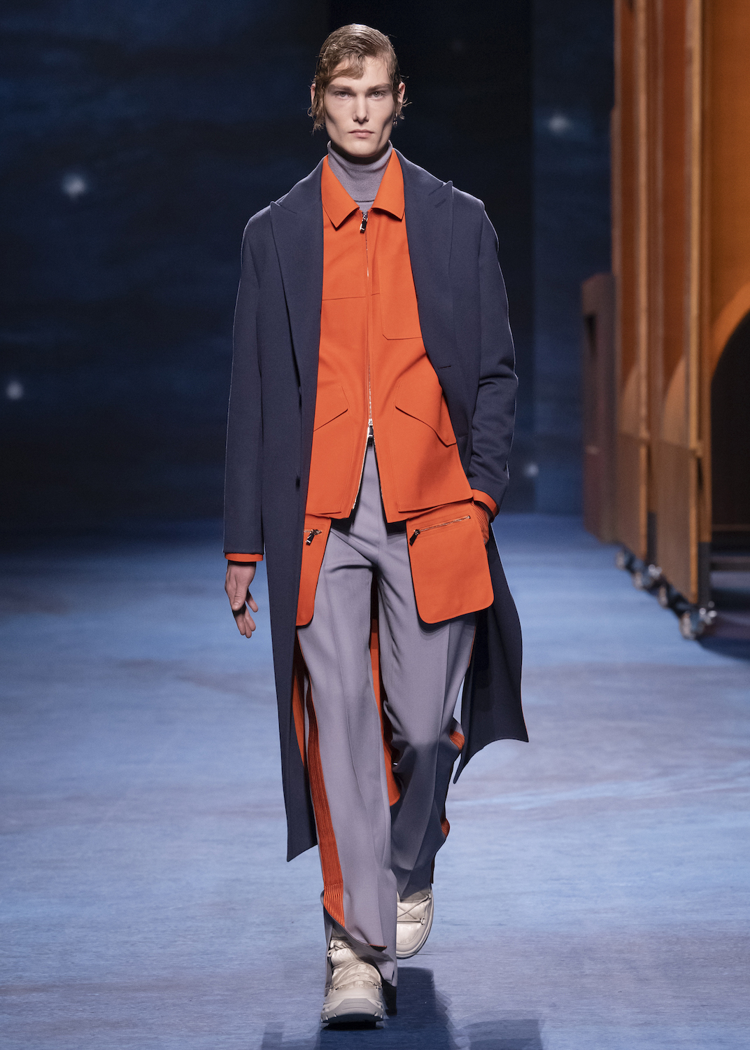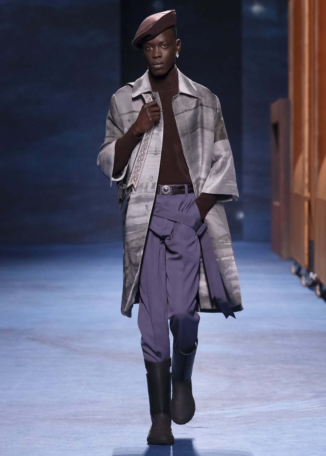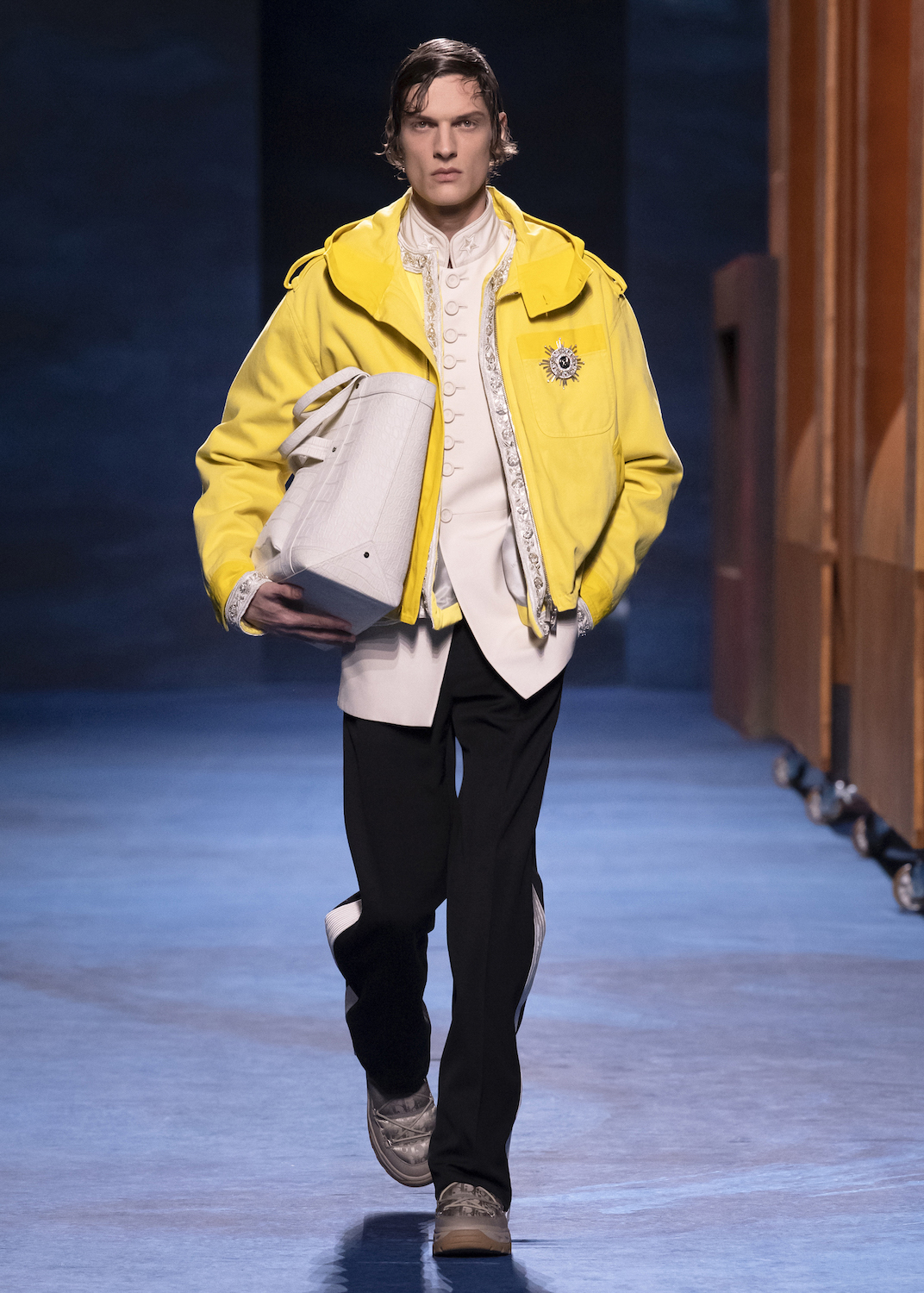 Возвращение к классике мужского гардероба в этом сезоне взял на себя мистер Ким Джонс. Мужской показ Dior открыло золоченое пальто, надетое поверх утилитарной милитари формы. Его вышивка ROSELLA была сделана для вечернего платья haute couture Марком Боханом еще в идеальных шестидесятых. Эта элегантная связь между прошлым и будущим французского дома и парафраз к его архивам, дополненная работами Питера Дойга и его палитрой.
