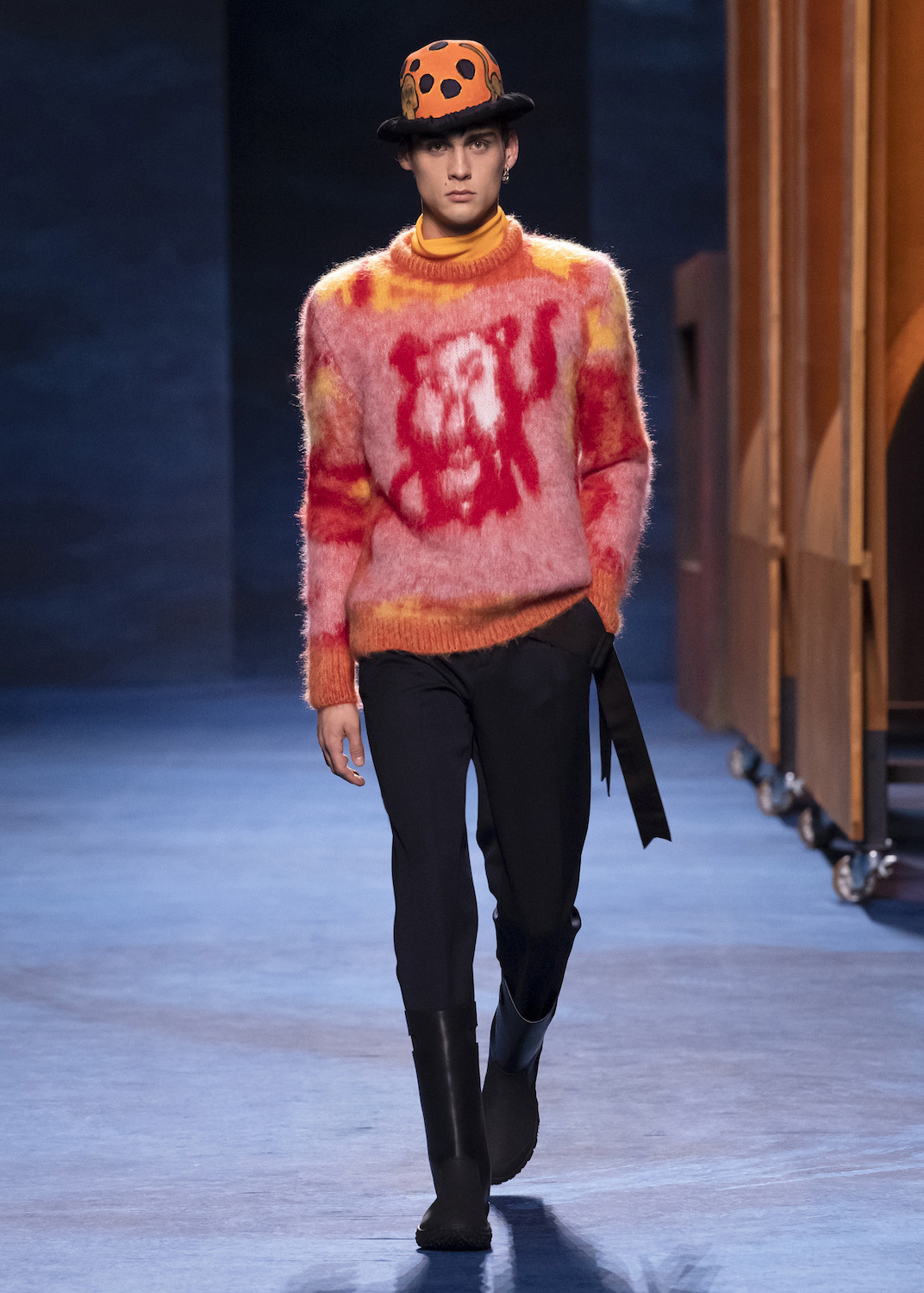 Для новой коллекции Дойг разработал тотальные принты, живописный камуфляж и шляпы с анималистическими сюжетами. А сценография шоу взята из картины SPEAKER/GIRL 2015 года.