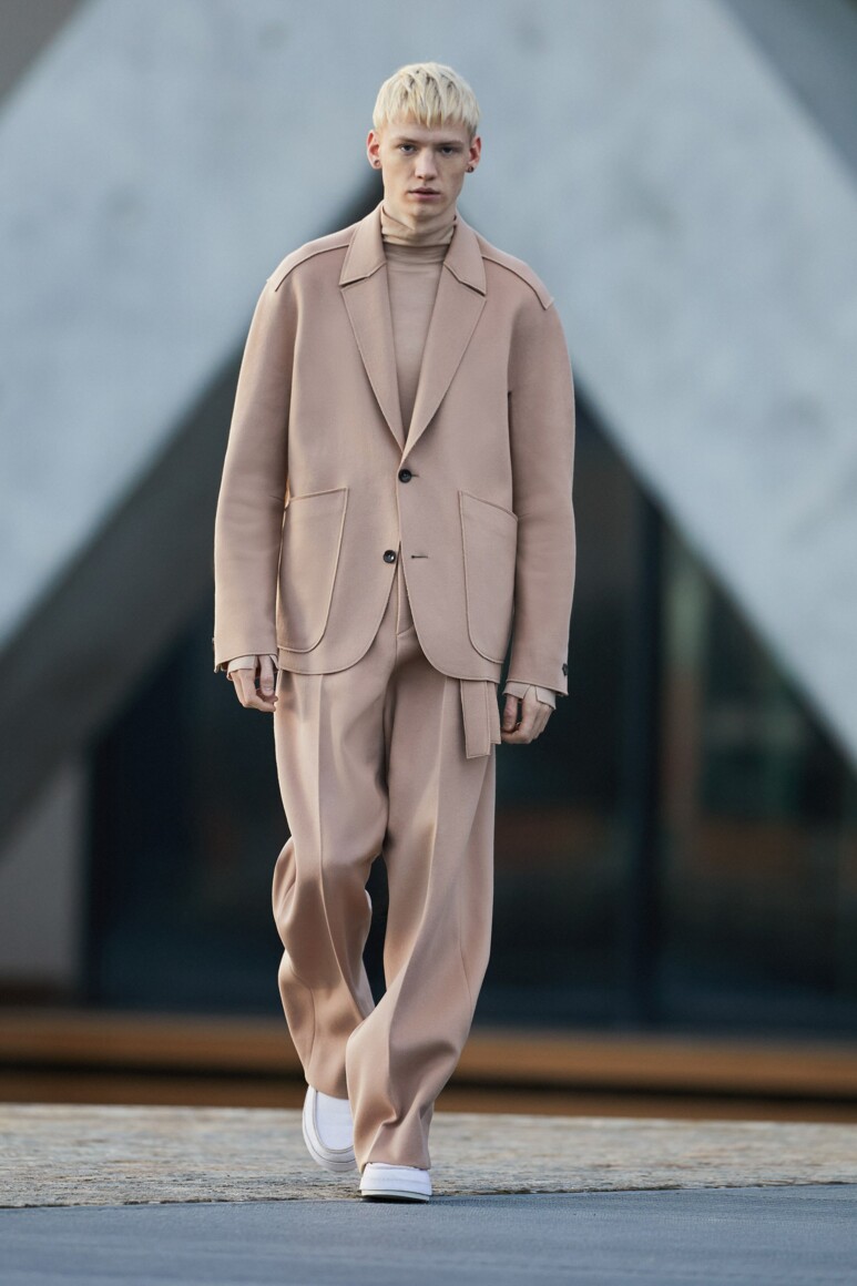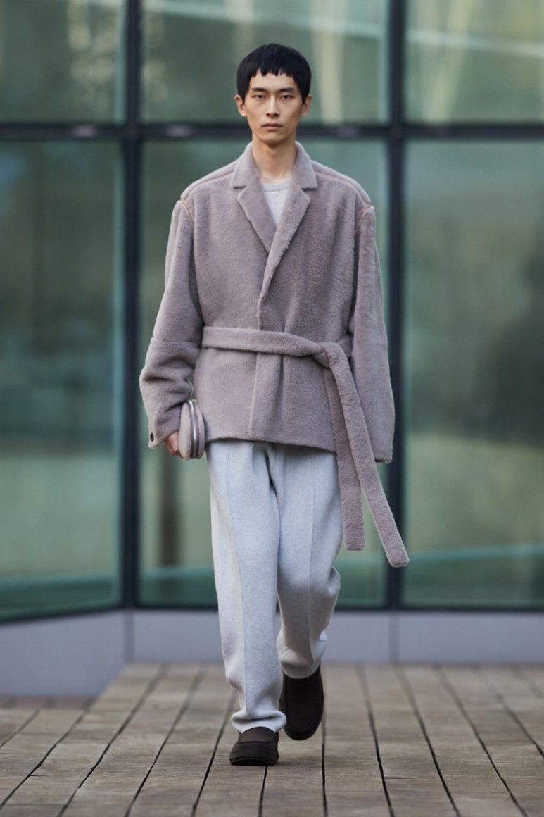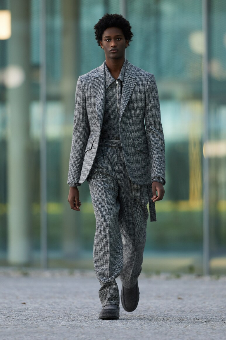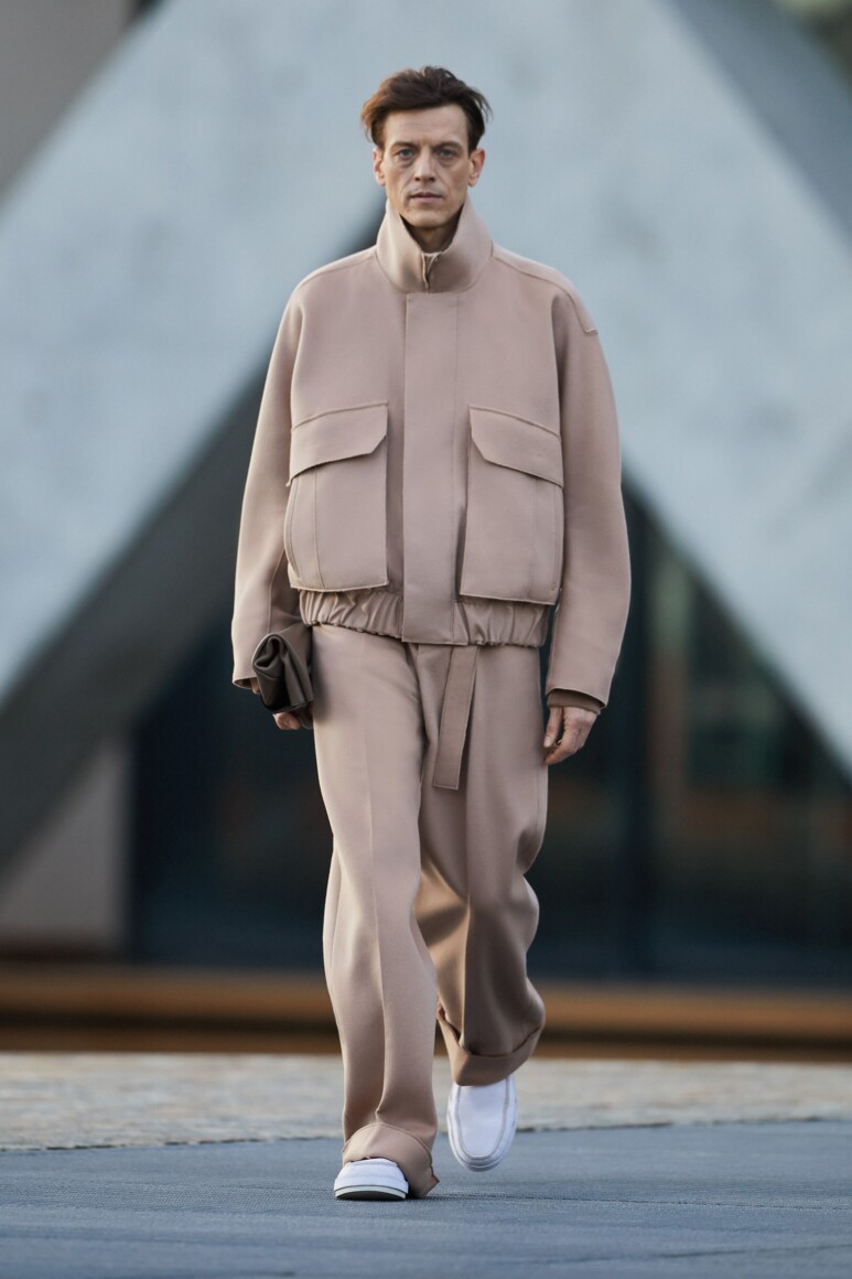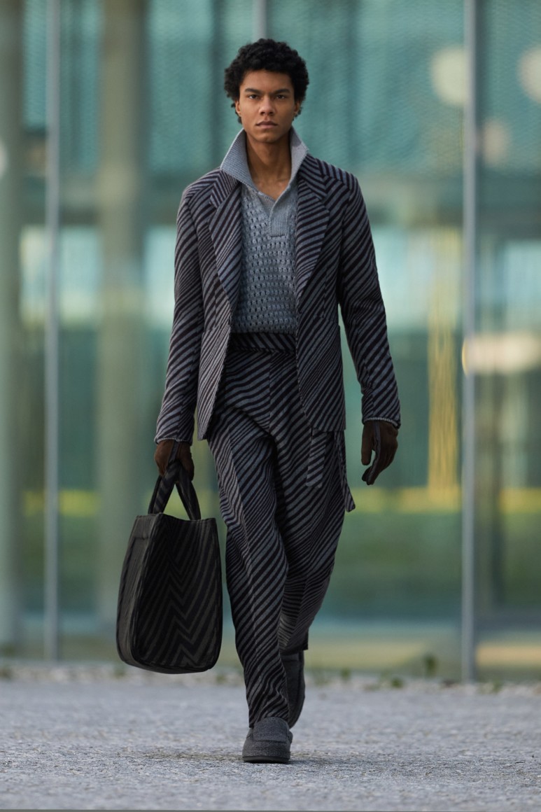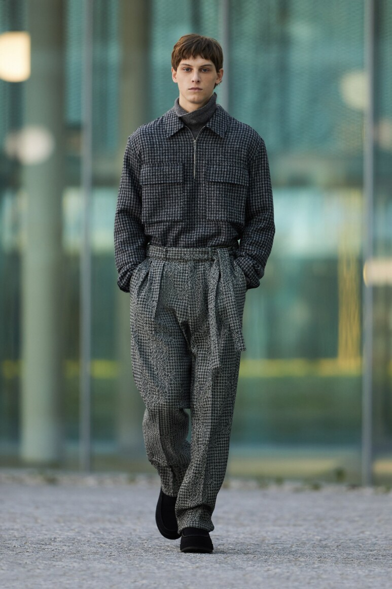 Герои новой коллекции гуляют по главным объектам современного Милана: площади Оливетти, новому кампусу университета Луиджи Боккони и собственной штаб-квартире бренда. Как и архитектурный фон, одежда в новой коллекции хоть и имеет нарочито современные (и почти спортивно-футуристические) формы, но в это же время диктует весьма классические и знакомые нам мотивы Zegna — расслабленные и широкие силуэты, звенящий минимализм в палитре урбанистического Милана. В коллекции использованы открытый бежевый, серый, холодный пудровый, травяной и глубокий голубой. Канонический узор «гусиные лапки» превратился в ландшафтную абстракцию а ритмические полосы на пальто-халате напоминают архитектурный ряд на одном из фасадов кампуса.