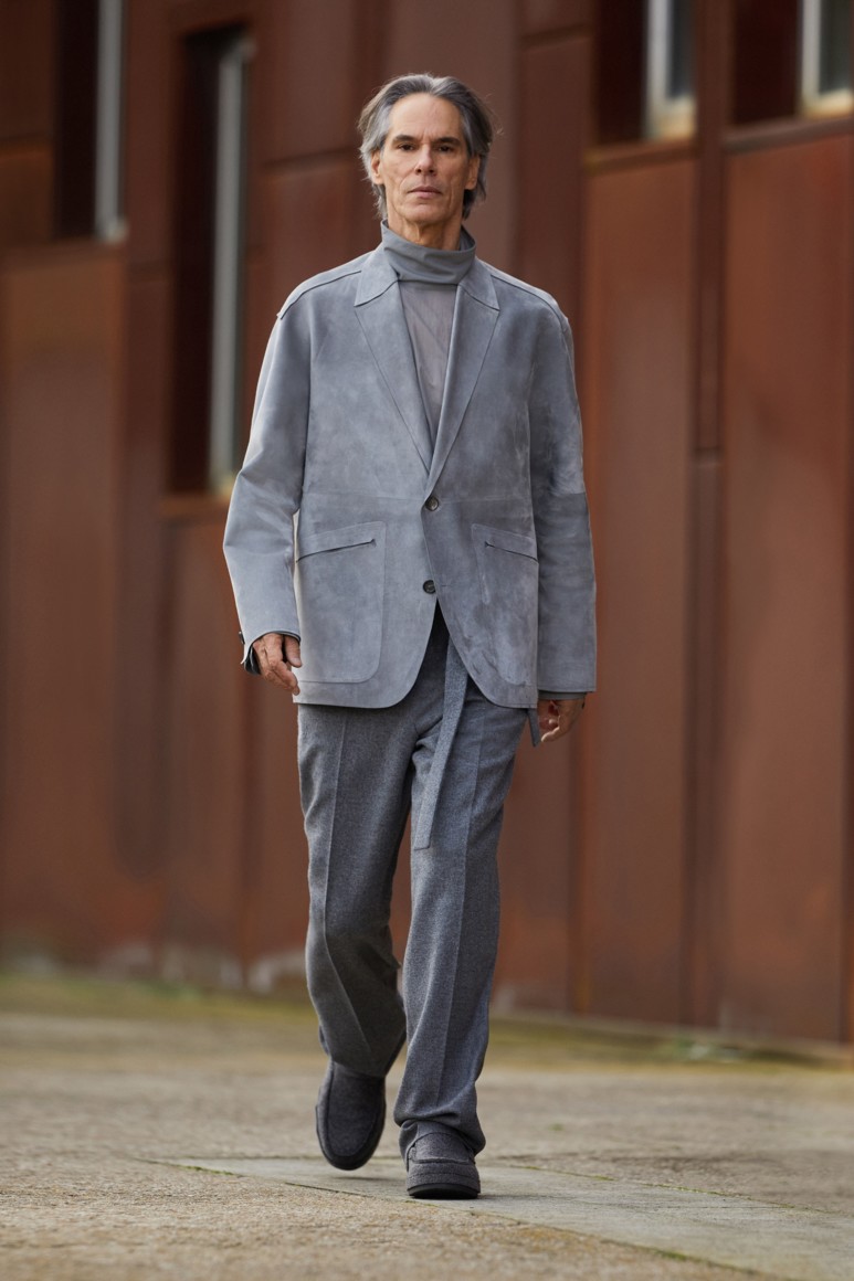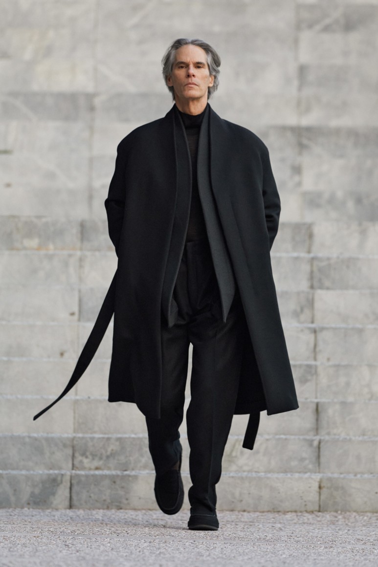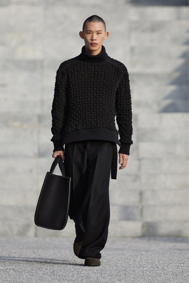 Сартори продолжает осознанный путь бренда. Полосатый жаккардовый шерстяной костюм и пальто, а также многие изделия из кашемирового джерси соответствовали новой политике Zegna: «Использовать существующее», — вещи изготовлены из материалов, восстановленных в процессе производства.