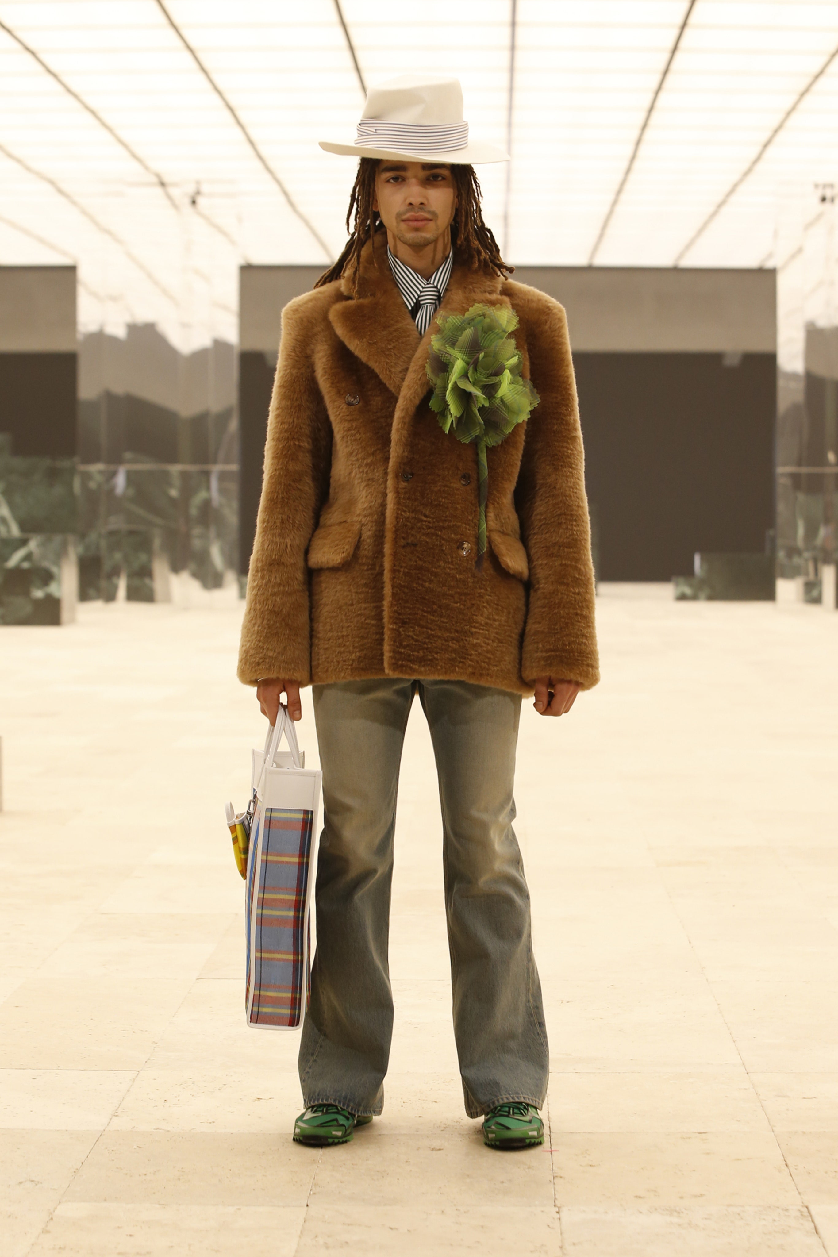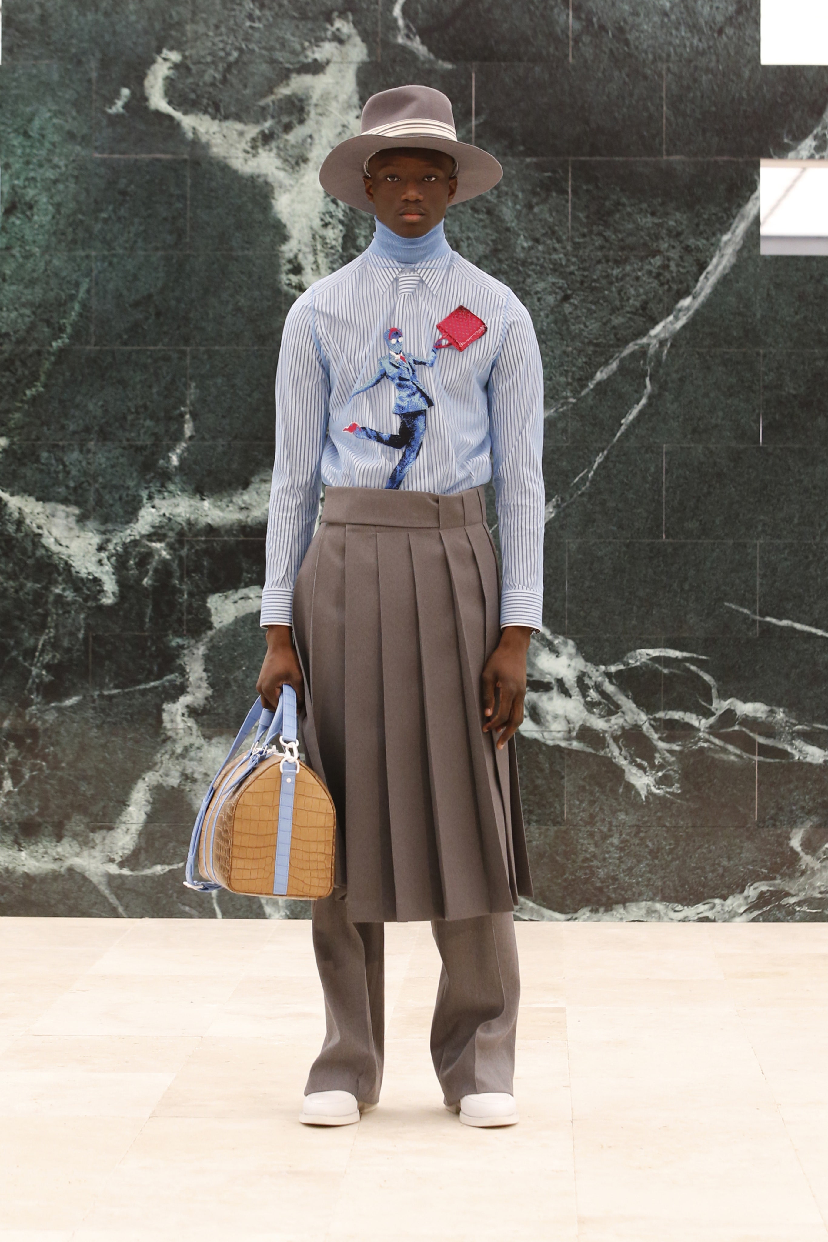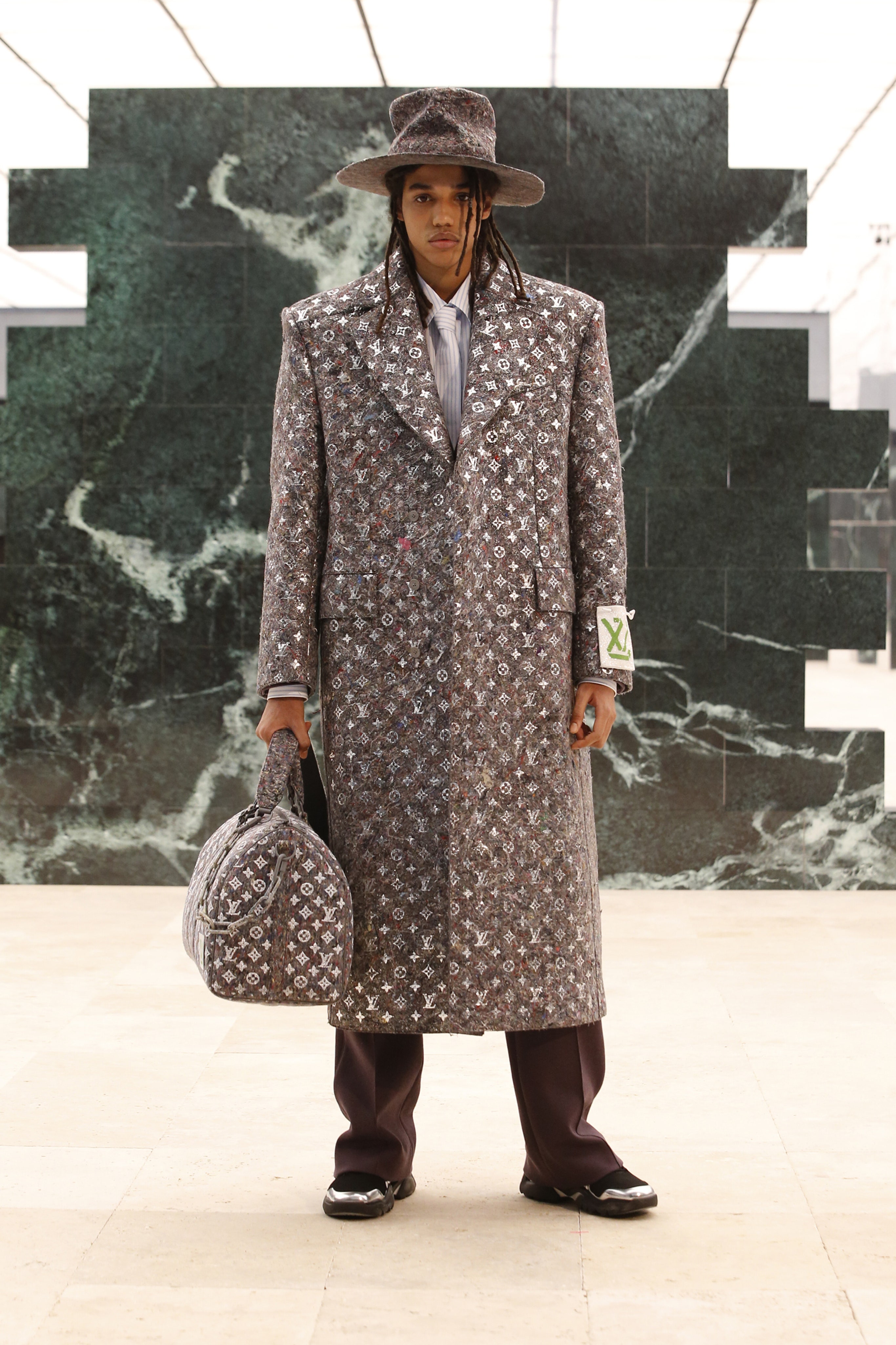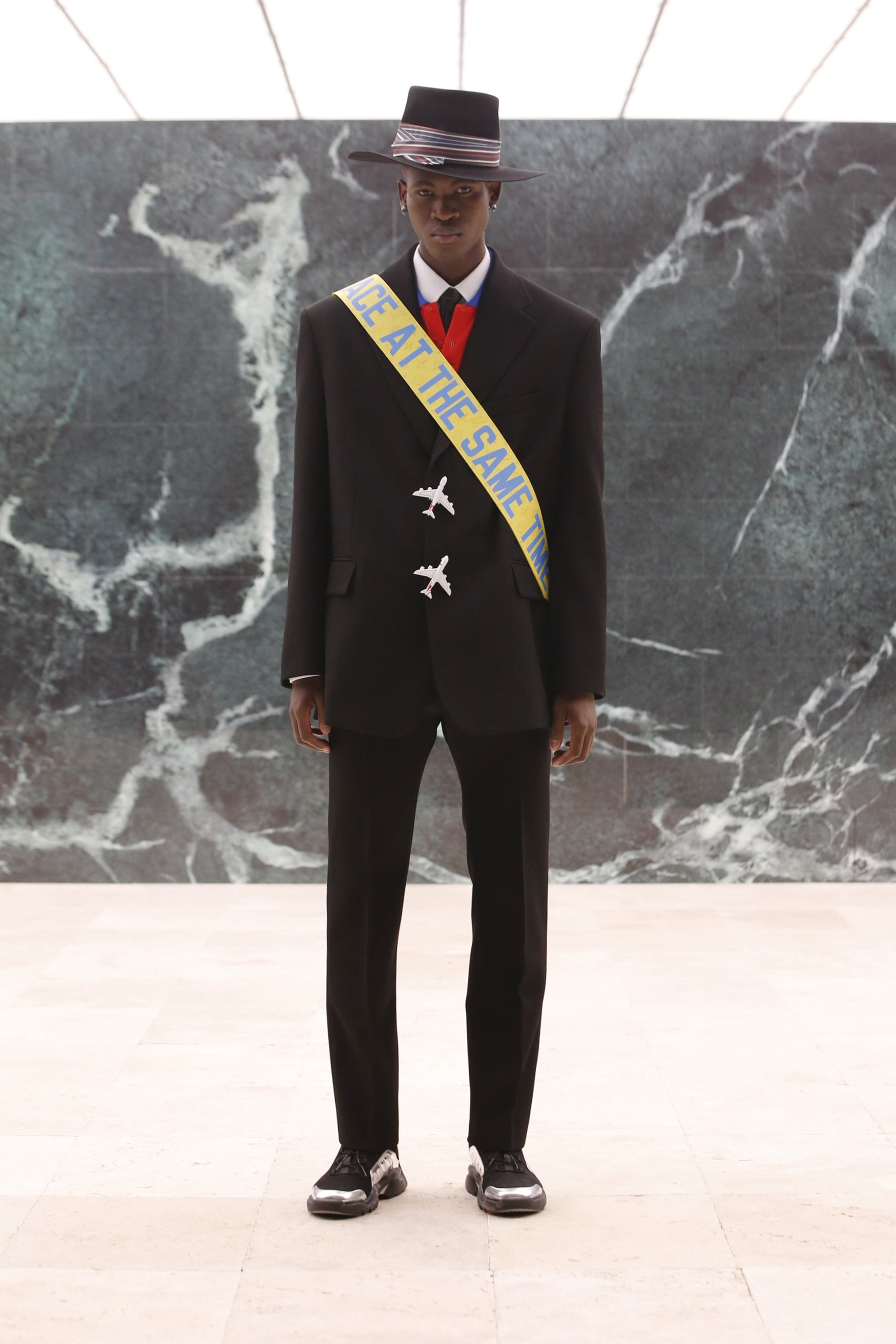 Кроме своей биографии и актуальных запросов общества (в том числе и Black Lives Matter), Абло ставит во главу угла свое личное наследие: так в коллекции возникают традиционные африканские мотивы — одежда из национальной ткани Kente. Также дизайнер обратил внимание на уже знакомый нам ранее тейлоринг — острые силуэты костюмов, широкие и более чем длинные пальто и плащи и, конечно, шляпы. Головные уборы вообще стали важной чертой новой коллекции Абло, ибо именно такие, и никакие другие, — мятые и невозможно широкополые федоры точно характеризуют выбранное Вирджилом Абло направление.