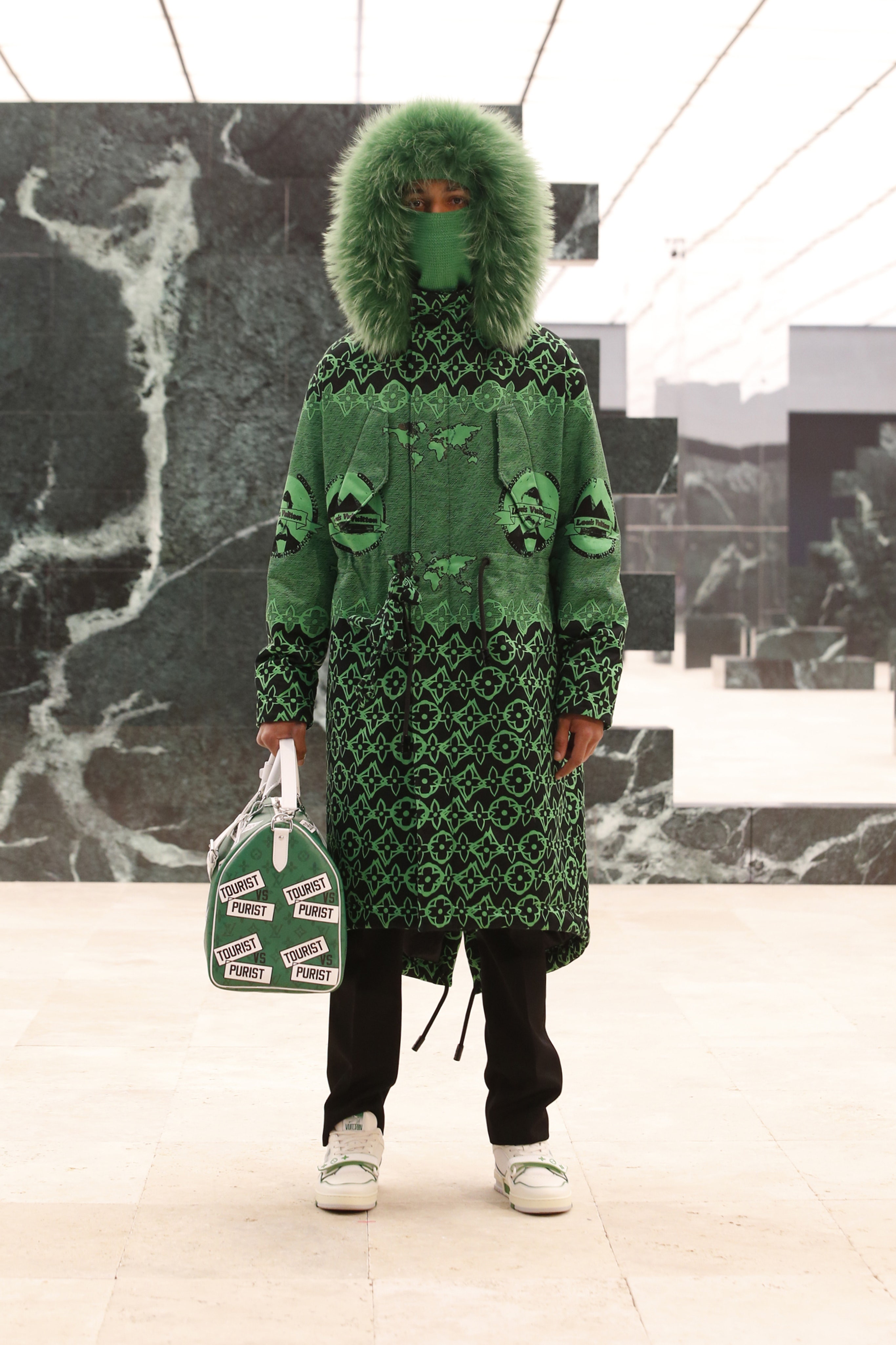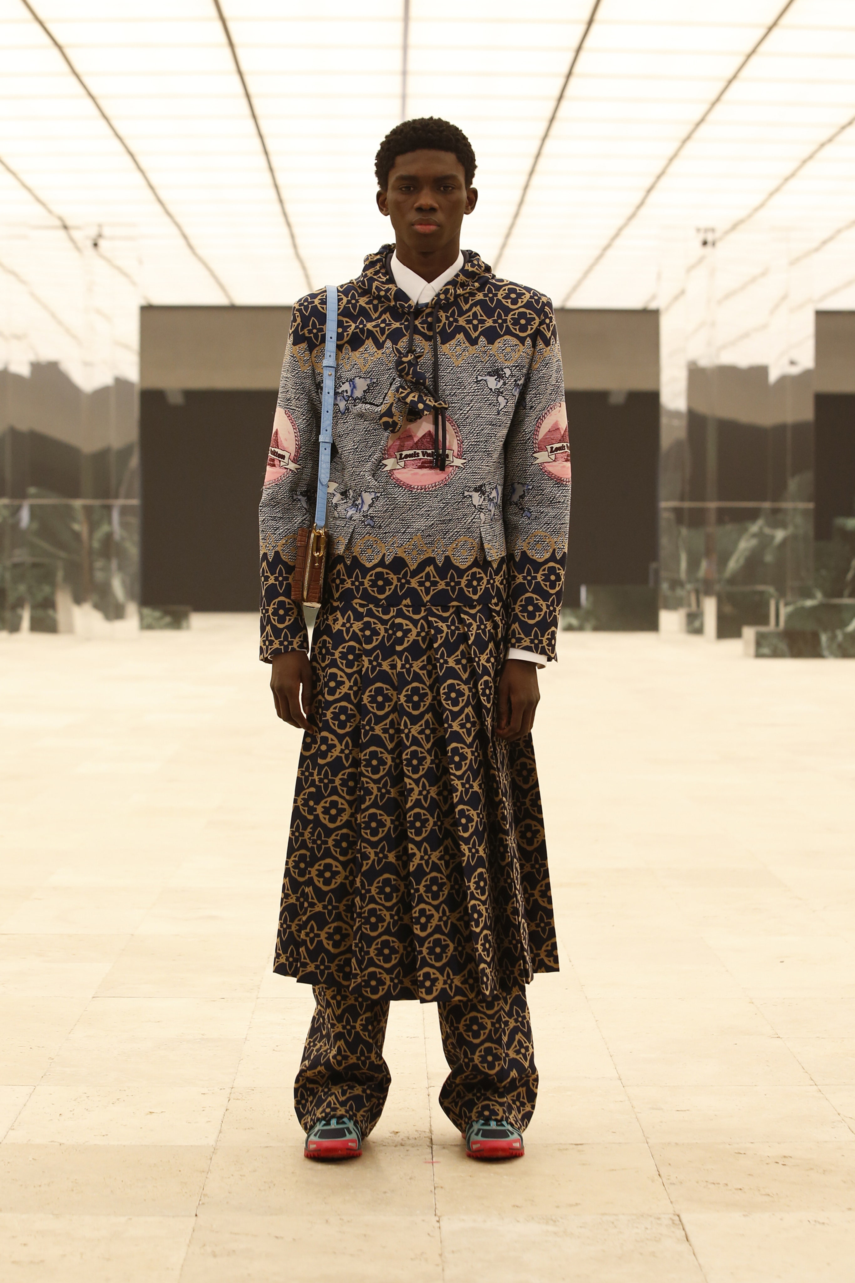 Свою шестую работу для Louis Vuitton Вирджил Абло назвал Ebonics. Новую коллекцию Абло для французского Дома — это грандиозное автобиографическое полотно. На нем дизайнер очертил пути своих мытарств и оставил место для каждого из пазлов своих высказываний. Вирждил выделил 9 мужских типажей, в каждом из которых он побывал: писатель, художник, скиталец, отец, продавец, отельер, галерист, архитектор и сам Абло (в настоящее время — темнокожий мужчина на пике своей карьеры в центре старой Европы). Шоу началось с острых социальных призывов Саула Уильямса и Каея Исайей Джамала:
