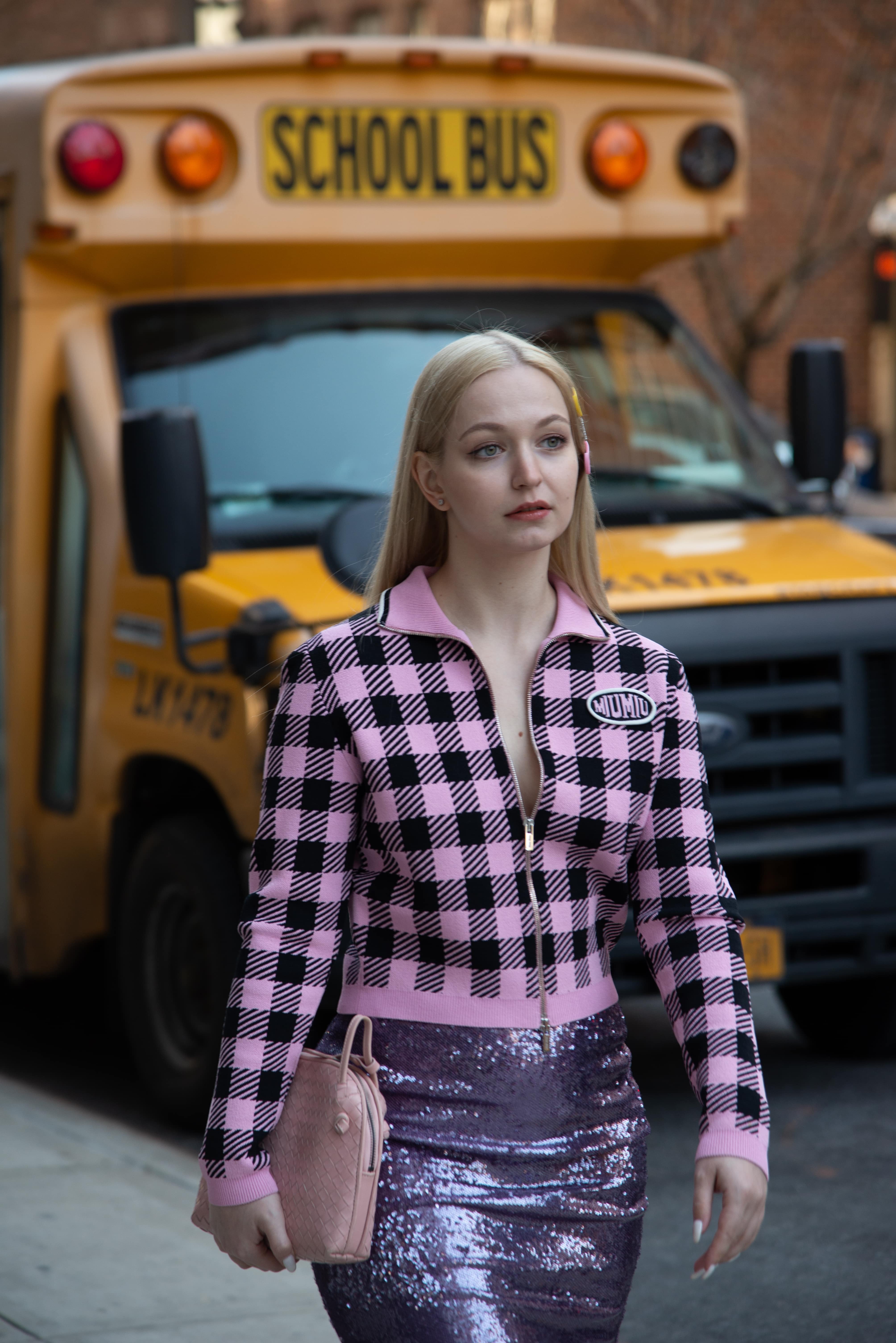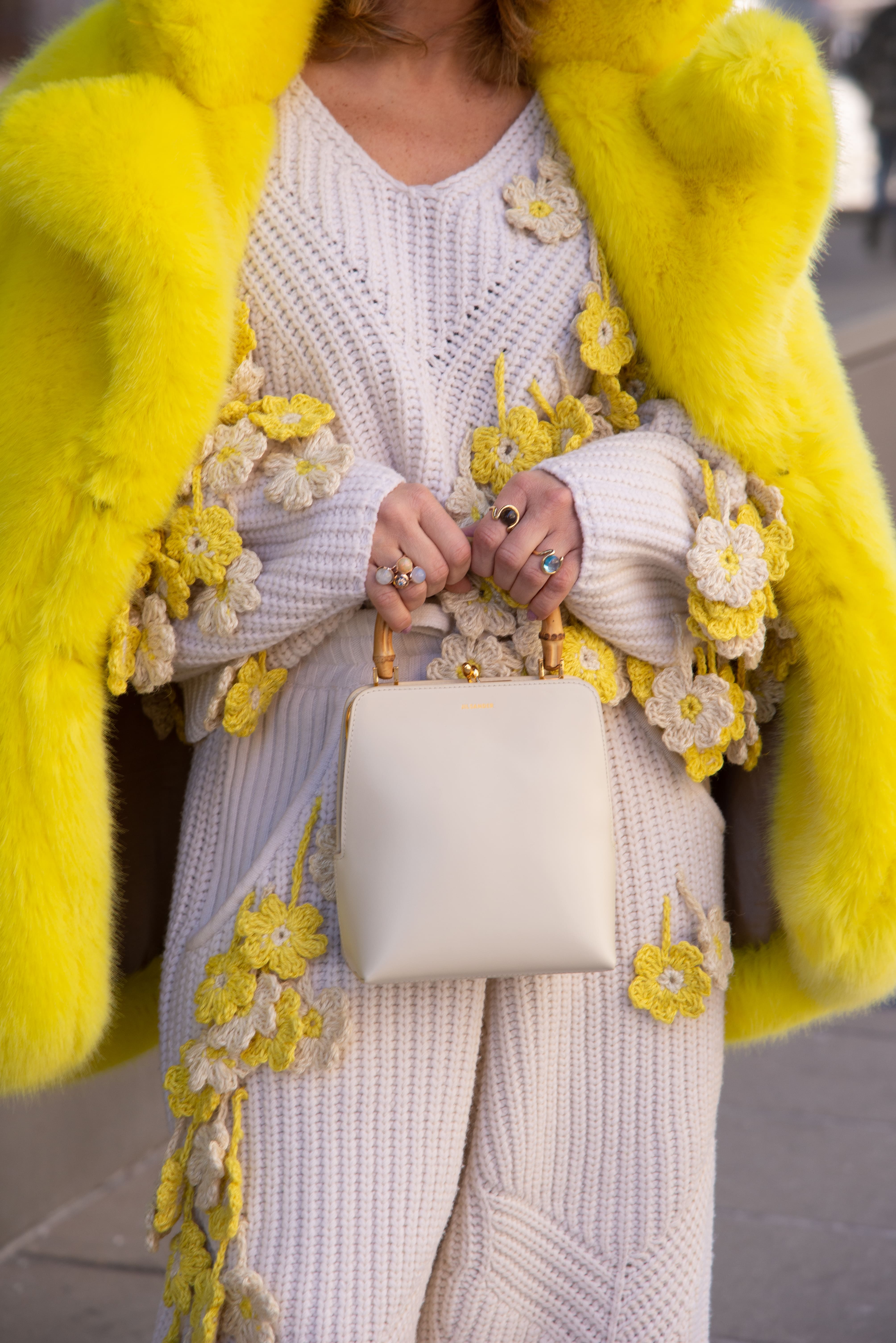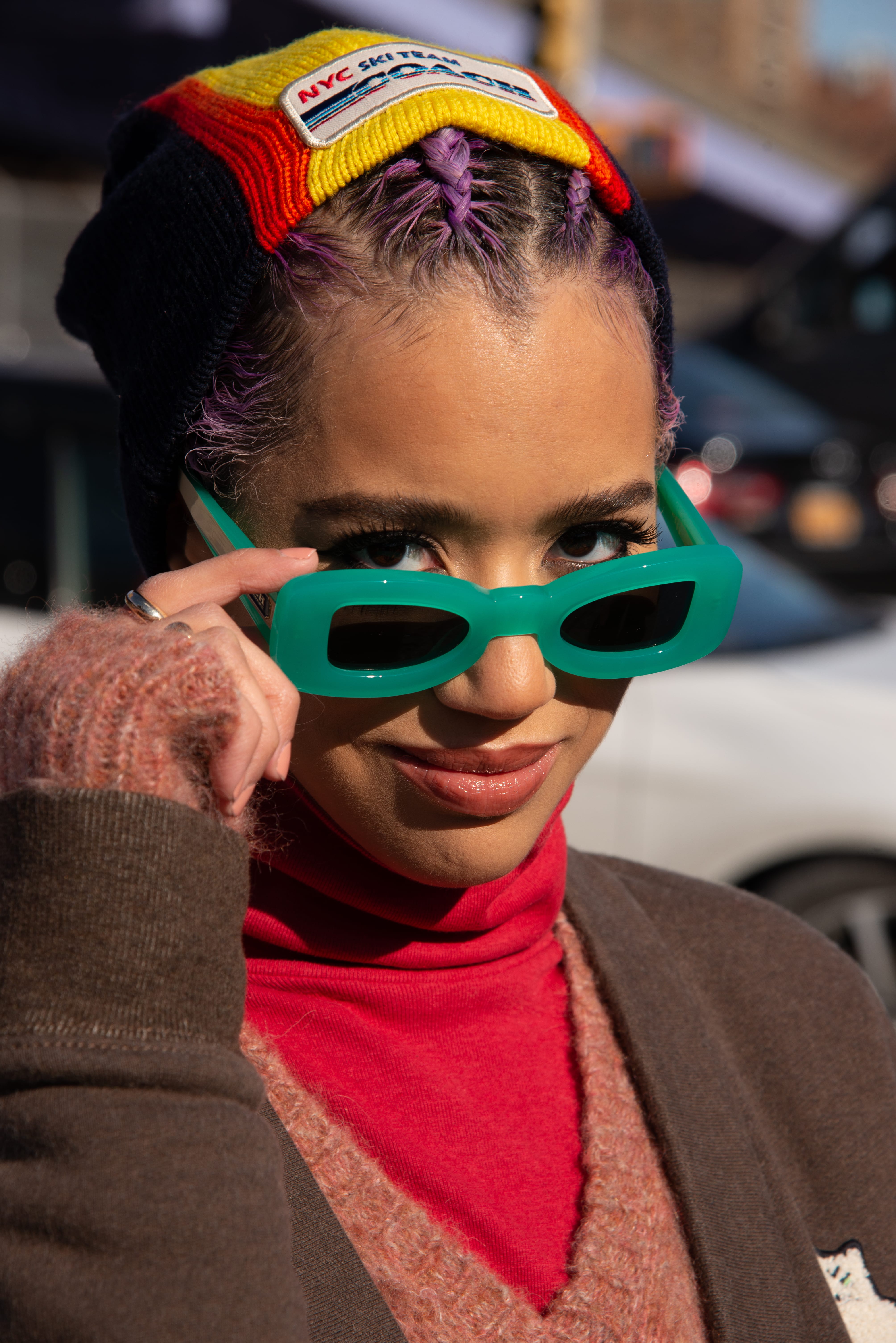 Романтические рюши и винтажные силуэты нью-йоркские модники умело комбинируют со спортивными олимпийками в колорблоках и пушистыми экошубами. Среди аксессуаров фотографу Оле Миу и прохожим встречались очки в ярких пластиковых оправах на манер стилистики диско, яркие меховые панамы и сентиментальные заколки в духе 90-х.